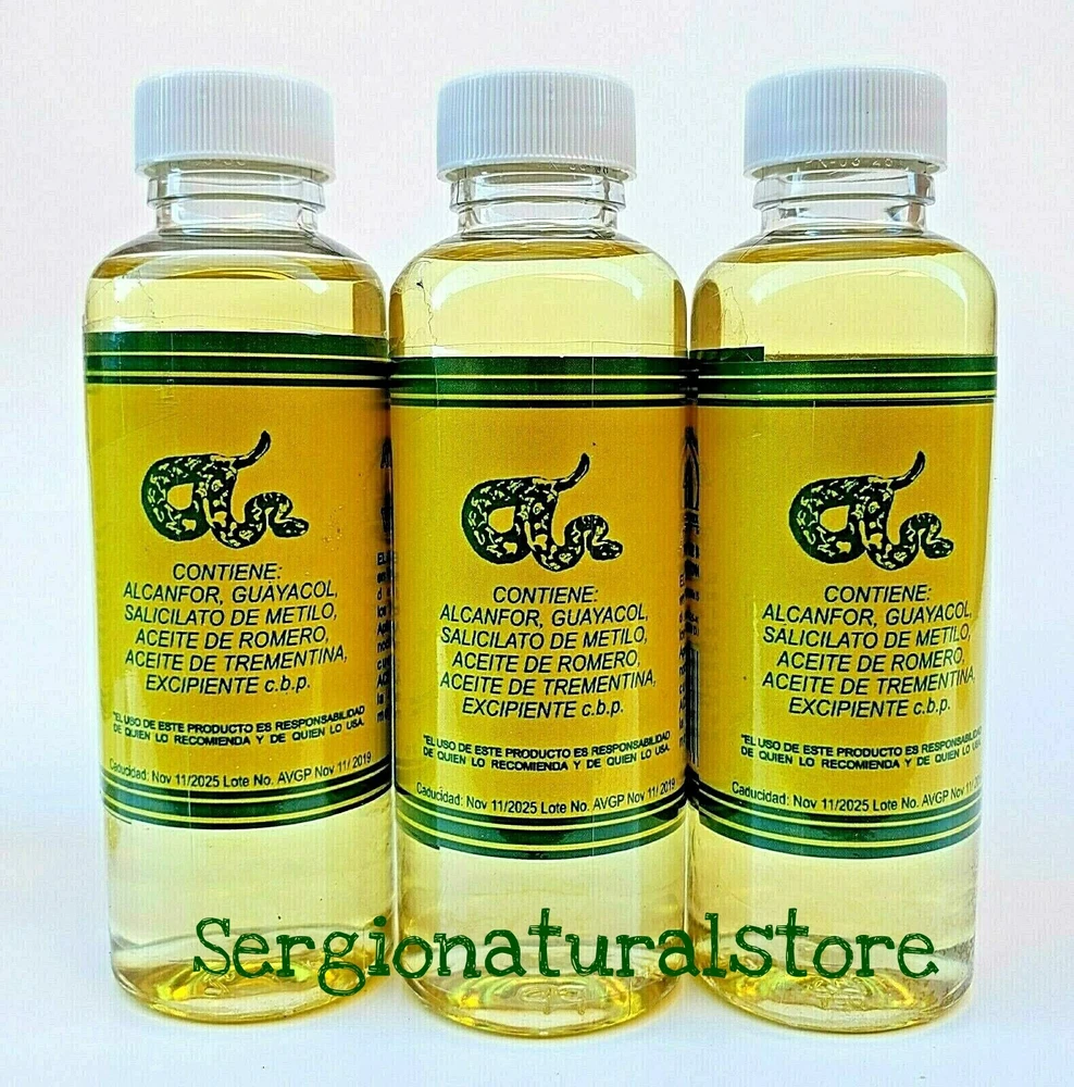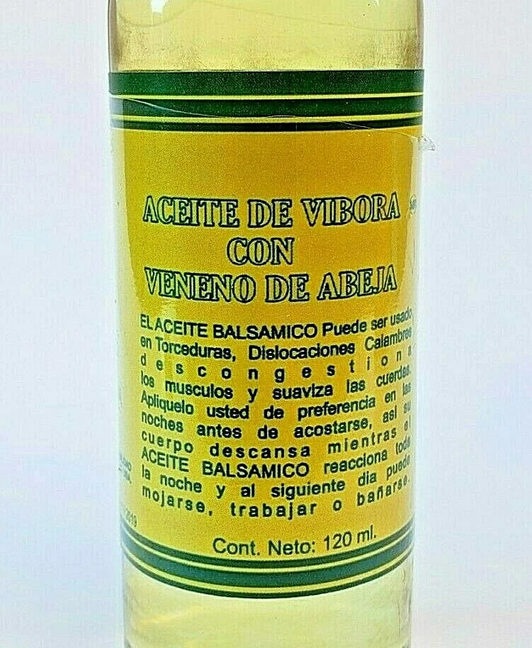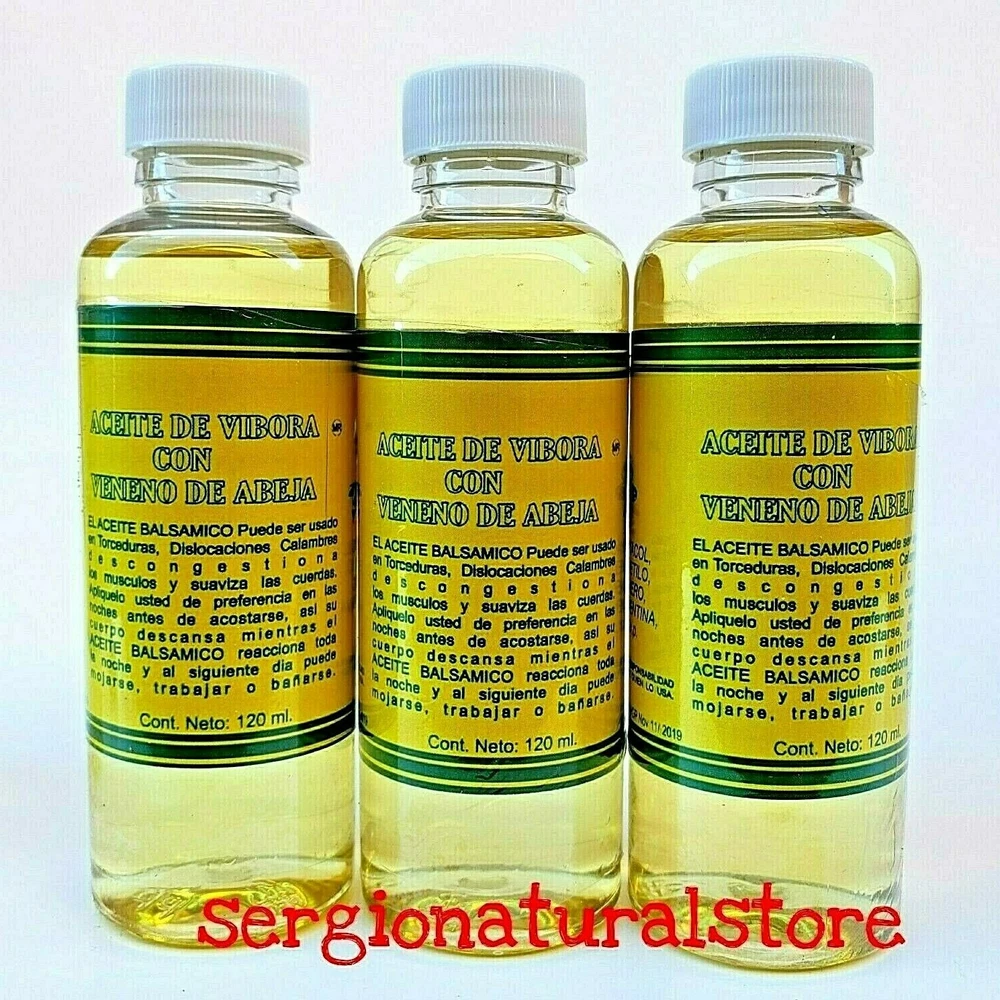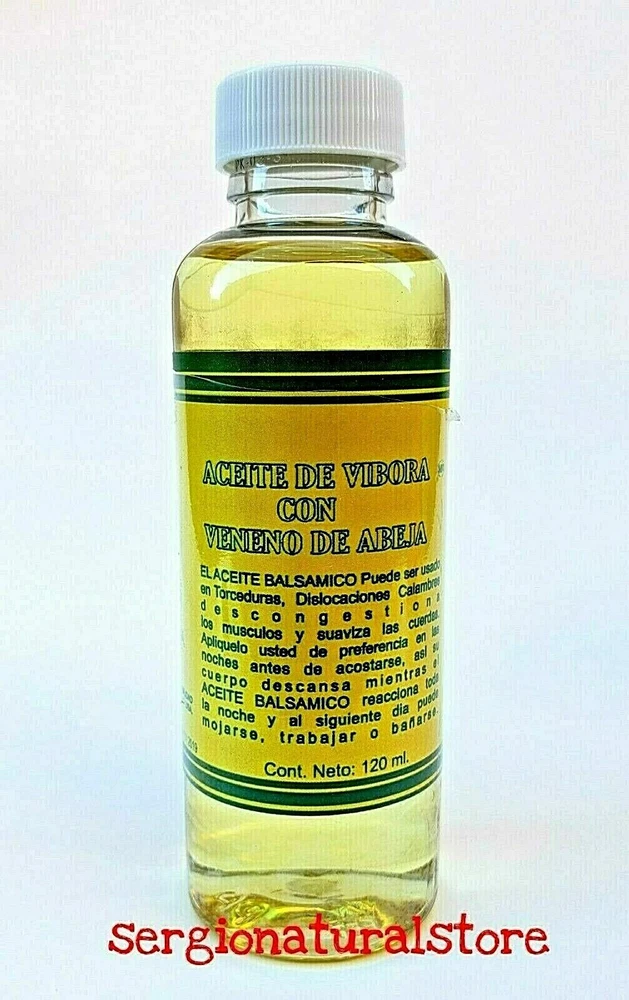 (3 Packs) Vibora Oil with Bee Venom Oil 120 ml. c/u Support Sprains Support Dislocation Support Cramps Vibora Oil & Bee Venom Oil: Apply a generous portion to the affected area every night. Suggested Use Snake Oil Bee Venom Ointment : Apply generously and gently massage into painful area until the product disappears. 100% Original Product Thank you for your support and preference, I invite you to see my other sales items. Buy with confidence !!You shipments is 100% Guaranteed!! (3 Packs) Aceite de Vibora con Veneno de Abeja Aceite 120 ml. c/u Soporte Esguinces Soporte Dislocacion Soporte Calambres Aceite de Vibora Veneno de Abeja: Aplicar una generosa porción en la área afectada todas las noche. Uso sugerido de Aceite de Vibora y Veneno de Abeja: Aplique generosamente y masajee suavemente en el área adolorida hasta que el producto desaparezca. Producto 100% Original Muchas Gracias por su apoyo y preferencia, lo invito a mirar mis otros artículos de venta. Compre con confianza !!Su envío es 100% Garantizado!!