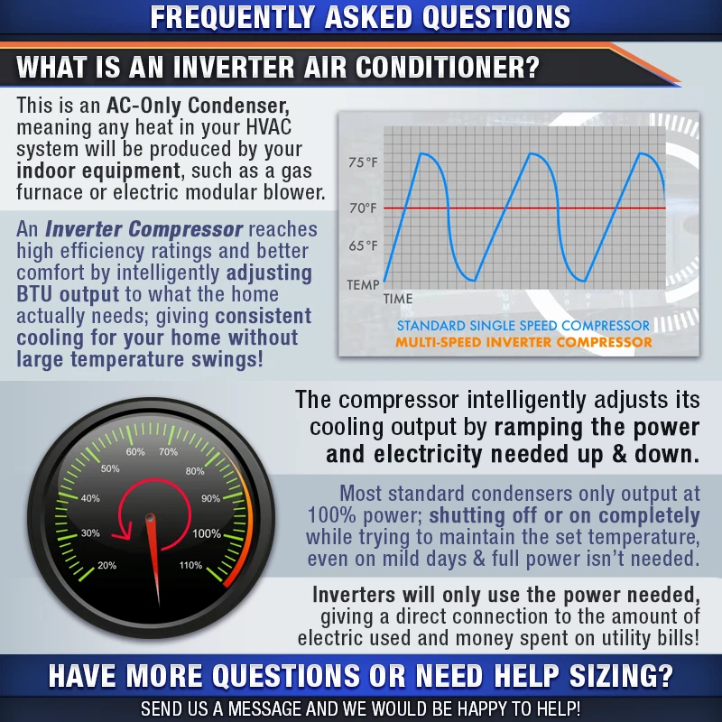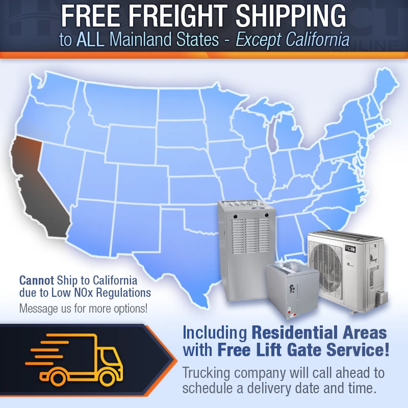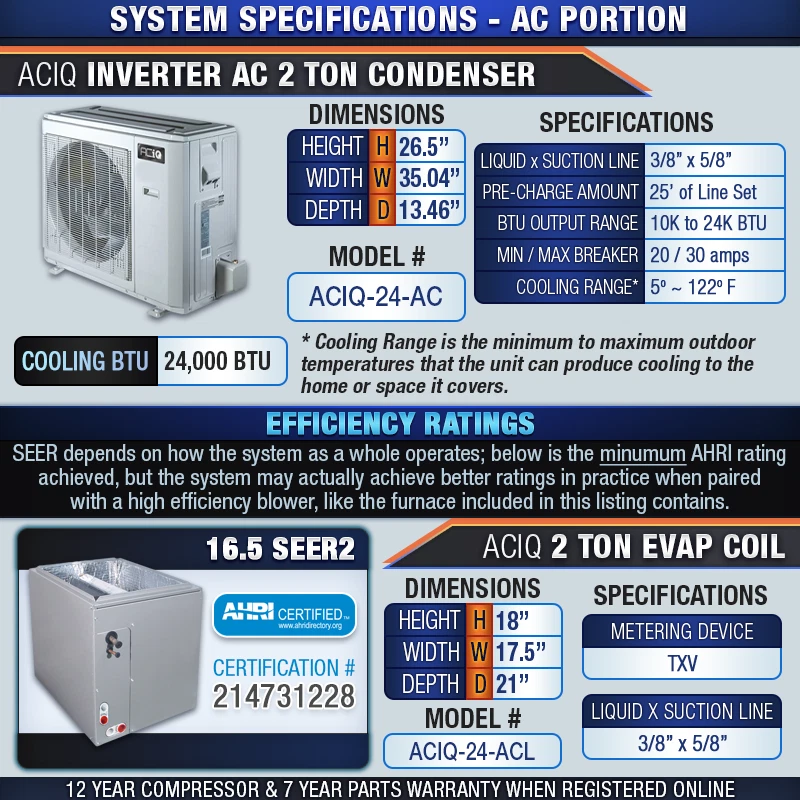 Powered by Frooition View Feedback Contact Us All Items See our eBay store for more great items >> Shop Categories PTAC Units AC & Furnace Systems Air Conditioner Split Systems AC and Coil Systems Air Conditioner Condensers Heat Pump Condensers Heat Pump Split Systems Packaged & Rooftop Units Air Handlers Furnaces Unit Heaters DIY Mini-Split Systems Single Zone Mini-Split Systems Dual Zone Mini-Split Systems Tri Zone Mini-Split Systems Quad Zone Mini-Split Systems Five Zone Mini-Split Systems Fireplaces & Outdoor Gas Logs and Fireplaces Stoves Mobile Home HVAC Units PTAC Units Scratch & Dents Accessories Line Sets LP Conversion Kits Air Cleaners Repair Parts 2 Ton 66,000 BTU 80% Central Inverter AC & Gas Furnace Split System - 16.5 SEER2 Item Description FREE SHIPPING - Great Pricing Backed by the most knowledgeable staff in the business: We know HVAC so you don't have to. CENTRAL AIR + SMART INVERTER TECH = EASY TO INSTALL HIGH EFFICIENCY UPGRADE!! 2 Ton 16.5 SEER2 / 66,000 BTU 80% AFUE / Multi-Positional AC & Gas System ACiQ Unitary Air Conditioning Condenser, Evaporator Coil, & Gas Furnace These condensers may look different from a standard outdoor unit, however, they are compatible with standard split systems using traditional ductwork and can be used as a drop-in replacement! Not only do these AC units boast a sleek design with a compact build, they also utilize inverter technology typically seen in mini-splits; boosting both efficiency and performance - Welcome to the Future of HVAC! We have paired this high-efficiency cooling system with a top-rated gas furnace for the perfect home comfort package. ACiQ furnaces are manufactured in the same factory and at the same specs with the same warranty as other name-brands. You're getting the same great quality for less. (Think of it like buying a car: Chevy vs. GM...) Efficient, money-saving cooling & heating for homes and small businesses!! High-efficiency energy ratings Low, whole sale pricing Free Shipping Sales support until 10 p.m. EST weekdays and 4 p.m. Saturdays! Bundle Model Numbers: ACiQ-24-AC / N80MSN0701712A / ACIQ-24-ACL / MSK001 / LS38343830 / TWR186 / CT101WA / HW-600 CONDENSER OVERVIEW Inverter condenser - Inverter technology changes AC power to DC, allowing the compressor inside your condenser to speed up and slow down. This allows the system to self-adjust BTU output based on demand. As the weather changes, so will your system output. Learning system - This system is packed with sensors and controls air temperature inside and outside, system performance, refrigerant temperature. The first time you start your system it enters a learning mode keeping air moving across the sensors and storing information so future startups and run cycles will be at max efficiency. Size for cooling - The self-adjusting inverter design allows you to size your system based on demand. The ACiQ Inverter Condensers automatically adjusts to run like a 1 ton to keep you cool and dry. QUICK FACTS 10,000 BTU to 24,000 BTU variable output based on demand Inverter air conditioner system for use with ductwork Efficient cooling from 5°F to 122°F outdoor temperatures Durable Gold Fin condenser coil coating Quiet operation at even the highest workloads 24,000 BTU, 16.5 SEER2 With an efficiency rating of 16.5 SEER2 , the variable output ACiQ-24-AC will keep you comfortable across a wide range of conditions. For cooling, this system can operate anywhere from 10,000 BTU to 24,000 BTU without short cycling - this increased range means it fits more possible applications. Quality Construction, Highest Efficiencies State-of-the-Art manufacturing is behind every ACiQ product, resulting in quiet, effective operation over a long service life. ACiQ saves you money up front, but also over time by reducing energy bills. Every ACiQ condenser features a variable inverter twin rotary compressor, lowering wear and increasing performance. Compare specs against other brands in the same price category, and you will agree, ACiQ is the best value. Longer Life, Longer Warranty Intelligent design goes into every element of ACiQ's manufacturing ensuring flawless performance for years. Low friction, variable inverter twin rotary compressors give bulletproof reliability. Register equipment with the manufacturer for extended warranty protection -- 7 years on parts and 12 years on the compressor. 2 Ton 16.5 SEER ACiQ High Efficiency Air Conditioner Condenser | Inverter SKU ACiQ-24-AC Refrigerant Charge 25' of Line Set Weight (in lbs) 109.130000 Brand/Manufacturer ACiQ Cooling BTU 24000 BTU Decibel Level (dBA) 61.5 dB Refrigerant R410A SEER2 (Whole Season Efficiency) 16.5 EER2 (Efficiency at 95°F Only) 11.4 Compressor Type Twin Rotary Liquid Line 3/8" Suction Line 5/8" Electrical 208/230V 1 Phase 60 Hz Max Breaker Size 30 Amps Min. Breaker Size 20 Amps Tonnage 2 Ton BTU/Tonnage 24,000 BTU/2 Ton Min/Max Outdoor Temp for Cooling 5 ~ 122 °F Operating Mode Cooling Height 26.5" Width 35.04" Depth 13.46" Warranty 12 Year Compressor / 7 Year Parts with Online Registration Furnace OVERVIEW The ACiQ N80MSN0701712A is an inexpensive model of furnace to provide reasonable comfort to your home. At a basic efficiency, this furnace will heat your home adequately with the right output, providing comfort to your home even in the coldest parts of the year QUICK FACTS 66,000 BTU, 80% AFUE natural gas furnace Generally suitable for a small to medium sized house in ideal applications Multi-positional design - can be installed in the upflow, downflow, or horizontal orientations Single stage burner with a multi-speed blower Field-convertible to propane with an optional LP kit On board self-diagnostics 66,000 BTU, 80% AFUE The ACiQ N80MSN0701712A has an input of 66,000 BTU, and an output of 54,000 BTU. The 80% AFUE means that for the gas going into the furnace, 80% of it is used to heat your home while the remaining 20% is lost out the flue piping and lost to normal furnace operations. All 80% furnaces re