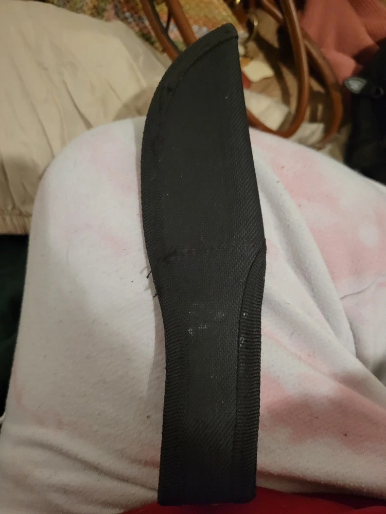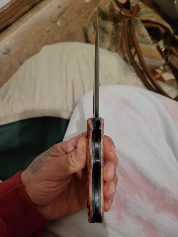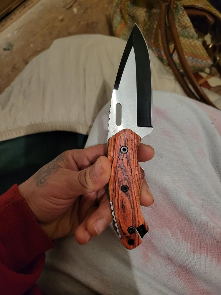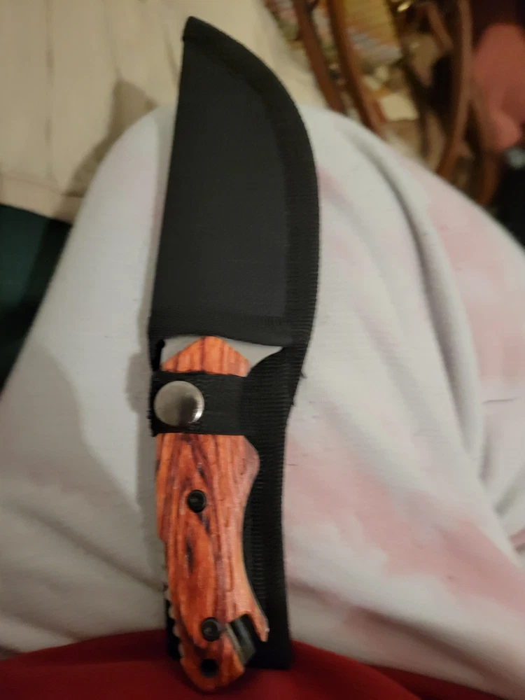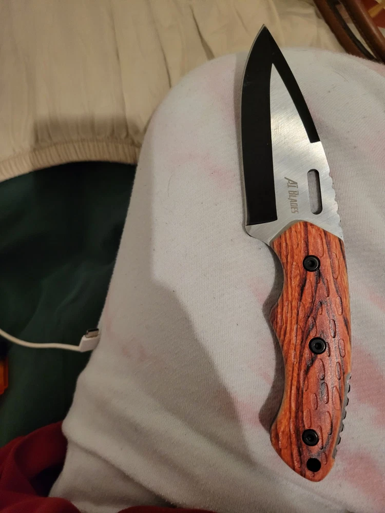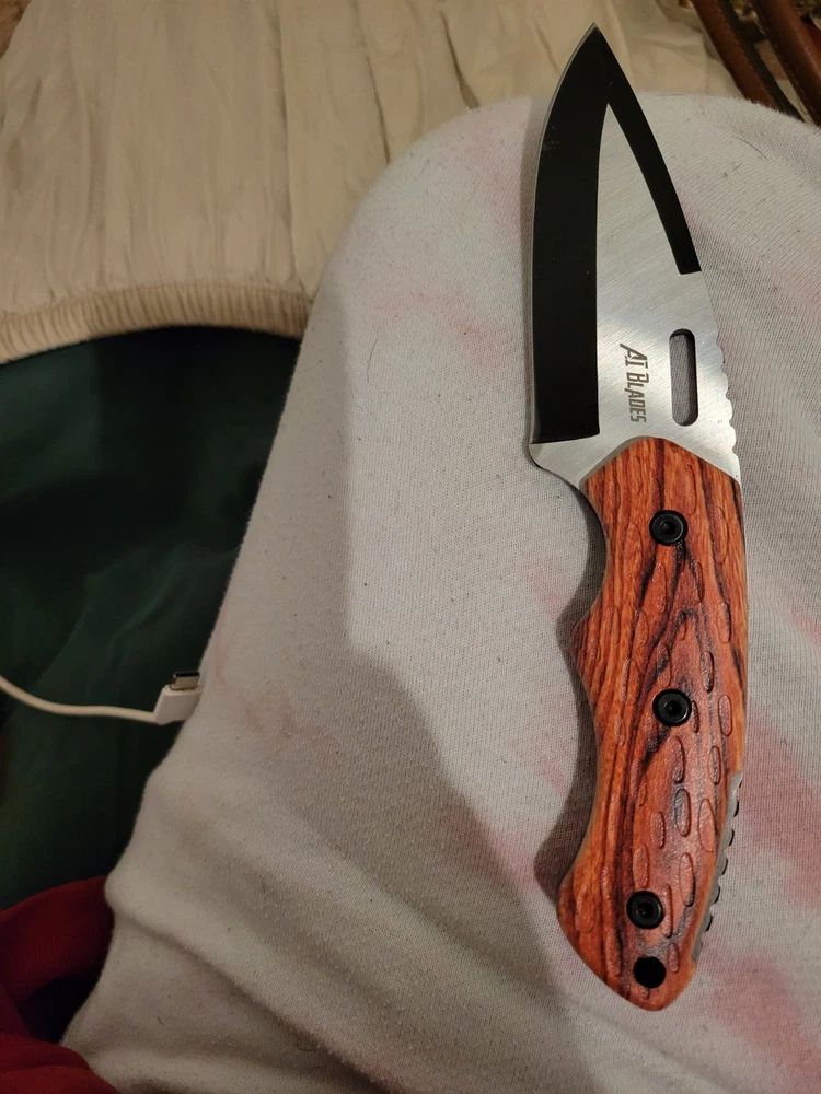 The AI Knives Custom Handmade Damascus Steel Hunting Knife features a full tang and a 5in. spear point blade with a combination edge. The handle is made of rosewood, and the blade color is stainless steel/black. This ambidextrous knife includes a sheath and has Damascus handguard, spacers, and endcap details, making it suitable for hunting, camping, combat, and everyday carry.