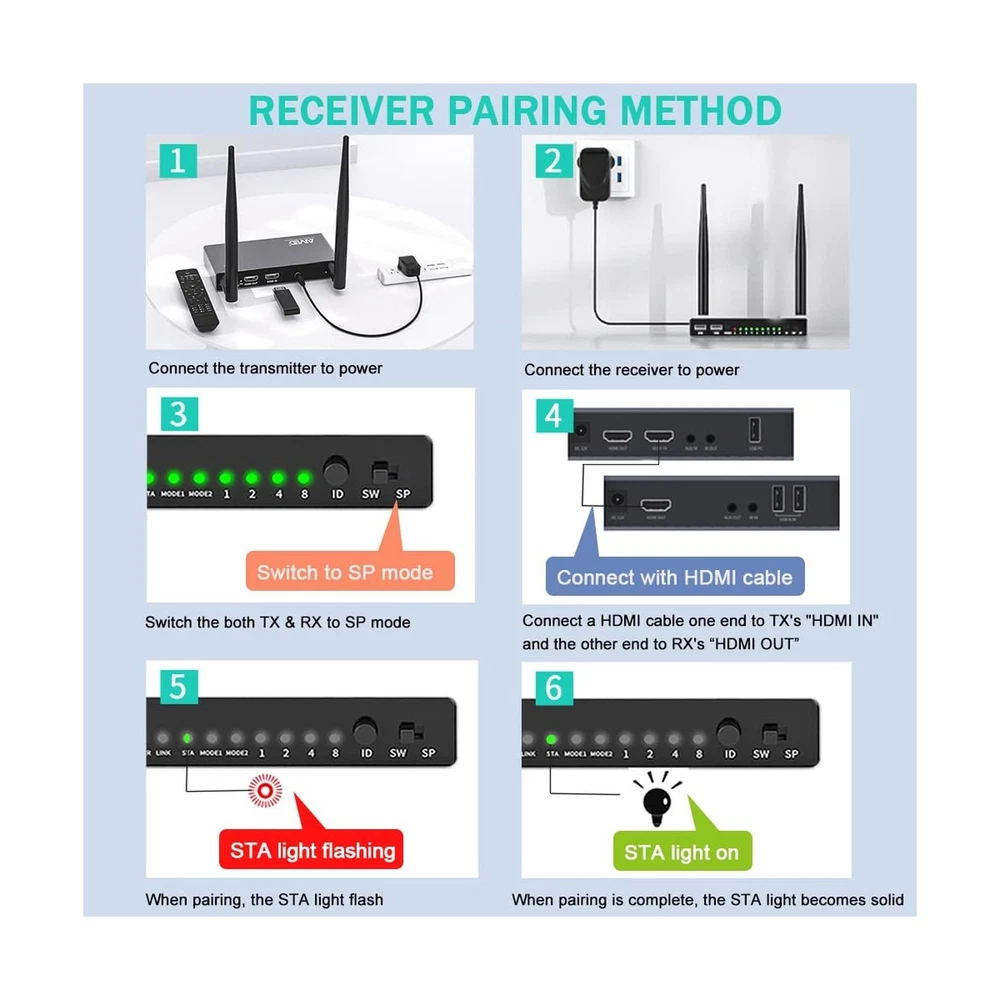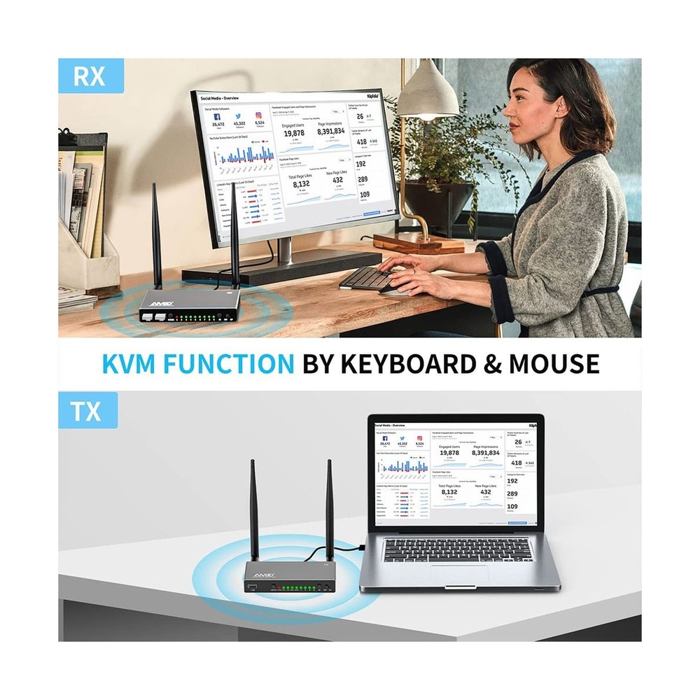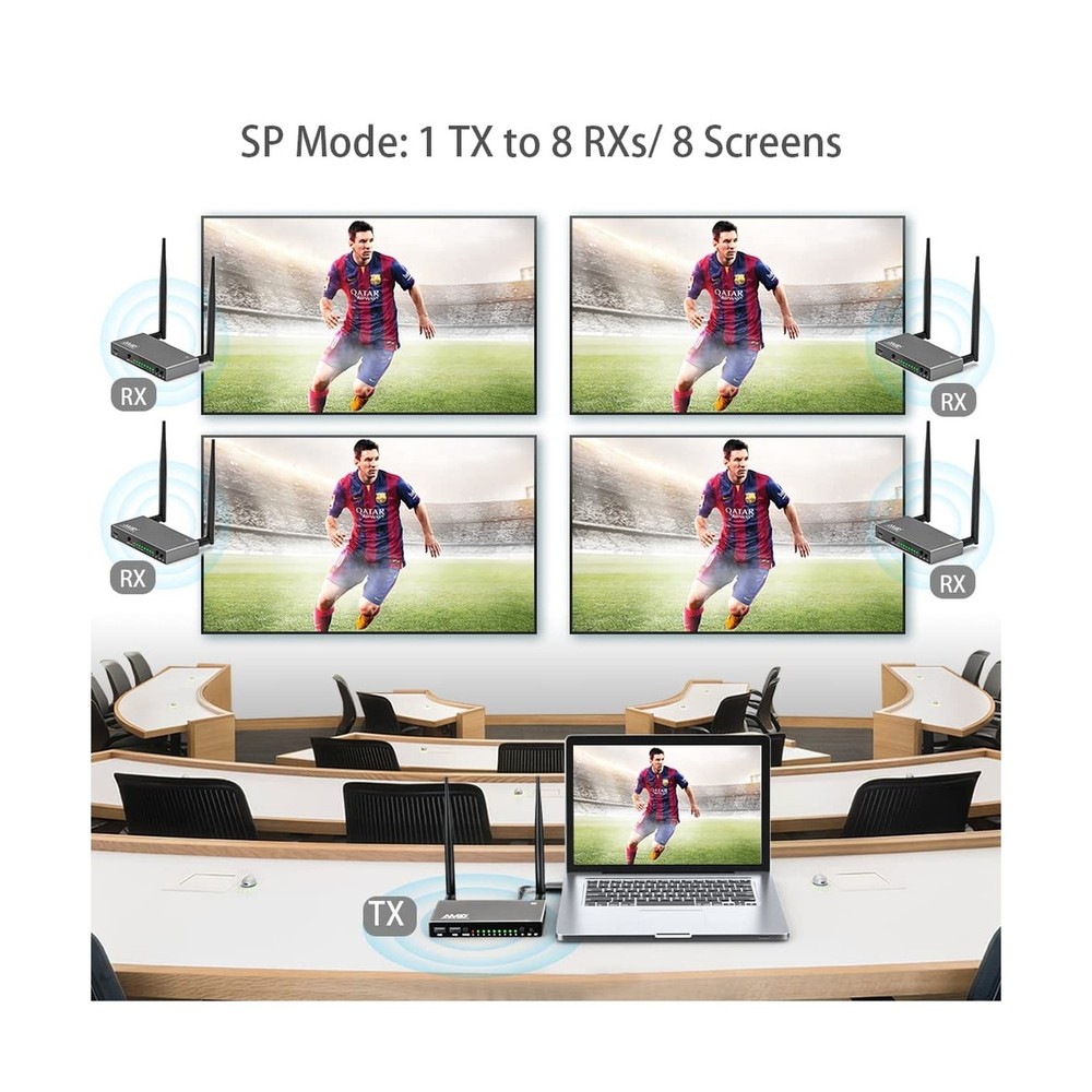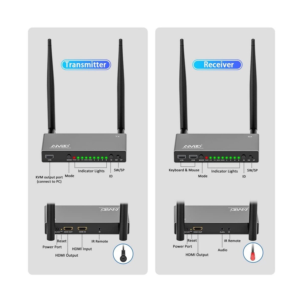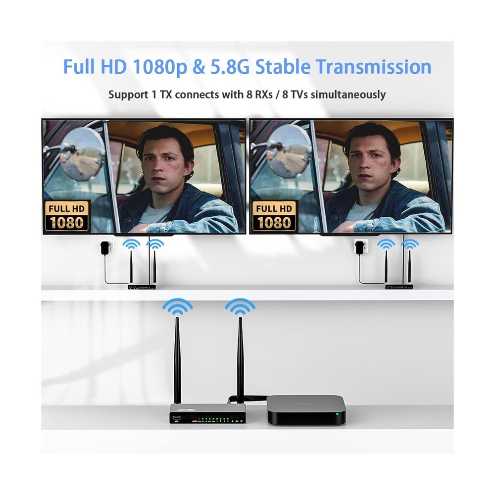 AIMIBO HDMI Wireless Transmitter & 2 Receiver 1080P, Multiple TXs & RXs, 5.8G HDMI Extender with KVM, IR Remote, Loop-Out, 656FT, Stream Video Audio for Laptop, Satellite to TV, Projector, Monitor Product Details Brand: AIMIBO Connectivity Technology: Bluetooth, Wi-Fi, USB, HDMI Compatible Devices: Television, Personal Computer Included Components: IR remote control, Transmitter, Receiver Date First Available: March 6, 2023 Manufacturer: AIMIBO Splitter/Switch Modes Design, Fits for Multiple PurposeAIMIBO Wireless HDMI extender with the new designs, it can support one to one mode, but also, it can support 1 TX to 8 RXs (Max) in SP mode for multiple screens and display multiple TVs at the same time. This HDMI wireless kit also supports 1 RX to 8 TXs(Max) in SW mode for multiple laptops. Best for big meeting room. 200m(656FT) Long Range TransmissionAIMIBO wireless HDMI extender can wirelessly send video and audio signals up to 656 feet(200m) through line-of-sight environments. It can go through wall and floor. Compatible with all HDMI-equipped devices, including (HDMI input devices) TV, monitor, projector. (HDMI output devices) blu-ray players, set-top boxes, cable/satellite boxes, laptop, PC, DVD and more. KVM Function & IR Remote ControlThe wireless HDMI receiver has 2 USB ports for connecting keyboard & mouse, so that you could control the transmitters source device at receivers end and playback device wirelessly. With the infrared remote cables, you can easily change your TVs channel, which cable box is in a different room. This wireless HDMI kit allows you to conveniently stream media from Netflix, Hulu, YouTube, and more. Full HD 1080p & 5.8G Stable Transmission AIMIBO wireless HDMI transmitter and receiver equipped with 5.8G antenna, it will not interference with other common wireless devices such as WiFi or Bluetooth, making the video transmission more stable, only 0.1s latency. It supports resolution of 480P,576P,720P, and 1080P@60Hz. Enjoy crystal clear, uncompressed HD video & digital audio with ease. Local Loop-out & Premium MaterialThe transmitter equipped with HDMI input & output ports. It supports an HDMI local Loop-out to make it easier to monitor the video source.This HDMI wireless kit is made of aluminum alloy material, durable/sturdy/sleek and looks great, perfect gift for your family members and friends. AIMIBO HDMI Wireless Transmitter & 2 Receiver 1080P, Multiple TXs & RXs, 5.8G HDMI Extender with KVM, IR Remote, Loop-Out, 656FT, Stream Video Audio for Laptop, Satellite to TV, Projector, Monitor Payment Back to Top We accept Paypal and All Major Credit Cards. Shipping & Handling Back to Top Item will be shipped FREE standard shipping in 1 business day after payment is received. Express Shipping services are available. Tracking number will be provided. Return Policy Back to Top Items can be returned for exchange or full refund within 30 days from the date you receive your merchandise. Please contact us before starting a return request, so we can resolve any issues and provide free returns if needed. Return shipping is the responsibility of buyer unless the return is a result of our mistake (i.e., your receive the wrong item). Contact Us Back to Top If you have any questions please contact us. We will respond within 1 business day or less.