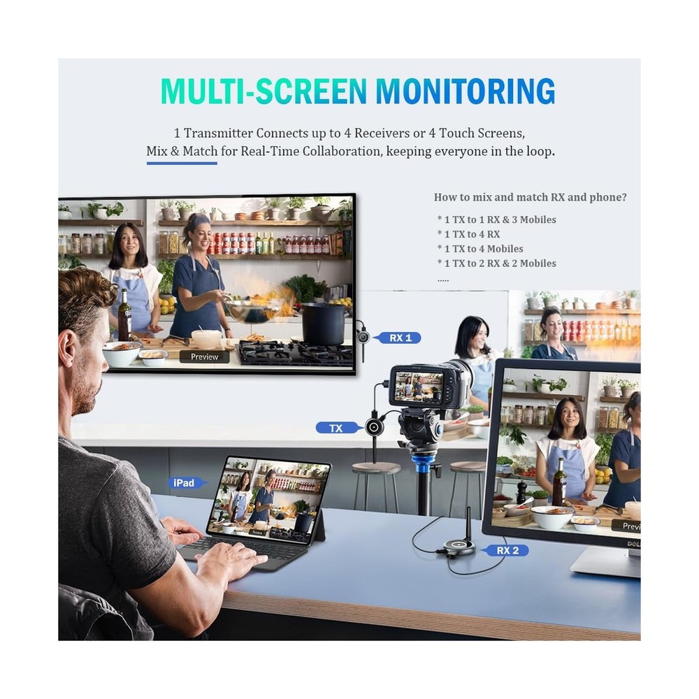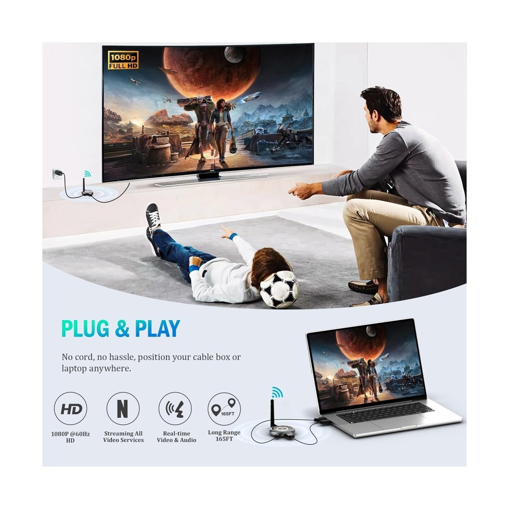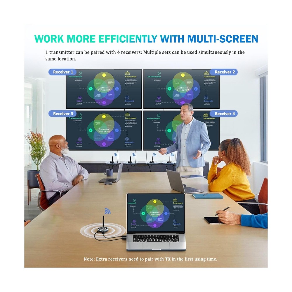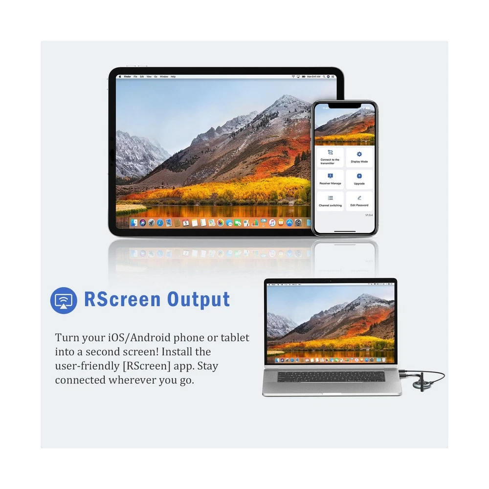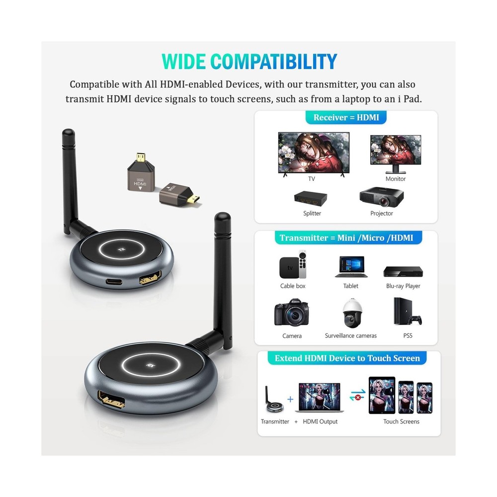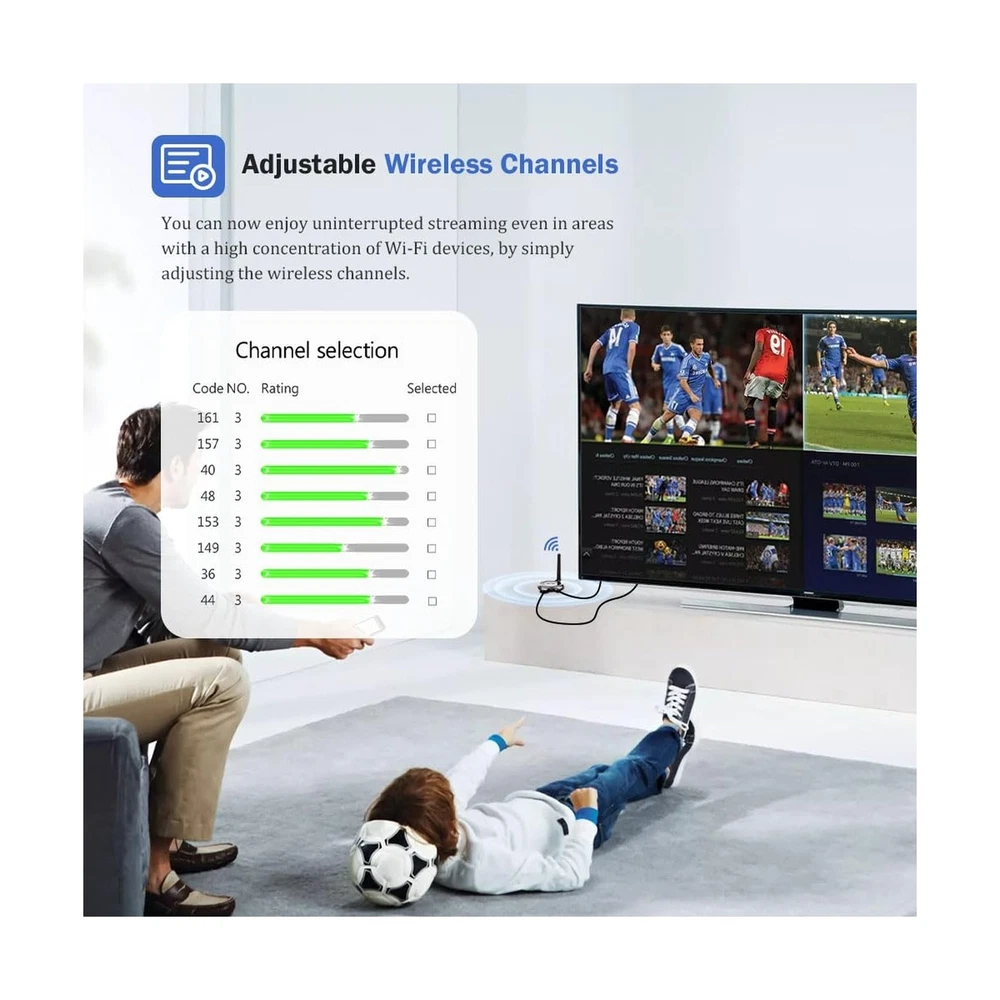 AIMIBO Wireless HDMI Transmitter & 2 Receivers, Multiple TVs, 5G HDMI Wireless Extender, 1080P@60Hz, 165FT/50M, 2 App Screen Monitoring for Laptop, Camera, TV Box to TV, Projector, Phone (1TX+2RX) Product Details Brand: AIMIBO Connectivity Technology: Bluetooth, Wi-Fi, USB, HDMI Special Feature: Touchscreen Compatible Devices: Smartphone, Speaker Connector Type: USB, HDMI Audio Output Mode: Stereo Number of Channels: 4 Output Wattage: 5 Watts Supported Internet Services: Netflix, YouTube Date First Available: August 24, 2023 Manufacturer: AIMIBO Supports 1 Transmitter up to 4 Screens AIMIBO wireless HDMI extender is capable of supporting a transmitter (TX) connected to up to 4 Receivers or 4 Mobiles and you can mix and match them as needed. Allows you to stream high-quality video and audio to multiple displays with a transmission range of up to 165ft/50m in an open environment, this extender is ideal for conference rooms, classrooms, or any setting that demands multiple sceens without the need for tangled cables. Turn Your Phone /Tablet As a Monitor The wireless HDMI kit includes 1 transmitter and 2 receivers, and you can add 2 extra displays by downloading the RScreen app on your smartphone or tablet. Perfect for camera shooting, as you can use your i-Pad to monitor the footage. Please note that while the touch screen will display the content, it cannot be used to operate the device. PLUG AND PLAY The AIMIBO HDMI wireless kit don't need Bluetooth, or Wi-Fi connectivity. During the initial setup, the new receivers need to be paired individually with the transmitter. Simply long-press the RX for approximately 3 seconds, then long-press the TX till the indicator light starts flashing. Wait for about 10 seconds for the connection to establish. It's very easy to operate. Whether you're a tech-savvy individual or a beginner, our kit can be used by anyone. 1080P@60Hz, 0.1s DELAYWith a powerful 5GHz chip and 60Hz screen refresh rate, our kit delivers an immersive 1080P viewing experience with a mere 0.1-second delay. Whether you're streaming live sports, movies, playing games, or giving presentations on big displays, our wireless HDMI transmitter and receiver allows you to enjoy it all without any interruptions, casting all your favorite apps, such as Net-flix and more. WIDE COMPATIBLEThis HDMI wireless extender is compatible with most HDMI display devices such as HDTV, Projector, Monitor, Laptop, PC, Camera, Set-top boxes, Cable Box, Blu-ray/DVD players, Ro-ku, Satellite boxes, Gaming consoles, and more. The wireless HDMI transmitter can cast any content from laptop, PC, cable box, Xbox, PS5 to smartphone, tablet, i-Pad, i-Phone, and supports all kind of video service, like Net-flix, Dis-ney Plus, Hulu, Prime Video, HBO Max, Spoti-fy, S-ling TV and more. Payment Back to Top We accept Paypal and All Major Credit Cards. Shipping & Handling Back to Top Item will be shipped FREE standard shipping in 1 business day after payment is received. Express Shipping services are available. Tracking number will be provided. Return Policy Back to Top Items can be returned for exchange or full refund within 30 days from the date you receive your merchandise. Please contact us before starting a return request, so we can resolve any issues and provide free returns if needed. Return shipping is the responsibility of buyer unless the return is a result of our mistake (i.e., your receive the wrong item). Contact Us Back to Top If you have any questions please contact us. We will respond within 1 business day or less.