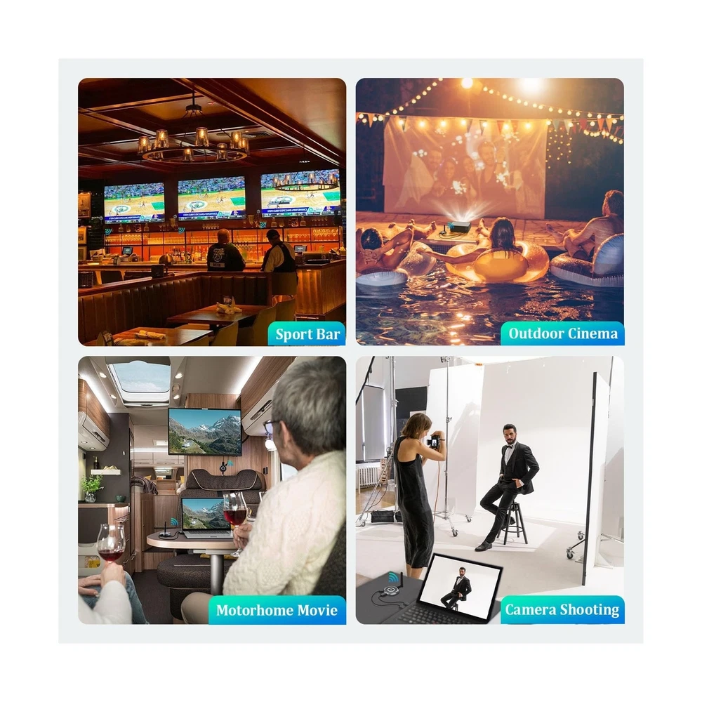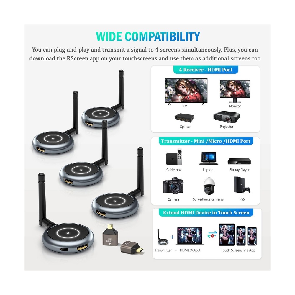 AIMIBO Wireless HDMI Transmitter and 4 Receivers, 5.8G @60Hz, Plug & Play HDMI Wireless Multiple TVs Extender for Streaming Video/Audio from Laptop, Camera, TV Box to TVs, Projectors, Monitors -165FT Product Details Style: 1TX 4RX Brand: AIMIBO MPN: Q3 UPC: Does not apply EAN: Does not apply Brand: AIMIBO Connectivity Technology: Wireless Controller Type: Remote Control Special Feature: Low Latency Compatible Devices: Laptop, Television, Tablet, Camera, Home Stereo System Connector Type: HDMI Color: Silver Supported Internet Services: Netflix Wireless Communication Technology: Bluetooth Manufacturer: AIMIBO Brand Name: AIMIBO Item Weight: 1.36 pounds Product Dimensions: 1.18 x 0.79 x 1.97 inches Item model number: Q3 Color Name: Silver Special Features: Low Latency Date First Available: May 23, 2024 EXPAND YOUR VIEWING WITH MULTIPLE RECEIVERSAIMIBO Wireless HDMI Extender comes with 1 transmitter and 4 receivers, allowing you to simultaneously mirror content across four screens in multiple rooms. Ideal for large spaces like conference rooms, stores, bars, RVs, and surveillance setups that require collaborative multi-screen usage. PLUG AND PLAYAIMIBO HDMI wireless 4 receivers kit is paired before leaving the factory, making it truly plug-and-play without the need for any settings, Bluetooth, or Wi-Fi. Even re-pairing is a breeze - simply long-press the TX & RX's function button. Whether you're a tech-savvy individual or a beginner, our kit can be used by anyone. 165FT/50M WIRELESS FREEDOMAIMIBO Wireless HDMI Transmitter and 4 Receiver set offers greater flexibility and freedom, with a transmission range of up to 165ft/50m in open areas. On the setting page, you can easily find the smoothest wireless channels, helping to prevent interference from other signals. Note: Adding RX or transmitting through solid walls may reduce the signal strength. 1080P@60Hz, DUAL BAND, 0.1s DELAYWith a dual-band 2.4& 5.8GHz chip and a 60Hz screen refresh rate, our wireless HDMI kit delivers an immersive 1080P full HD viewing experience with no delay. Whether you're streaming live sports, playing games, or giving presentations on big displays, it ensures uninterrupted enjoyment. Support HDCP, you can cast all your favorite apps, including Net-flix. WIDE COMPATIBLEThis HDMI wireless extender is compatible with most HDMI devices, such as HDTV, Projector, Monitor, Laptop, PC, MacBook, Camera, Set-top boxes, Cable Box, Blu-ray/DVD players, Ro-ku, Satellite boxes, Gaming consoles, and more. It ensures seamless and stable wireless connectivity across multiple screens, just immerse yourself in entertainment like never before. PHONE /TABLET AS MOBILE SCREENDesigned for business, students, travelers, and those frequently on the go. Simply connect TX to HDMI device and download 'Rscreen' app. Transform any touchscreen into a portable monitor. Supports up to 4 smartphones or tablets, allowing you and your friends to individually view the content. Note: The reverse operation on the touchscreen is not supported. PACKAGE & 100% SATISFACTION SERVICEOur HDMI Wireless Adapter includes 1 x transmitter (TX), 4 x receivers (RX), 1x Micro/Mini HDMI, 5 x HDMI cables, 5 x USB C cables, and 1 x user manual. Note: Not charger included. Your satisfaction is AIMIBO's top priority. We offer worry-free returns and exchanges, as well as lifelong free technical support, anytime. Payment Back to Top We accept Paypal and All Major Credit Cards. Shipping & Handling Back to Top Item will be shipped FREE standard shipping in 1 business day after payment is received. Express Shipping services are available. Tracking number will be provided. Return Policy Back to Top Items can be returned for exchange or full refund within 30 days from the date you receive your merchandise. Please contact us before starting a return request, so we can resolve any issues and provide free returns if needed. Return shipping is the responsibility of buyer unless the return is a result of our mistake (i.e., your receive the wrong item). Contact Us Back to Top If you have any questions please contact us. We will respond within 1 business day or less.
