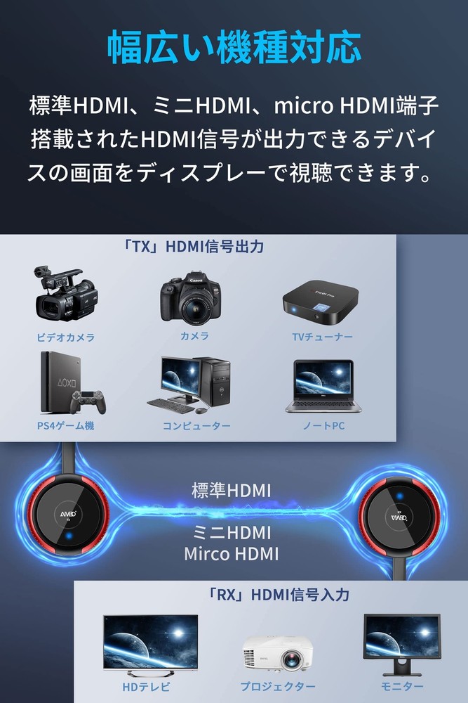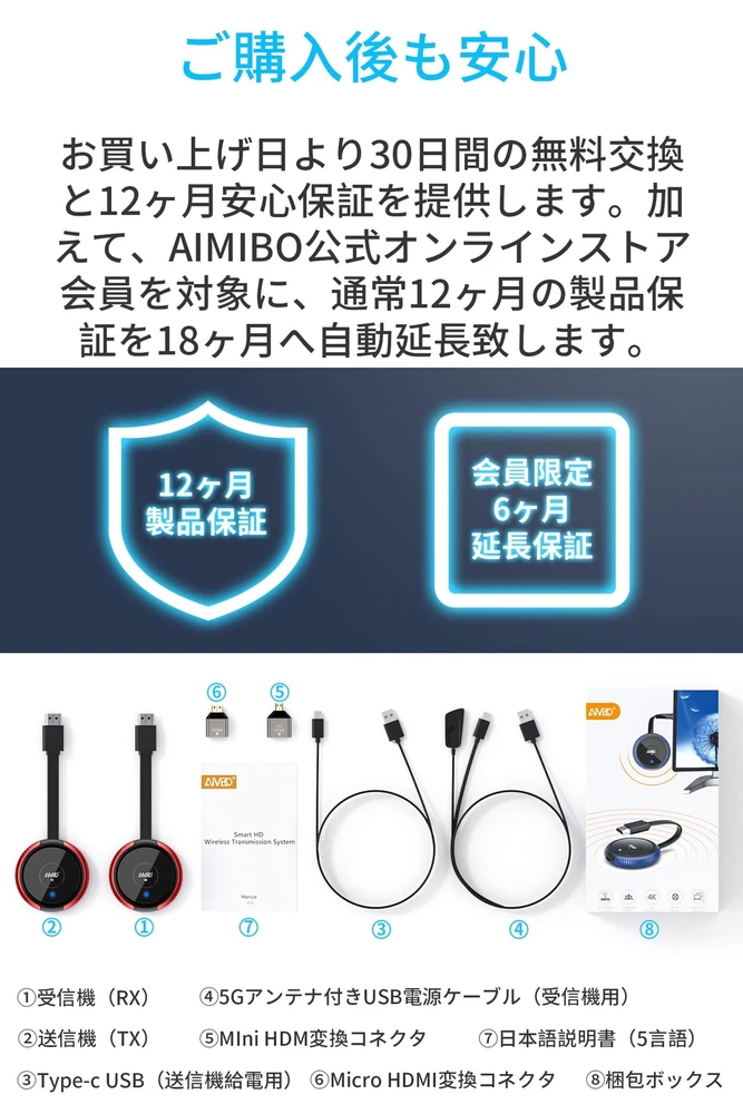 c10z02txl5 Thank you for visiting our page AIMIBO Wireless HDMI Transmission/Reception Wireless HDMI Transmitter/Receiver S [ Brand ] :AIMIBO Detail [ Condition ] New ▶▶ [HDMI Wireless Transfer] AIMIBO's wireless HDMI transceiver allows you to display the screen of equipment that supports HDMI output on a projector without an HDMI cable. No need for troublesome HDMI cables, and is recommended for events such as company briefings, viewing events, photo sessions, regular seminars, cram schools, department stores, tourism associations, etc., when the PC, projector, and monitor are far away! ■▶▶ [No software or driver required] The receiver and transmitter are already paired, so there is no need for troublesome settings such as installing an APP. After wiring the receiver and monitor/TV/projector, transmitter and computer/camera/PS4 game console/Blu-ray recorder, USB terminal and power supply, wait a few seconds and the screens will be automatically synchronized. *Note: The receiver is powered by the included USB terminal, so don't forget to connect the power supply. If the transmitter's indicator lamp does not display properly, please connect it to the power source. ■▶▶ [Long distance stable transmission] HDMI signal transmission distance can be extended up to 50m wirelessly. The communication distance is 20 to 30m, achieving high capacity and stable communication, and it is possible to connect up to 15m even through walls and ceilings. [5G & 2.4Ghz] The receiver uses both 2.4G and 5GHz frequency bands, and can be changed to suit the environment in which the wireless display is installed. (Please change from the 192.168.203.1 settings page.) ■▶▶ [Full HD 1080P & Low Latency] The wireless HDMI receiver stably plays HD1080P resolution and 3D video audio, ultra-low delay (almost real-time), and full of immersion. You can enjoy high-quality images. ■▶▶ [Wide Compatibility] AIMIBO's HDMI wireless transmission and reception is compact, lightweight and easy to carry. Compatible with most HDMI-equipped devices such as transmitters (computers, action cameras, PS4 game consoles, DVD recorders, Blu-ray) and receivers (TVs, projectors, monitors [ Country of Manufacture ] If "Made in Japan" is NOT described on whole listing page, Items are manufactured in other country (China, Vietnam and etc.). [ Manual & Menu Language ] We treat Japanese Market Usage Items. So items have only Japanese Manual & Menu Language. Please contact us if you would like to know more details. *Japanese Menu Only : Panasonic Camera *English Menu available : Nikon, Canon [ Warranty ] Japanese Warranty Only. Buyers need to send item to us in Japan to repair with warranty & own all shipping cost. If you need to repair item in your country with warranty, please do not order this item. [ Electronics ] Japan Usage Item. Voltage:100V, Plug :Type A, FM Tune:70-90MHz Please check your country's condition for use. [ Multiple sizes and colors ] Before your payment, please contact us about stock of size & color. International Buyers [ International Buyers - Please Note ] - Import duties, taxes and charges are not included in the item price or shipping charges. These charges are the buyer's responsibility. - Please check with your country's customs office to determine what these additional costs will be prior to bidding/buying. - These charges are normally collected by the delivering freight (shipping) company or when you pick the item up. Please do not confuse them for additional shipping charges. Asia India, Uzbekistan, Kyrgyzstan, Georgia, Turkmenistan, Bangladesh, Mongolia, Laos, Brunei Darussalam, Cambodia If "Economy" shipping is selected, you will have to choose one of the following: 1) Cancel your order 2) Additionally pay for the extra shipping fee to change the shipping method to "Standard" shipping (DHL or Fedex) --> Shipping [ Shipping Address ] We ship to only address where be registered on eBay. [ Li-ion Battery ] Some countries( Germany,France,Italy,Mongolia,SriLanka,Turkey,Nigeria and more.) does not accept lithium battery via EMS, SAL by Post Office. Please check your country's rule. If we receive order from buyer who located in these countries, we will ask buyer to choose 1 from 3. 1. Ship without Ri-ion Battery removed from item. 2. Change shipping method to Fedex or DHL with additional shipping cost. 3. Cancel