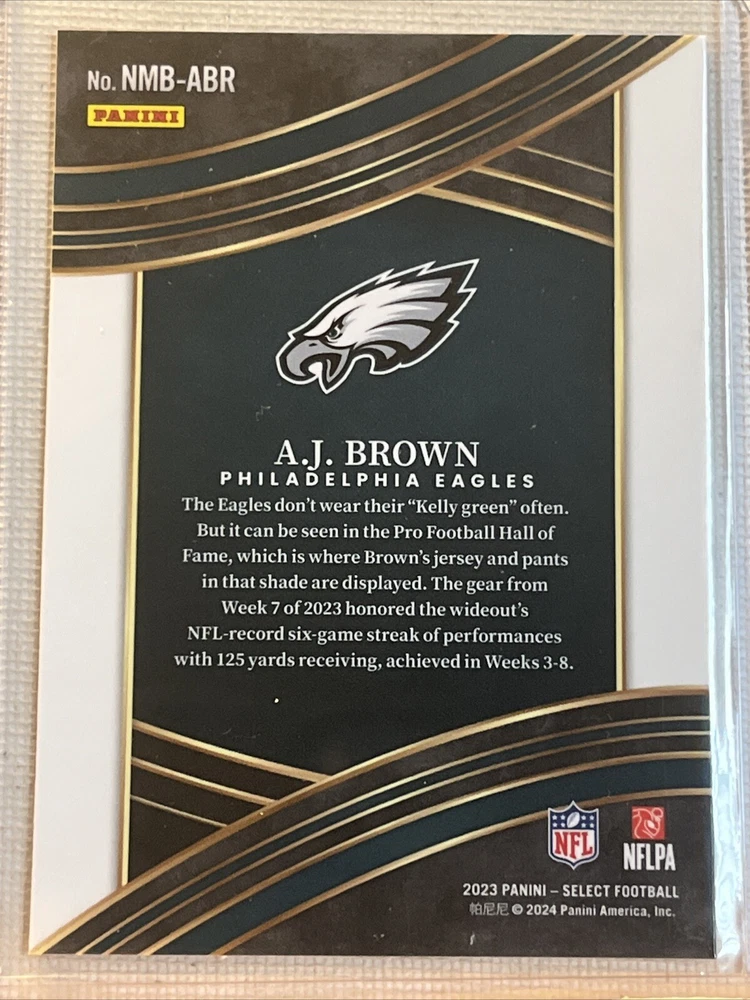 Get your hands on this A.J. Brown #NMB-ABR 2023 Panini Select Eagles Numbers sports trading card. This card features the Philadelphia Eagles player and athlete in his football gear, ready to take on the field. Perfect for collectors and enthusiasts alike, this card is a must-have for any National Football League (NFL) fan. Manufactured by Panini, this high-quality sports trading card is part of the 2023 Panini Select set. Ideal for those looking to add to their collection or those who want to showcase their love for football, this card is a great addition to any sports memorabilia collection. Don't miss out on the opportunity to own this unique and rare card.