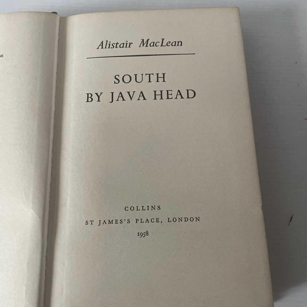 ALISTAIR MacLEAN South By Java Head - 1st ed 1958 Gripping World War II adventure novel published in 1958. The story is set in February 1942, during the fall of Singapore to the Japanese Army. A diverse group of survivors, including soldiers, nurses, and civilians, attempt to escape the city aboard a battered freighter called the Kerry Dancer. They face numerous challenges, including Japanese attacks, treacherous weather, and internal conflicts. Condition: GOOD - Photo's of Actual Product - See photos to confirm condition A book that has been read, but is in good condition. Minimal damage to the book cover eg. scuff marks, but no holes or tears. If this is a hard cover, the dust jacket may be missing. Binding has minimal wear. The majority of pages are undamaged with some creasing or tearing, and pencil underlining of text, but this is minimal. No highlighting of text, no writing in the margins, and no missing pages. ------------------- Please See my eBay shop for more Modern & Vintage Books Add as a favourite seller, new stock added daily Thanks for looking