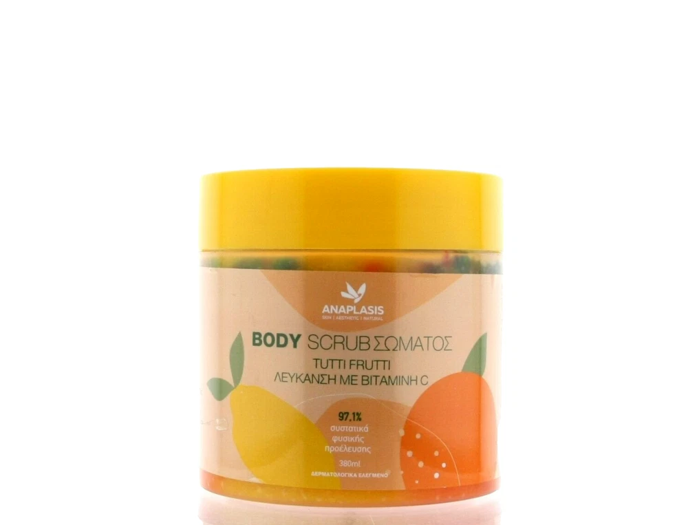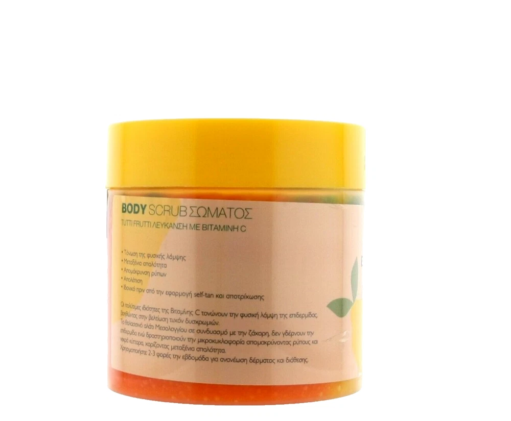 TUTTI FRUTTI – WHITENING WITH VITAMIN C 380ml 97,1% Ingredients of Natural Origin Stimulation of natural glow Silky softness Pollutant removal Peeling Ideal before applying self-tan and hair removal DERMATOLOGICALLY TESTED The valuable properties of Vitamin C stimulate the natural radiance of the skin, helping to improve any discolorations. Messolonghi sea salt in combination with sugar, do not injure the skin while activating the microcirculation removing dirt and dead cells, giving a silky softness. INSTRUCTIONS FOR USE On wet skin, apply a sufficient amount and massage all over the body. Focus on areas such as the buttocks, elbows and knees. Remove by rinsing with lukewarm water. Use 2-3 times a week for immediate skin rejuvenation and mood effects. PRECAUTIONS Keep the product out of the reach of children and prevent them from accessing it. Store the product in a safe, dry and cool place, away from sunlight. If you experience persistent unpleasant symptoms or allergy, stop the application immediately and inform the company. It is recommended to apply a limited application for a limited time for 24 hours, for any allergic reaction. Contact us Feel free to contact us at any time through eBay messages if you have any questions , comments or product requests . We will do our best to help you out! We encourage our customers to contact us with any questions or concerns! Returns Returns Accepted After receiving the item, your should contact us within 30 days Return shipping cost will be paid by the buyer Refund will be given as Money Back Shipping FREE SHIPPING / Handling time 3 business days You may have to pay any necessary customs, import fees, duties and taxes when your item arrives, added by your country.
