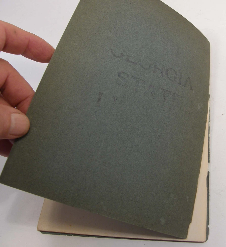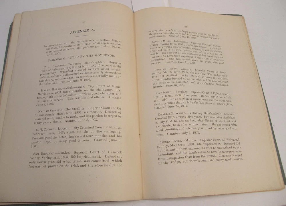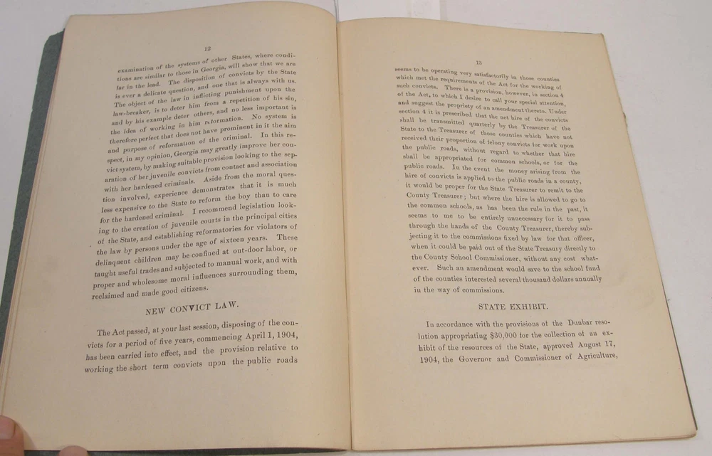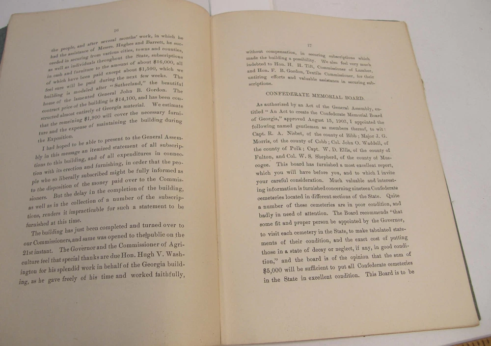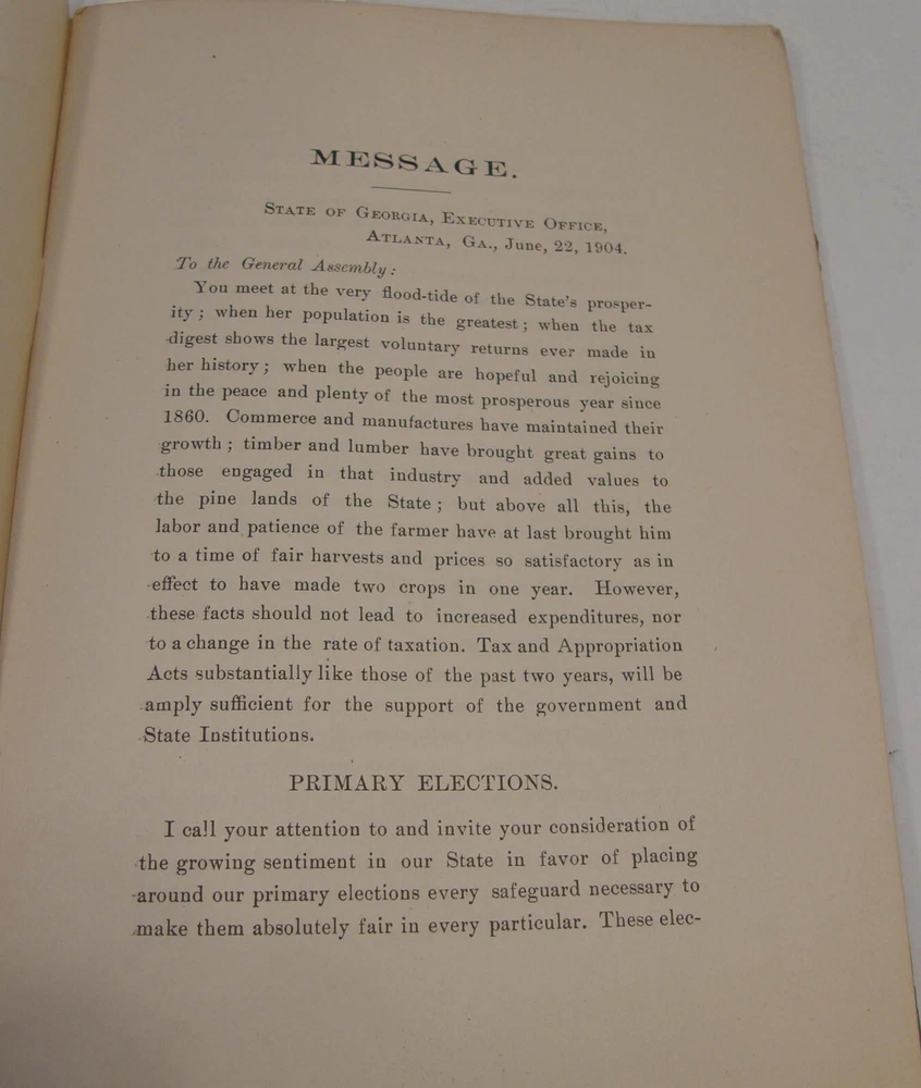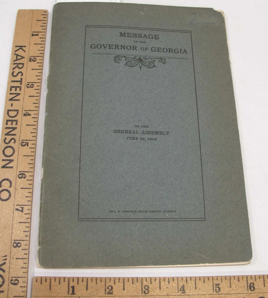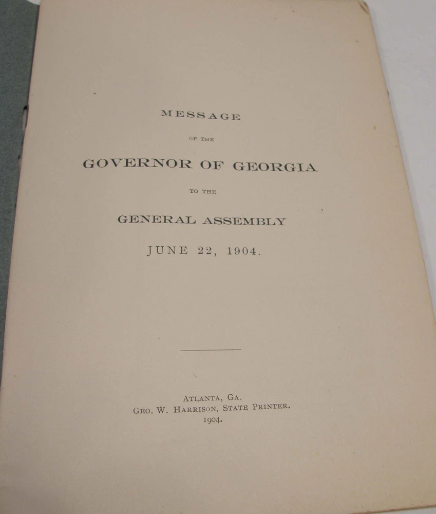 Please email with any questions. MESSAGE OF THE GOVERNOR OF GEORGIA TO THE GENERAL ASSEMBLY, June 22, 1904, bound 35 page 6x9 booklet. Slight wear to cover along the edges and the fold line. Text complete and clean, torn-off corner on one page. Includes a list of the many pardons and sentence commutations granted by Governor Terrell. Also a report on the State Sanitarium, office reports, Confederate Memorial Board, new convict law, Georgia Exhibit at the 1904 World's Fair in St Louis and more.