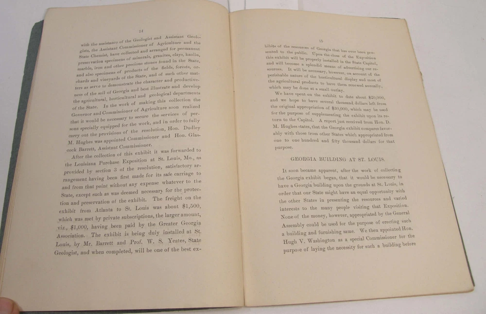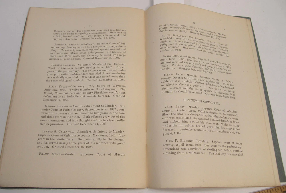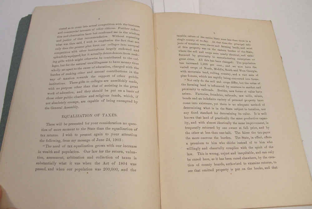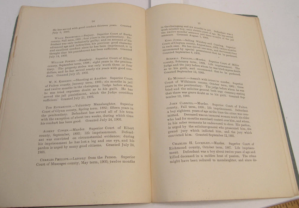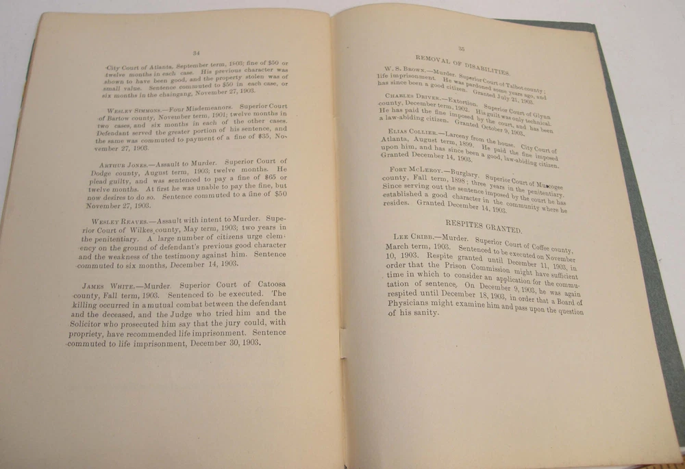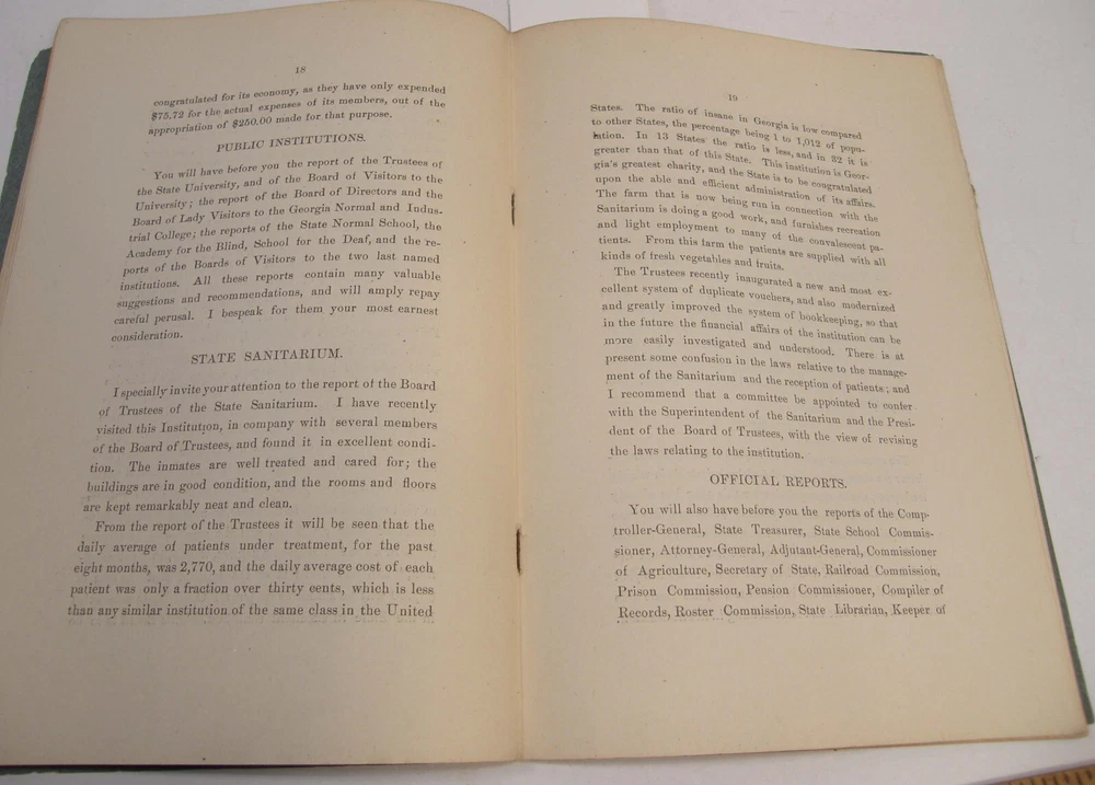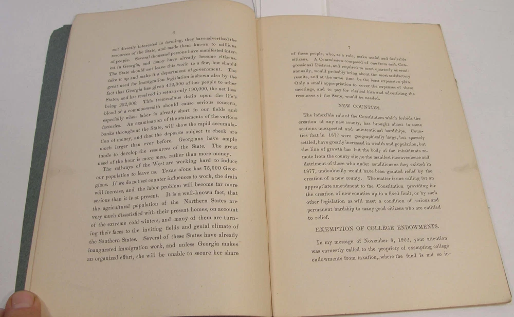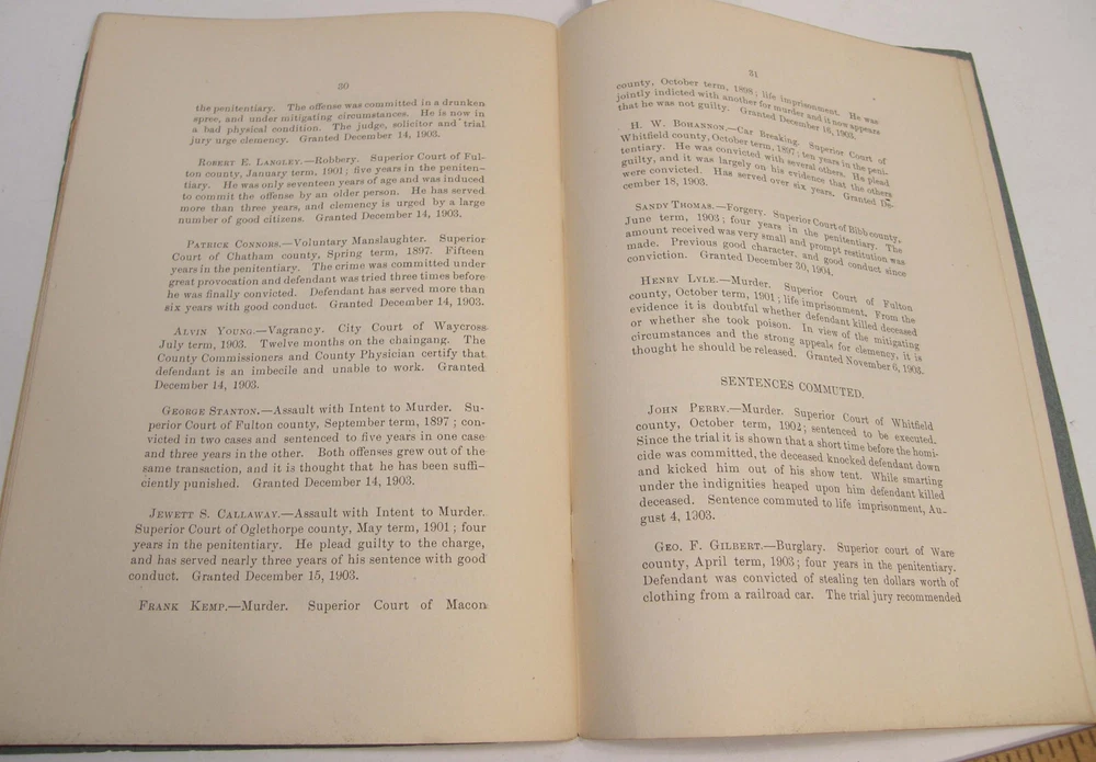 Please email with any questions. MESSAGE OF THE GOVERNOR OF GEORGIA TO THE GENERAL ASSEMBLY, June 22, 1904, bound 35 page 6x9 booklet. Slight wear to cover along the edges and the fold line. Text complete and clean, torn-off corner on one page. Includes a list of the many pardons and sentence commutations granted by Governor Terrell. Also a report on the State Sanitarium, office reports, Confederate Memorial Board, new convict law, Georgia Exhibit at the 1904 World's Fair in St Louis and more.