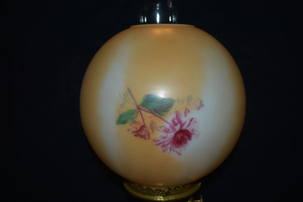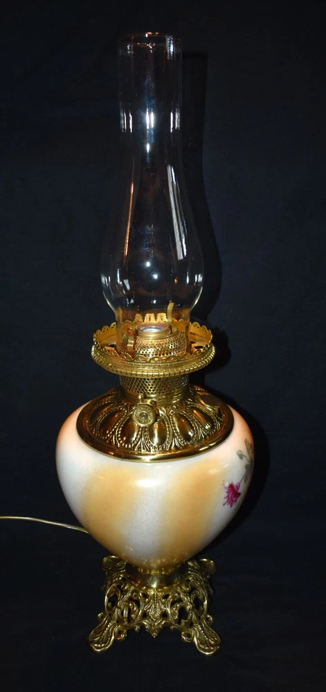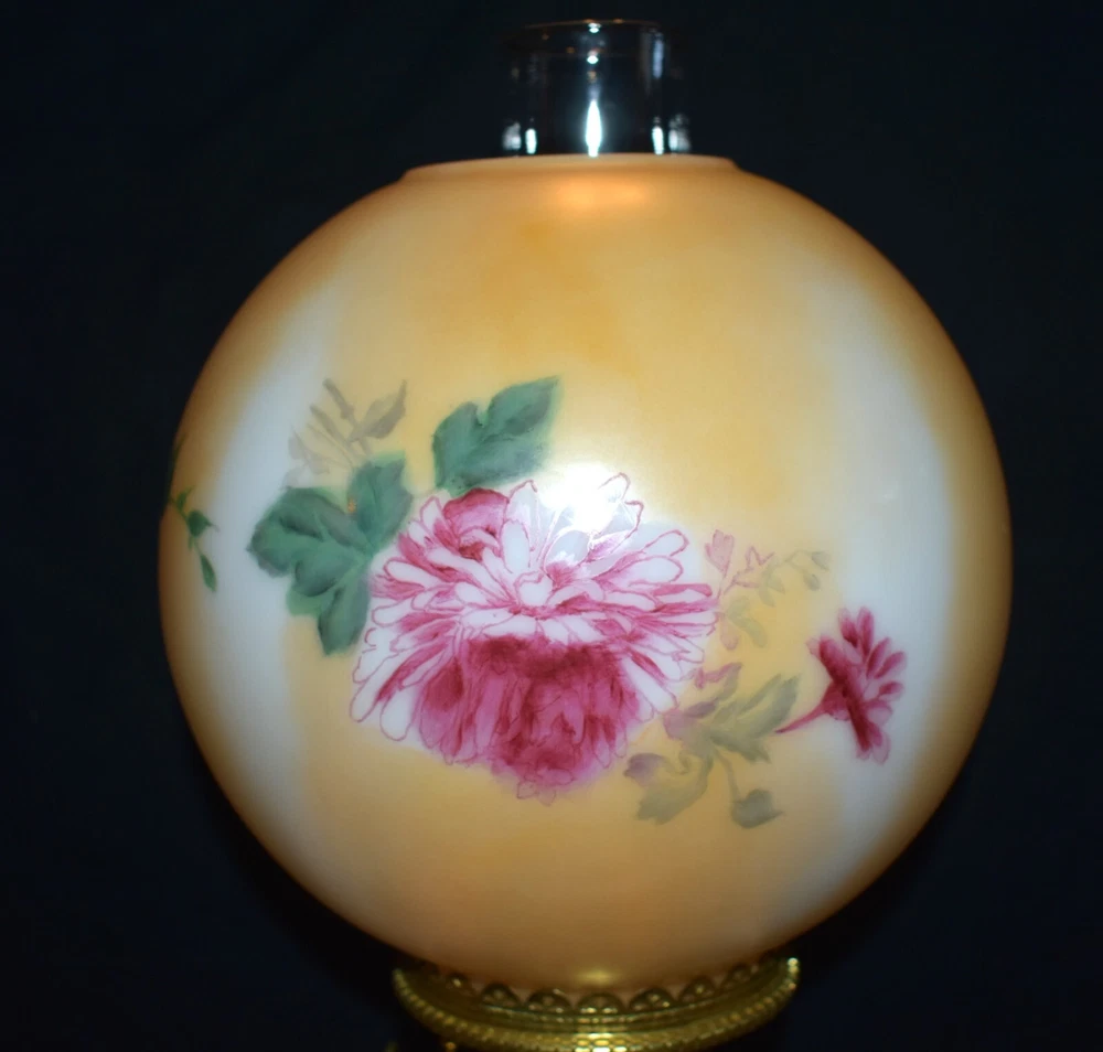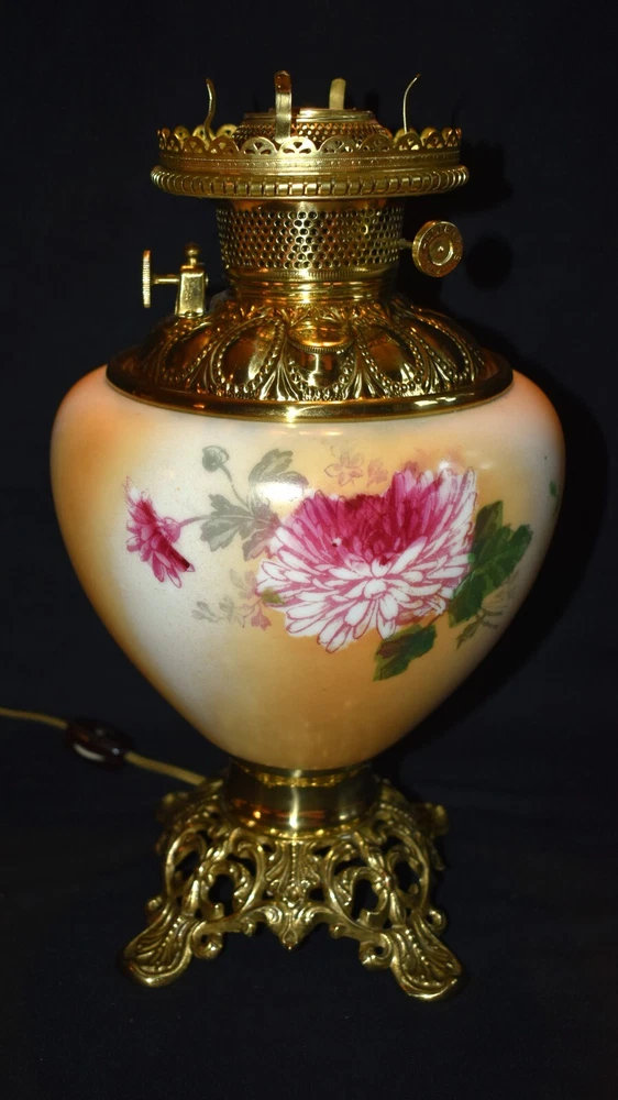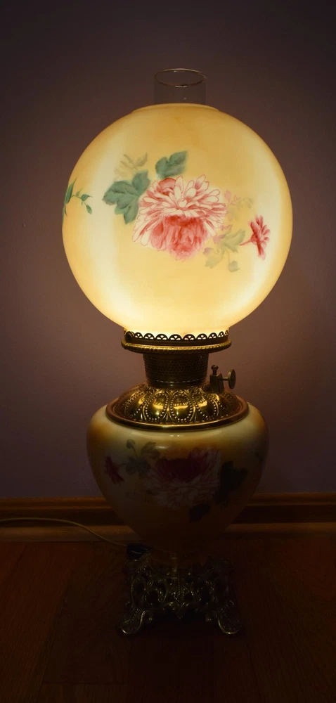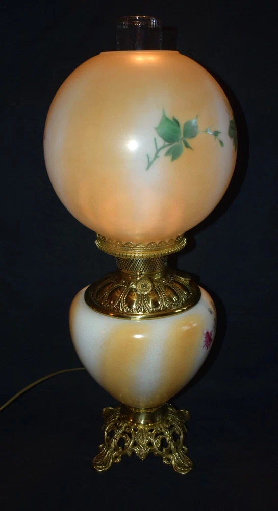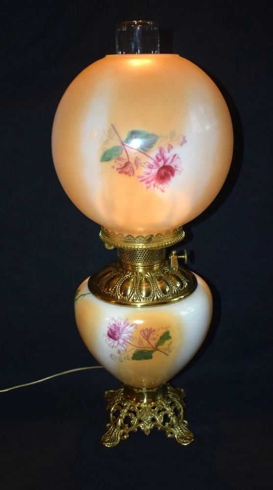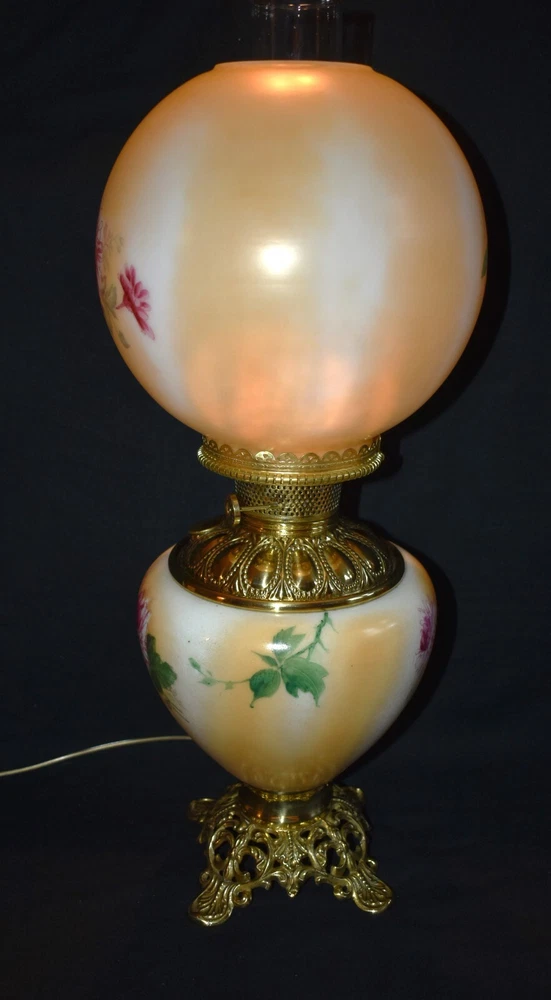 ANTIQUE ABCO ROCHESTER GWTW PARLOR LAMP ELECTRIFIED 1800'S GOLD FLORAL 22" WOW! 22 1/2 inches tall to top of chimney 21 inches to top of shade shade is 9 inches across this was gently converted to electric it is gold in color with some white/ivory shading amazing condition the Rochester Lamp Co operated from 1884-1905 a little information on the Rochester Lamp Co: Charles Stanford Upton was born on November 24, 1844. He was an avid reader and spent many evenings with a good book. Dissatisfied with the inadequate amount of light produced by the flat wick kerosene lamp, he theorized that three or four wicks sewn together into a tube would give several times the light of the flat wick lamp. He arranged to meet Leonard Henkle at the Powers Hotel in Rochester to discuss his idea. As ideas were bounced around, they were trying to think of a way to make a model. The two men noticed the tin cuspidors on the floor of the hotel and a light went off - literally! Learning where the cuspidors could be purchased, the two hurried off to the hardware store of Hamilton and Matthews on Exchange Street. With two spittoons in hand, the two men hastened to Henkle's repair shop on Water Street, where, after much experimentation, they produced a working model. In 1884 he organized The Rochester Lamp Company , serving as both manager and president. Upton bought the manufacturing rights to Leonard Henkle's patent #292,114, dated January 15, 1884, for improvements in the air distribution of center draft lamps - the perforated thimble, or flame spreader, as it is often called today. Upton christened the lamp "The Rochester," presumably after the city in which he lived. Upton open lamp stores and set about aggressively marketing his product. The "Rochester" would become one of the best designed and best made center draft lamps of the era. Upton was innovative with advertising as well. After he established his office in New York City, he concocted an idea to promote his lamps. He advertised for nineteen men of a certain height with the requirement that they all be completely bald. Upton dressed them uniformly, in white ties and tails, and sent them to a popular stage show, having them occupy the front row. They entered the auditorium with military precision, silk top hats adorning each head. Their entrance was a spectacle in itself. They stood in front of their seats amid disgust at their poor manners as they did not remove their hats, and were obstructing the stage. Once removed, the men sat down. Spotlights illuminated their bald heads from above, revealing the red letters painted in each of their noggins that spelled out: USE THE ROCHESTER LAMP . The escapade garnered a lot of local press, much to the delight of Upton. Charles Upton died on February 17, 1897. The company continued on until around 1905 under the management of Upton's family members. We are using a flat shipping of 50.00 for the continental US only. Ebay's shipping calculator runs high on larger boxes so we are doing it this way. If it is less, we will refund the overcharge. we use a high resolution camera to give a detailed description of the item 50724-5