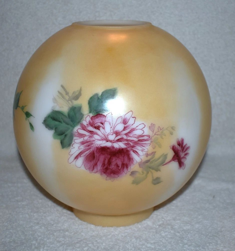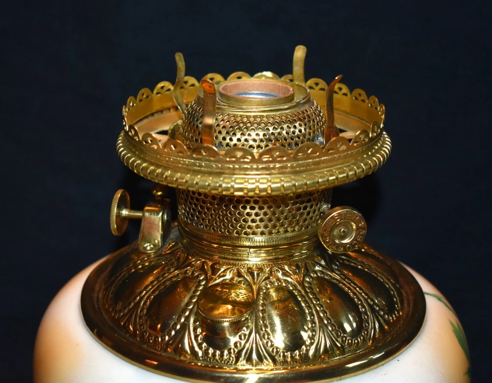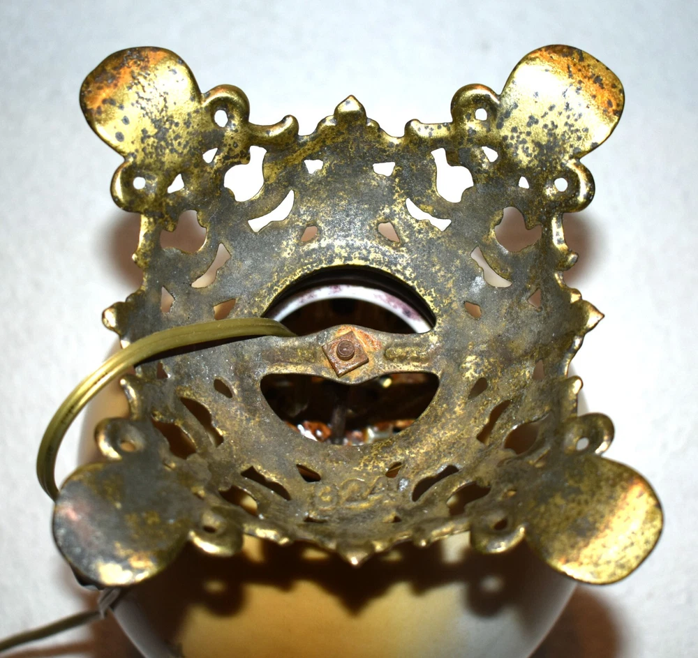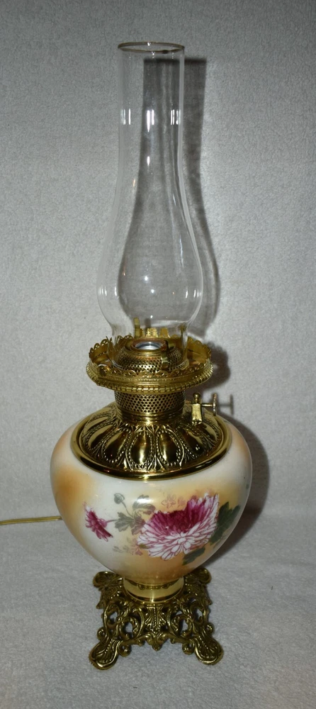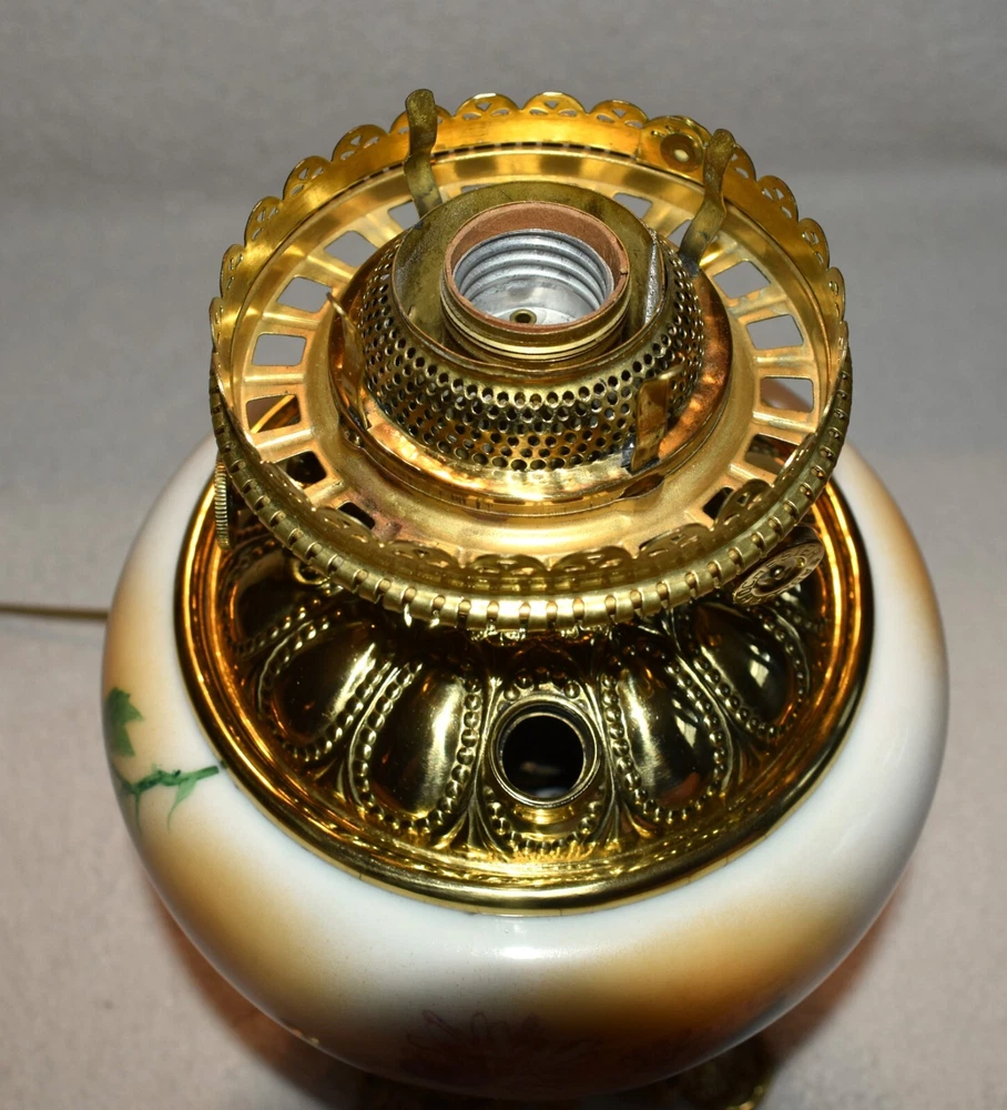 ANTIQUE ABCO ROCHESTER GWTW PARLOR LAMP ELECTRIFIED 1800'S GOLD FLORAL 22" WOW! 22 1/2 inches tall to top of chimney 21 inches to top of shade shade is 9 inches across this was gently converted to electric it is gold in color with some white/ivory shading amazing condition the Rochester Lamp Co operated from 1884-1905 a little information on the Rochester Lamp Co: Charles Stanford Upton was born on November 24, 1844. He was an avid reader and spent many evenings with a good book. Dissatisfied with the inadequate amount of light produced by the flat wick kerosene lamp, he theorized that three or four wicks sewn together into a tube would give several times the light of the flat wick lamp. He arranged to meet Leonard Henkle at the Powers Hotel in Rochester to discuss his idea. As ideas were bounced around, they were trying to think of a way to make a model. The two men noticed the tin cuspidors on the floor of the hotel and a light went off - literally! Learning where the cuspidors could be purchased, the two hurried off to the hardware store of Hamilton and Matthews on Exchange Street. With two spittoons in hand, the two men hastened to Henkle's repair shop on Water Street, where, after much experimentation, they produced a working model. In 1884 he organized The Rochester Lamp Company , serving as both manager and president. Upton bought the manufacturing rights to Leonard Henkle's patent #292,114, dated January 15, 1884, for improvements in the air distribution of center draft lamps - the perforated thimble, or flame spreader, as it is often called today. Upton christened the lamp "The Rochester," presumably after the city in which he lived. Upton open lamp stores and set about aggressively marketing his product. The "Rochester" would become one of the best designed and best made center draft lamps of the era. Upton was innovative with advertising as well. After he established his office in New York City, he concocted an idea to promote his lamps. He advertised for nineteen men of a certain height with the requirement that they all be completely bald. Upton dressed them uniformly, in white ties and tails, and sent them to a popular stage show, having them occupy the front row. They entered the auditorium with military precision, silk top hats adorning each head. Their entrance was a spectacle in itself. They stood in front of their seats amid disgust at their poor manners as they did not remove their hats, and were obstructing the stage. Once removed, the men sat down. Spotlights illuminated their bald heads from above, revealing the red letters painted in each of their noggins that spelled out: USE THE ROCHESTER LAMP . The escapade garnered a lot of local press, much to the delight of Upton. Charles Upton died on February 17, 1897. The company continued on until around 1905 under the management of Upton's family members. We are using a flat shipping of 50.00 for the continental US only. Ebay's shipping calculator runs high on larger boxes so we are doing it this way. If it is less, we will refund the overcharge. we use a high resolution camera to give a detailed description of the item 50724-5