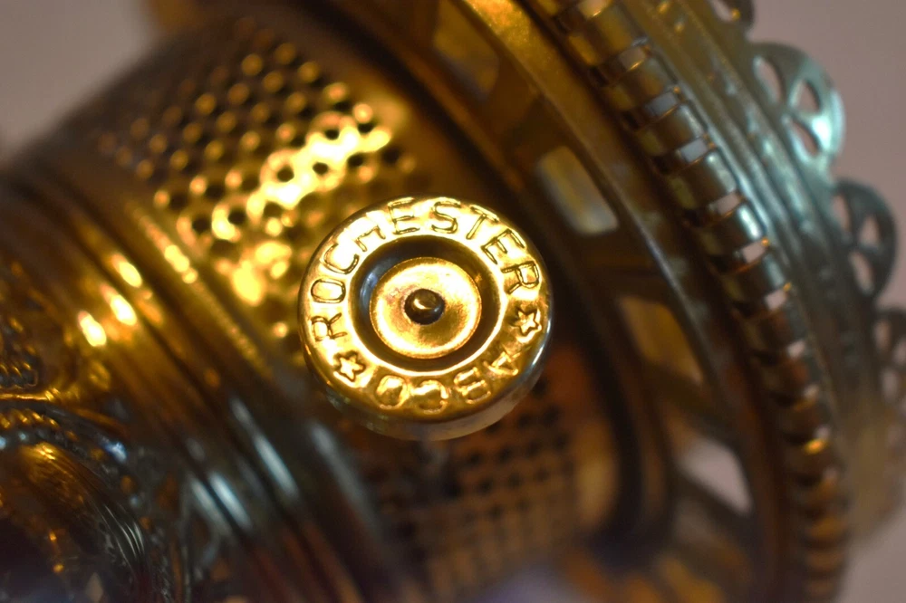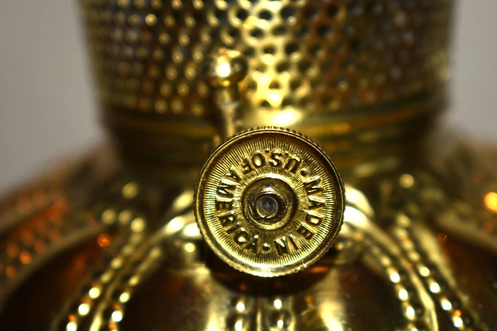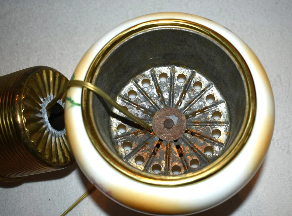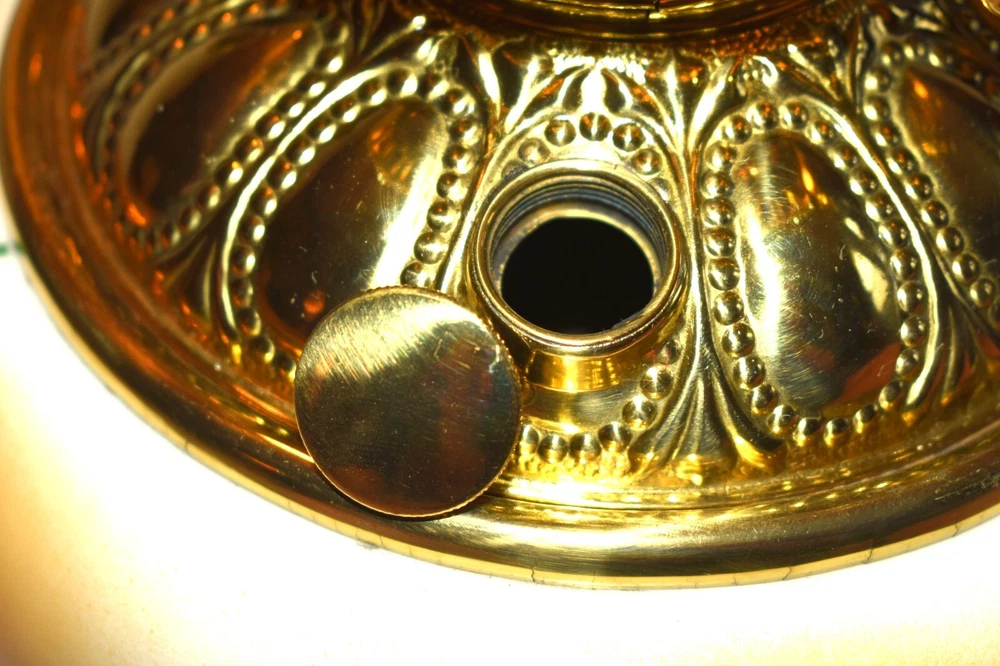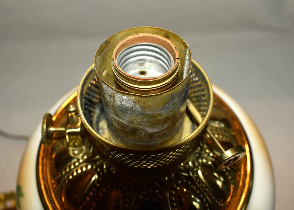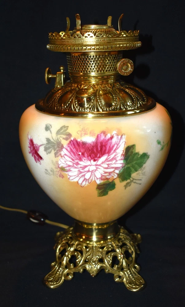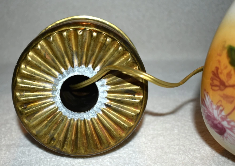 ANTIQUE ABCO ROCHESTER GWTW PARLOR LAMP ELECTRIFIED 1800'S GOLD FLORAL 22" WOW! 22 1/2 inches tall to top of chimney 21 inches to top of shade shade is 9 inches across this was gently converted to electric it is gold in color with some white/ivory shading amazing condition the Rochester Lamp Co operated from 1884-1905 a little information on the Rochester Lamp Co: Charles Stanford Upton was born on November 24, 1844. He was an avid reader and spent many evenings with a good book. Dissatisfied with the inadequate amount of light produced by the flat wick kerosene lamp, he theorized that three or four wicks sewn together into a tube would give several times the light of the flat wick lamp. He arranged to meet Leonard Henkle at the Powers Hotel in Rochester to discuss his idea. As ideas were bounced around, they were trying to think of a way to make a model. The two men noticed the tin cuspidors on the floor of the hotel and a light went off - literally! Learning where the cuspidors could be purchased, the two hurried off to the hardware store of Hamilton and Matthews on Exchange Street. With two spittoons in hand, the two men hastened to Henkle's repair shop on Water Street, where, after much experimentation, they produced a working model. In 1884 he organized The Rochester Lamp Company , serving as both manager and president. Upton bought the manufacturing rights to Leonard Henkle's patent #292,114, dated January 15, 1884, for improvements in the air distribution of center draft lamps - the perforated thimble, or flame spreader, as it is often called today. Upton christened the lamp "The Rochester," presumably after the city in which he lived. Upton open lamp stores and set about aggressively marketing his product. The "Rochester" would become one of the best designed and best made center draft lamps of the era. Upton was innovative with advertising as well. After he established his office in New York City, he concocted an idea to promote his lamps. He advertised for nineteen men of a certain height with the requirement that they all be completely bald. Upton dressed them uniformly, in white ties and tails, and sent them to a popular stage show, having them occupy the front row. They entered the auditorium with military precision, silk top hats adorning each head. Their entrance was a spectacle in itself. They stood in front of their seats amid disgust at their poor manners as they did not remove their hats, and were obstructing the stage. Once removed, the men sat down. Spotlights illuminated their bald heads from above, revealing the red letters painted in each of their noggins that spelled out: USE THE ROCHESTER LAMP . The escapade garnered a lot of local press, much to the delight of Upton. Charles Upton died on February 17, 1897. The company continued on until around 1905 under the management of Upton's family members. We are using a flat shipping of 50.00 for the continental US only. Ebay's shipping calculator runs high on larger boxes so we are doing it this way. If it is less, we will refund the overcharge. we use a high resolution camera to give a detailed description of the item 50724-5