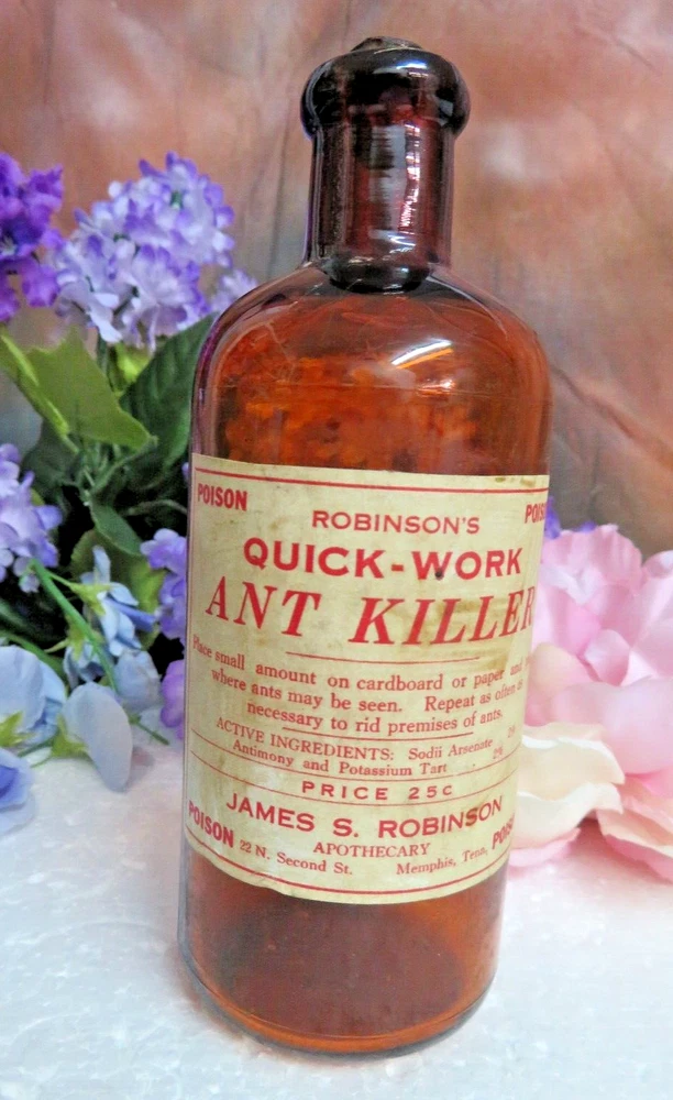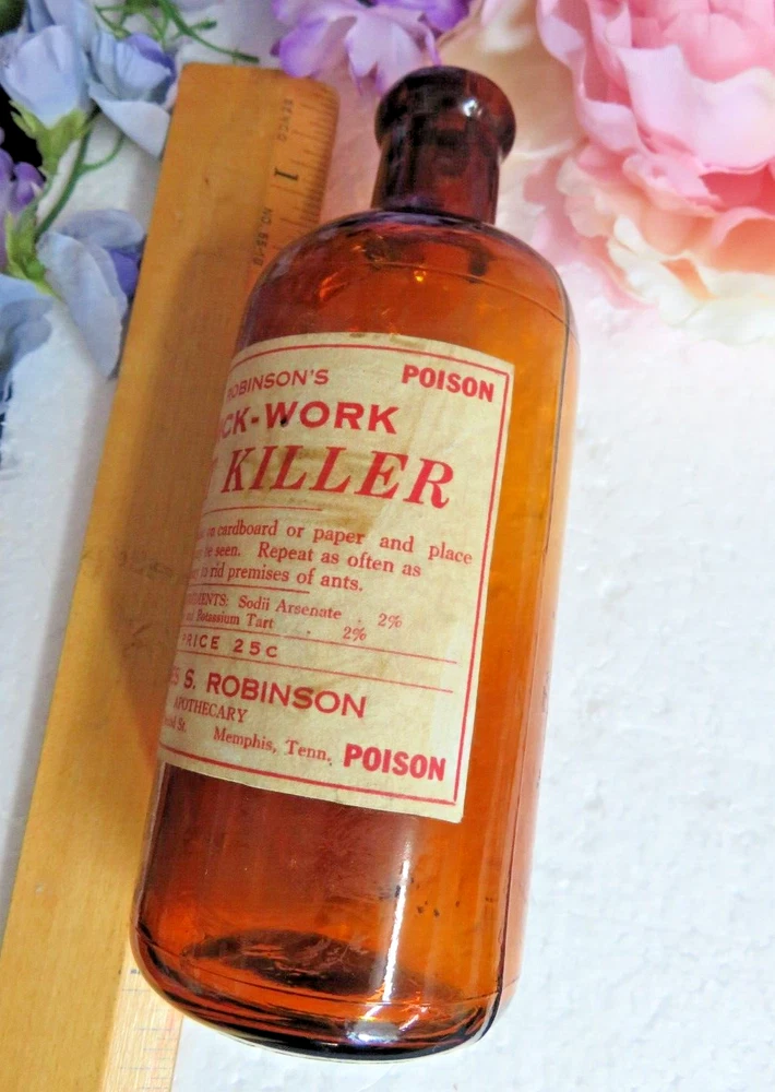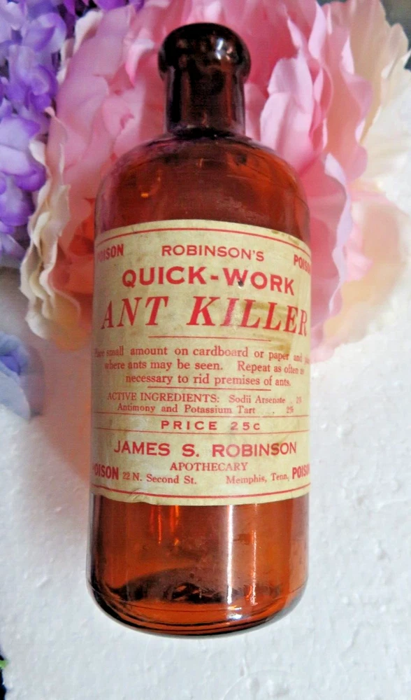 *Antique collector bottle *Amber glass, nice glow, some air bubbles *Blown with mold, side seams to neck, top and bottom seam *Blown top with original cork *Label; Poison/ Robinson's Quick-Work Ant Killer *No chips, no cracks *6 1/2" tall, 2 3/8" wide I sell a variety of items of which I am not an expert on, please view all photos, they are the major part of the description. The written description is based on my opinion and observation of the item.I do my best, if you have another opinion please feel free to let me know, additional knowledge is always appreciated. Measurements are approximate. The listing is for the items described only, props and display items are not included. THANKS FOR BIDDING!! Check out my other items !Be sure to add me to your favorites list ! Sign up for my email newsletters by adding my eBay Store to your Favorites *Payment accepted; Paypal *Item shipped by USPS *Item shipped within 1 business day of receipt of payment *Combined shipping available *Standard shipping and handling fees for the USA are posted so you know before you bid what the cost will be *Please email for international shipping estimates. VINTAGE & ANTIQUE ITEMS ARE SOLD AS IS, there may be flaws due to age, if you want new condition please buy a new item. I try to note any obvious damage or flaws but there may be flaws or damage not noticed on initial inspection. I do not take anything apart or check every hidden fold. I DO NOT GIVE AFTER PURCHASE DISCOUNTS, there is a return policy. Note: Items "new with tags" may have been display models, overstock or self pulls, they have been in the retail environment and while they are new, they may have been handled by customers. There is a chance they might have minor cosmetic conditions from being handled or tried on. This is the reason you can purchase a high quality item for a VERY low price.