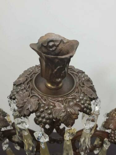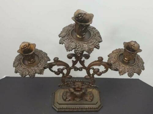 ANTIQUE BRONZE THREE ARM CANDLELABRA BLAKES PATENT, 19TH CENTURY Available for your consideration is this lovely three arm candelabra by Blake. Circa 19th century. This beautiful candelabra is either cast brass or bronze. It is decorated with leaf shaped holders and grape leaf and fruit bobeches. Each bobeche has x prisms. Marked "BLAKES PATENT" on the lower back side. The candelabra measures approx. 16 1/2" tall and 14 3/4" wide. Base measures approx. 8" wide and 4" deep. In very good antique condition. Bronze has been orange oiled. No chips, cracks, breaks or repairs found. Shed find, prisms may need a better cleaning. The pictures are an important part of this listing. Please use them as a condition aid. If you require additional photos or have questions please email before bidding. Thank you for looking. ATTENTION INTERNATIONAL BUYERS: Please understand that all international shipments will be shipped with full value declared. We will not falsify customs documents for any reason. It is illegal. I sell Vintage and Antique items therefore it is not always possible to include all scratches, imperfections etc. *COLORS ARE OUR BEST JUDGEMENT, SO PLEASE SEE PICTURES Please be aware my photos are considered part of the listing description and the description is based on my own knowledge, experience, and research. Statements regarding maker, age, origin, etc. particularly on unmarked pieces, should be evaluated and confirmed by you the buyer, as you are the final judge. Please ask questions that will help you in these evaluations. I also encourage and gladly accept opinions from knowledgeable buyers which only helps to make me a better seller and serve you better. Descriptions are as inclusive as possible but i f I miss something that is important to you please email me prior to bidding. I am always willing to combine shipping when practical. CT residents must add 6.35% sales tax. See my other listings for more great items! We accept PayPal and certified checks only. Shipping is generally the day following the receipt of payment via USPS or FedEx. If you have a preferred shipper please let me know. txzj pxzj24187 txzj-11 txzj85 txzj115