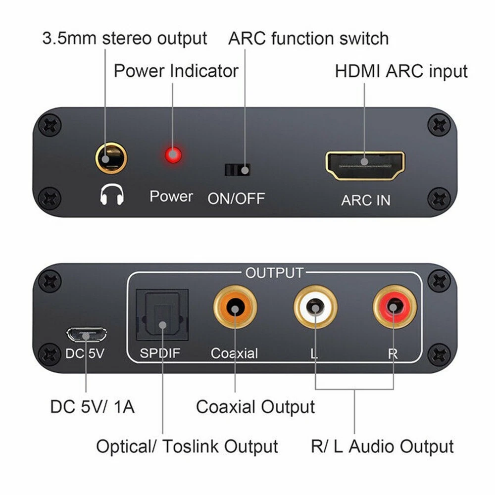 Features: Support SPDIF output. Supports coaxial output. Support RCA stereo output. Support 3.5mm stereo headphone port output. 3.5mm stereo headphone port equipped with high-performance audio amplifier. Support switch noise reduction funtion. Supports no signal automatic mute function. Support transmission 192KHz audio sampling rate. Optical Fiber Coaxial Interface Supports 5.1 Channel Transmission. Specifications: Condition: Brand New Shell material: aluminum alloy Power supply interface: Micro USB Maximum working current: 65mA Power adapter specifications: AC 100V-240V, DC 5V/1A Working environment temperature: -10~55℃ Storage temperature: -20~60℃ Working humidity: 10-90%RH (no condensation) Storage humidity: 5 - 95%RH (no condensation) Product size: 80*58*21mm/3.14*2.28*0.82'' Package includes: 1 x HDMI-compatible ARC Audio Adapter 1 x Micro USB Cable 1 x User Manual