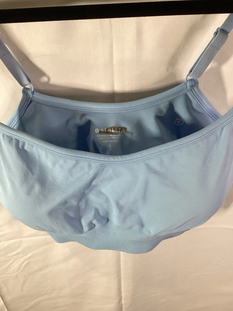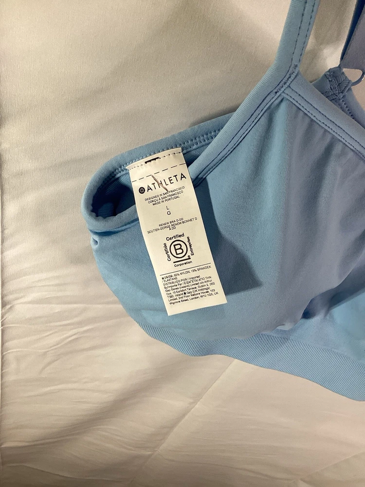 This Athleta sports bra in size L features a solid blue pattern and a pullover closure with racerback strap type. It is made of recycled nylon/spandex material and is machine washable. The bra has a low support level, wireless underwire type, and removable pads. It is perfect for athleisure and yoga activities, with its lightweight and breathable features, as well as anti-microbial and anti-odor properties. The bra is suitable for women and is a regular size type. It is not vintage and was manufactured between 2020-2029. The brand is Athleta and the cup size is D-DD. New without tags, Blue L D-DD, see pictures for more details.