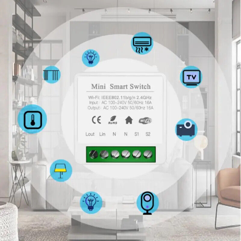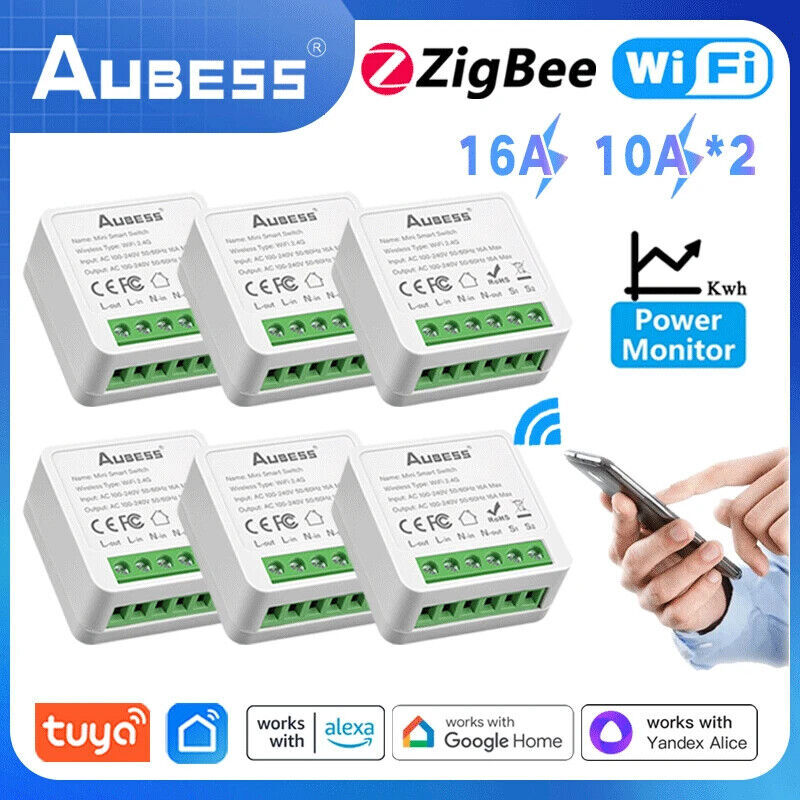 AUBESS WiFi Switch Tuya Smart Home Gadgets Automation MINI DIY 2-Gang 2-Way Switch Relay Module Alexa Alice Google Assistant Description: 1. Refit non-smart appliances or equipment into smart devices. Such as refitting a desk lamp into a smart desk lamp, and mobile phone can control the switch of the light. To turn the downlight into a smart downlight, you only need to connect a smart switch module to the switch, and then Alexa/Google assistant can control the light switch. 2. Mobile APP control. Control the device's power on and off, timing, countdown and other functions through the mobile phone. As long as the mobile phone has a network, the switch module at home can be controlled globally. 3. Voice control. Support voice assistants such as Tmall Genie, Alexa, Google Home, and realize functions such as switches; "Alexa, turn on the kitchen lights." You can turn on the lights in one sentence and enjoy a convenient smart life. 4. Timing. You can control the switch, timing, countdown and other functions of the device through your mobile phone. This can be ordered: turn off the lights in the living room after 2 hours. 18:15 Turn off the oven. Turn on the boiler at 21:00. You can also time the device when you are not at home. (APP: Smart Life/TUYA Smart) 5. Group control. The lights can be grouped to achieve unified control (simultaneous switching, timing, etc.); 6. The Internet of Everything. Through settings, it can be linked with other smart scenes to make life smarter; for example, set the home scene: automatically turn on the living room lights, TV, and air conditioner. 7. Sharing and security. The main account can be shared with other family members, and the functions and settings are completely retained and copied; security: once the main account adds a light, the light will be and other users can no longer find and add; it needs to be actively shared before others can use it it. 8. Bluetooth fast matching. Turn on Bluetooth, the phone will quickly find the device, speed up the connection, and stabilize the connection. 9.State memory. Resume the power after the power failure, without worrying about the change of the equipment state, and maintain the state before the power failure. It was in the open state before the power was cut off, and the open state is automatically restored when the power is turned on again. (Can be set to open, close, power off memory mode) 10. Three wiring methods.(2-way/1-way/non switch) Can be directly connected to the device without connecting a switch. It can also be connected behind the switch to support single control switch and dual control switch. It can be directly installed in the switch box to the switch module. It can also be installed on the dual-control switch without affecting the use of the dual-control switch. 11.WiFi connection, no gateway required. DIY, the connection method is simple, everyone can DIY the device and turn the non-smart device into a smart device. Specifications: Color:white Output:AC 100-240V 50/60Hz Input:AC 100-240V 50/60Hz Wi-Fi:IEEE 802.11b/g/n Material:PCV-0 Certified product:CE ROHS Maximum current:16A Package Included: 1*mini smart switch module,1*Manual