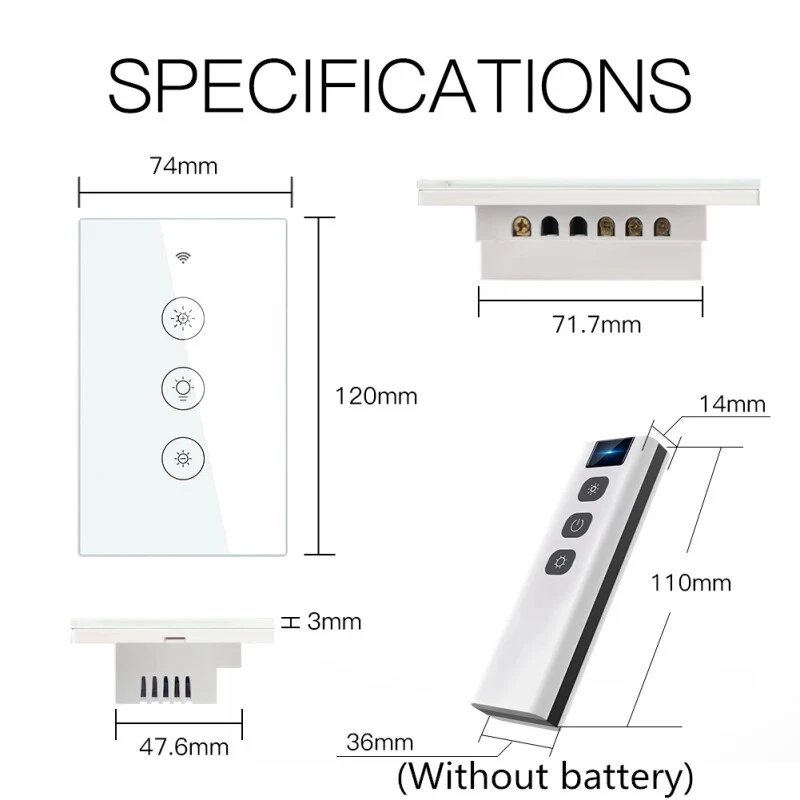 AUBESS Tuya Wifi Smart Wall Touch Sensor Switch LED Light Dimmer Switch Smart Life APP Remote Control Support Alexa Google Home Description: 100% Brand New and High Quality! The remote control does not contain batteries, you need to buy LR23A 12V batteries by yourself 2020 New Arrival Upgraded with More Personalized Points: Update1:Multi-control in a much easier way Update2:New pairing mode with WiFi Bluetooth Update3:Backlight ON/OFF optional Update4:Relay status adjustable when power off Update5:RF frequency built-in for RF remote control Main Features: 1.2/3-way multi-control association to control 1 light with multiple dimmer switches; anti-scratch tempered glass panel suits any home decor and allows for effortless touch control; you can multi-control associate this switch to multiple different switches in Smart Life App. 2.Non-interference control mode; allows the switch to be controlled via Smart Life, touch control, voice, and remote with RF433 frequency and 1527 encoding remote switch(not included); each control method works independently; achieve multi-control by associating to other smart switches 3.Compatible with Alexa and Google Home for hands-free voice control with 0%-100% dimmable; can also be controlled via Smart Life/Tuya app anytime, anywhere; setting relay status and remembers last relay status optional when powered off , backlight switch On/Off. 4.Take full control of connected appliances with timers, schedules and countdown (1/5/30 mins, 1 hour, etc.) with the app; share control with family and friends for added convenience 5.Neutral wire is required in your switch boxes to operate correctly; only supports 2.4 GHz network; offers easier pairing via WiFi and Bluetooth connectivity. Specifications: Model : WS-EU-D: WS-US-D Working voltage: 100-250V AC, 50Hz/60Hz Max. total current:1A(EU)/2A(US) Max. Load Power: EU:220W(220V) US:440W(220V)/220W(110V) Wireless type: WIFI2.4G RF433MHz Working temperature:-10℃-45℃ Support system: Android/ios Package Included: 1*smart switch 1*Instruction Notes: The remote control does not contain batteries, you need to buy LR23A 12V batteries by yourself!