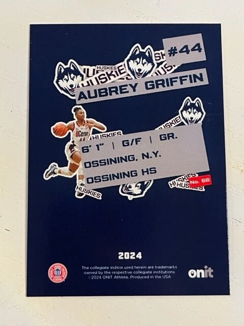AUBREY GRIFFIN 2023-2024 Onit Athlete UConn Women's Basketball set Sticker Series insert HOLO parallel CONDITION: These cards are from boxes opened by me, and they are in the condition that they were in as I pulled them. Please understand that these Onit cards typically have minor imperfections - white corners/edges, print lines, small surface imperfections, etc. *Check out my OTHER AUCTIONS for more Onit cards - I'll have many cards available of various teams* You are bidding on the listing above, from 2023-2024 Onit Athlete UConn Women's Basketball. Make sure to check my other auctions for more Onit cards! Shipping will be $1 via eBay's Standard Shipping service COMBINED SHIPPING: Each additional card is free shipping