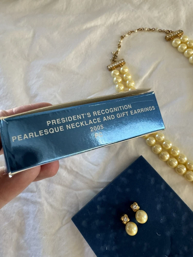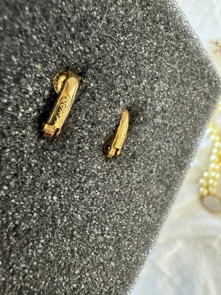 This lovely Avon necklace and earring set from 2005 is the perfect addition to any jewelry collection. The ivory color and pearl design exude elegance and beauty, while the silver metal adds a touch of sophistication. The oval pendant shape and amulet type make for a unique and charming look, and the clip-on earrings ensure comfortable and secure wear. The set is branded by Avon and features a lovely pearl and silver color scheme. It is vintage and has been well-maintained to ensure its longevity. This necklace and earring set is perfect for any occasion, whether it be a formal event or a casual day out. See all photos!!