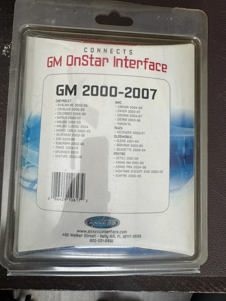 The AXXESS GMOS-01 OnStar Car Interface Kit is designed for General Motors vehicles made between 2000-2007. This kit allows for the integration of aftermarket car audio systems while retaining the factory OnStar system and chime alerts. It provides a seamless connection between the new audio components and the existing vehicle electronics, ensuring a smooth and functional upgrade for the car audio system. Ideal for those looking to enhance their GM vehicle's audio capabilities without losing the convenience of the OnStar feature.
