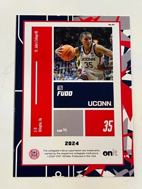 AZZI FUDD 2023-2024 Onit Athlete UConn Women's Basketball set SILVER HOLO parallel CONDITION: These cards are from boxes opened by me, and they are in the condition that they were in as I pulled them. Please understand that these Onit cards typically have minor imperfections - white corners/edges, print lines, small surface imperfections, etc. *Check out my OTHER AUCTIONS for more Onit cards - I'll have many cards available of various teams* You are bidding on the listing above, from 2023-2024 Onit Athlete UConn Women's Basketball. Make sure to check my other auctions for more Onit cards! Shipping will be $1 via eBay's Standard Shipping service COMBINED SHIPPING: Each additional card is free shipping