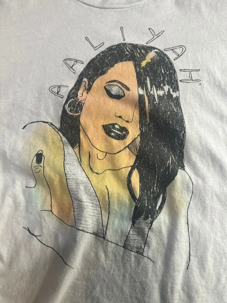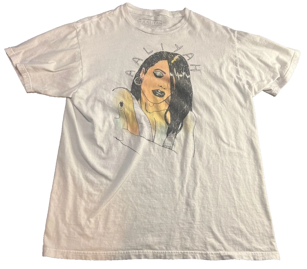 Aaliyah Brand Short Sleeve T Shirt Graphic Size Large Graphic Art Singer Sketch Good used condition, with no rips / tears. Minor wear from use. Please check pictures for full condition / measurements prior to purchasing.