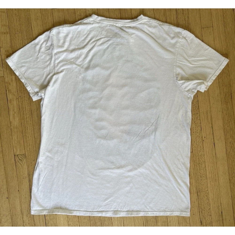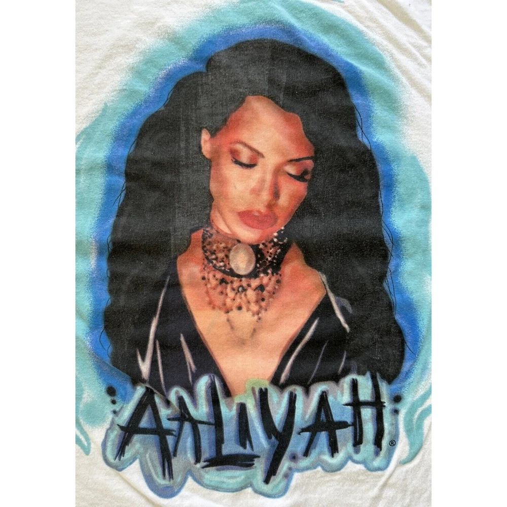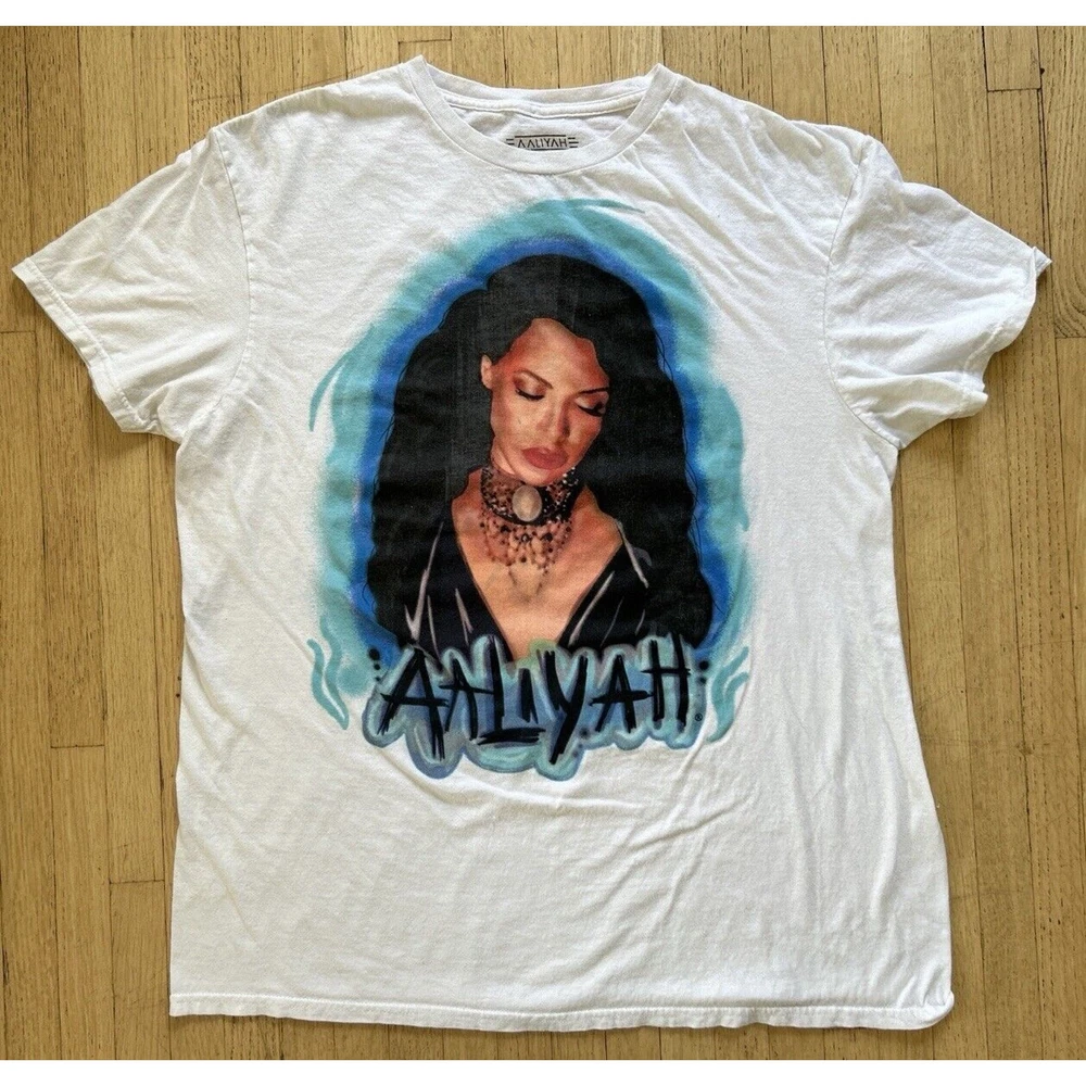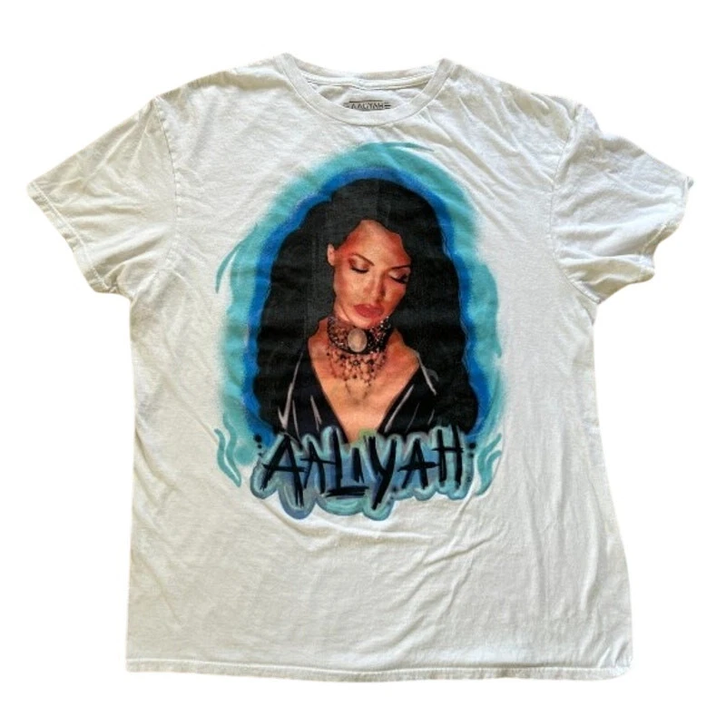 This is an Aaliyah concert t-shirt in size Large, with short sleeves and a crew neckline. It is a pullover made from comfortable cotton knit fabric, which is easy to care for and suitable for all seasons. The white t-shirt is licensed and features a unique airbrush print of Aaliyah, making it a great addition to any music lover's collection. It is a regular fit, collarless tee that can be personalized if desired. This t-shirt was made in Bangladesh and is not handmade. Measurements: • Pit to Pit: 20.5” • Length: 20”