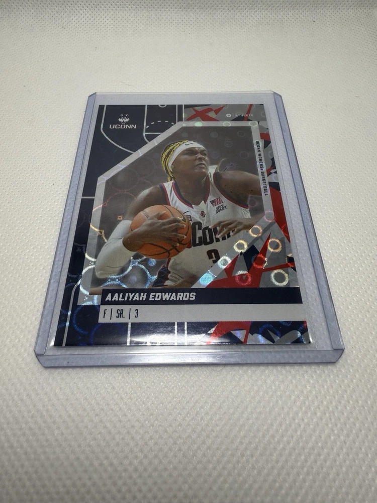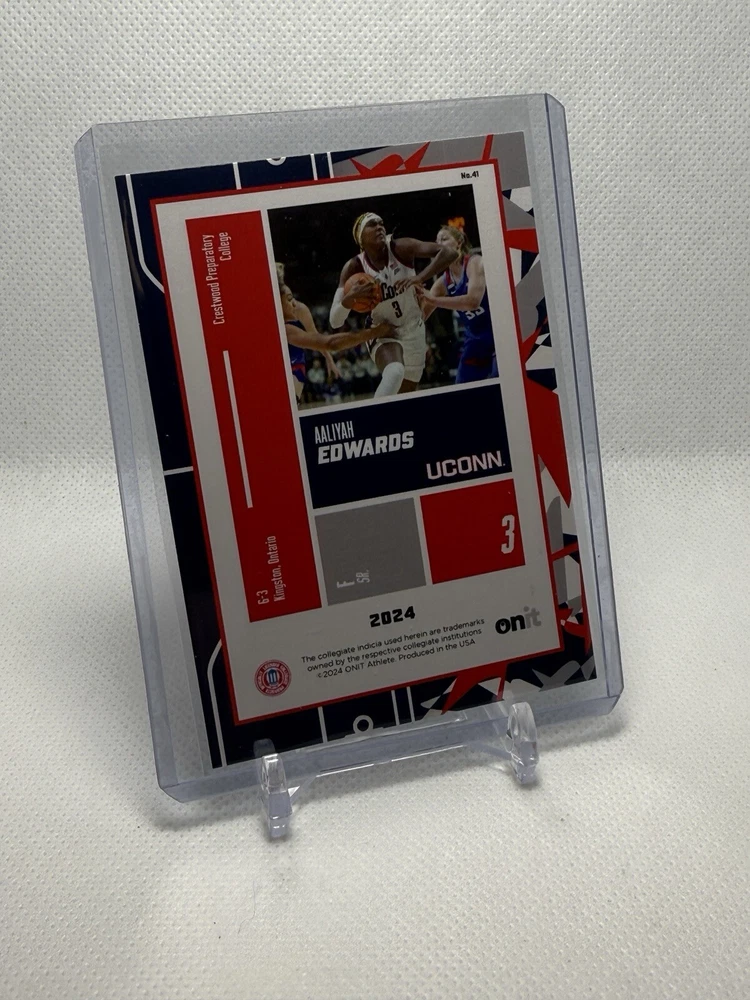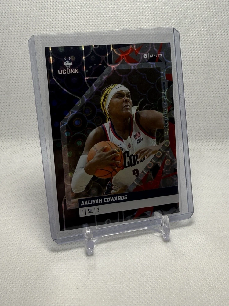 This card is from the manufacturer and was placed in a sleeve and top loader upon opening. The card may have defects and MAY NOT BE RETURNED based on condition. I make no guarantee on any condition or future grade. If you are concerned about condition, please feel free to ask any questions BEFORE BIDDING and I can look closer at the card and send additional pictures if needed. Thanks for looking and good luck! The product is an Aaliyah Edwards 2023-24 ONIT Holo Parallel Silver trading card featuring the UConn Huskies basketball team. This original sports trading card is part of the UConn 2023-24 Women's Basketball set and showcases Aaliyah Edwards, a player for the team. Manufactured in 2023 by ONIT in the United States, this card is a parallel/variety edition with a holo finish, adding a unique touch to a collector's item for fans of NCAA basketball and the UConn Huskies.