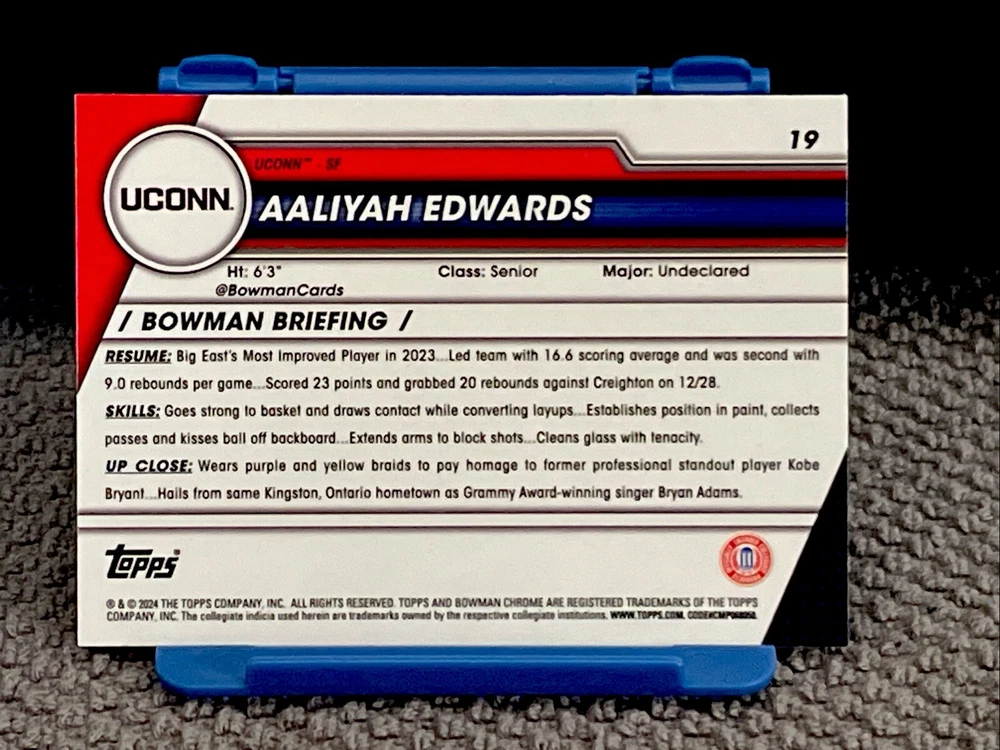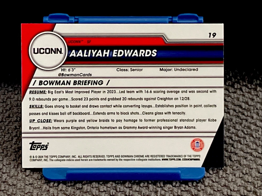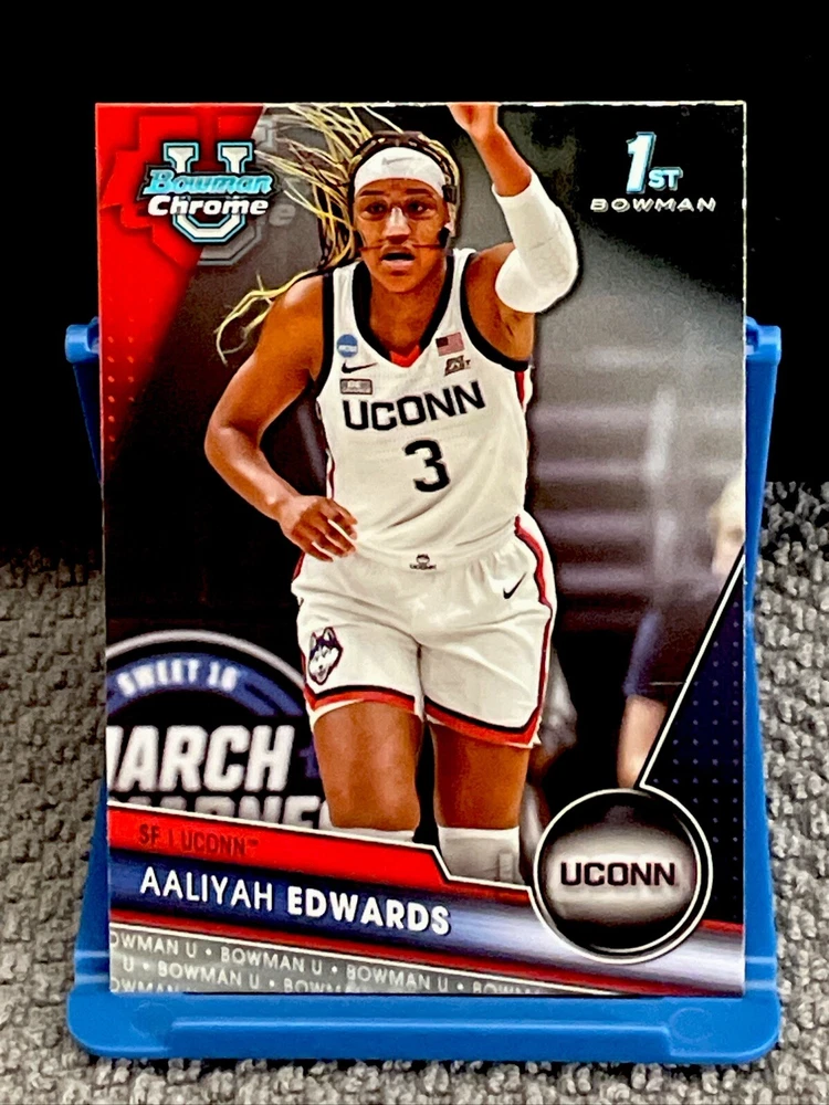 This rare 2024 Bowman University Chrome sports trading card features Aaliyah Edwards, a rising star in the National Collegiate Athletic Association (NCAA) women's basketball world. The card is numbered 19 and is an original, not a licensed reprint. It is made of high-quality card stock and has a standard size. The card is part of the Bowman set and has a parallel/variety feature, making it a unique addition to any collection. It is not autographed or signed by the athlete, but it is sure to be a valuable item for any UConn Huskies fan. The card was manufactured in the United States and has the year 2024 on it. It is a must-have for any basketball enthusiast who wants to own a piece of history from the NCAA Women Final Four.