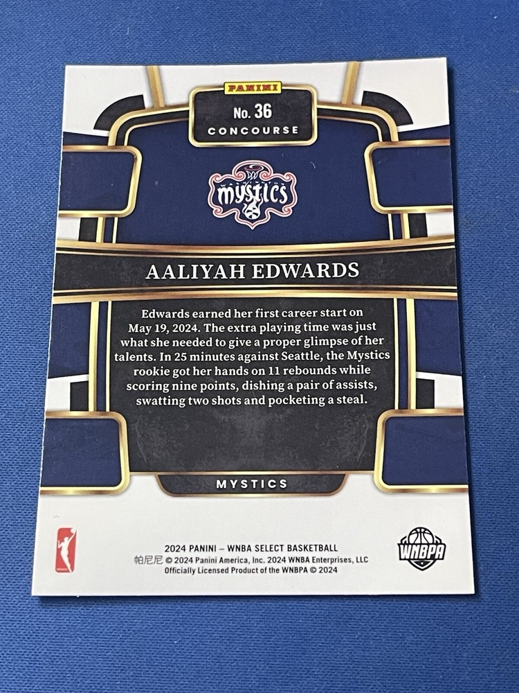 Get your hands on this amazing Aaliyah Edwards 2024 Panini Select WNBA Concourse Level Rookie Card RC #36! This card features the Washington Mystics player in a standard size, printed on high-quality card stock material. It's a must-have for any basketball fan or sports trading card collector. This card is part of the 2024 Panini Select set and features both the base set and rookie designations. It's perfect for anyone who wants to complete their collection or add a valuable piece to their existing one. Don't miss out on this opportunity to own a piece of WNBA history.