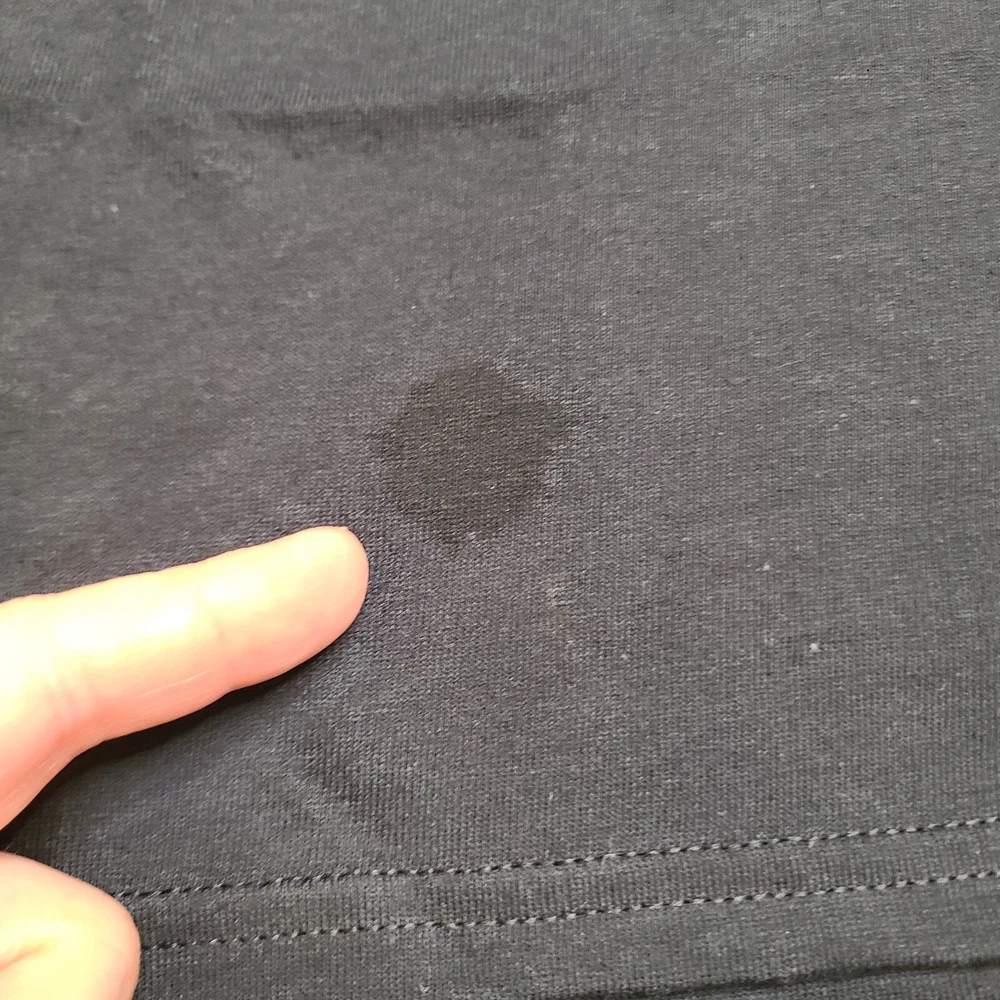 Dark dye spot on tee from dyeing process