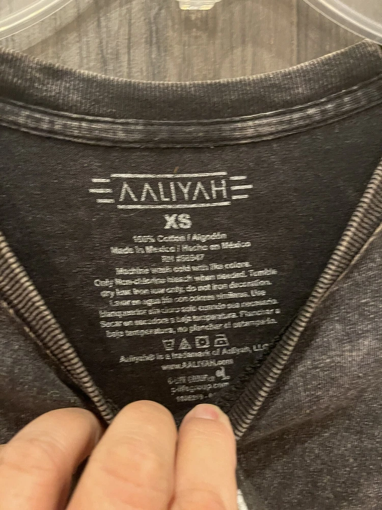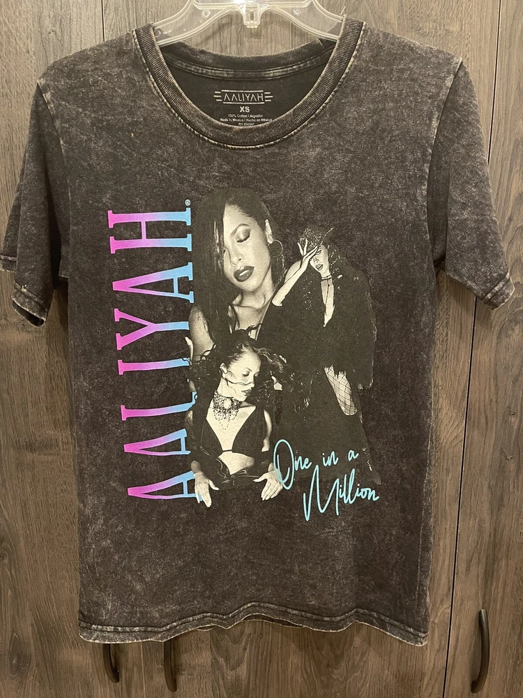 This Aaliyah One In A Million concert retro hip hop t-shirt in black is the perfect addition to any music lover's collection. Made from high-quality cotton and featuring a solid pattern, short sleeves, and a crew neckline, this American Apparel shirt is both stylish and comfortable. The black canvas fabric is adorned with a logo accent, and the graphic print adds to the retro feel of the garment. This unisex t-shirt is a size XS and has a regular fit, making it suitable for a wide range of body types. It's perfect for all seasons and can be worn on its own or layered under a jacket or hoodie. The shirt is not handmade and was manufactured in Thailand.
