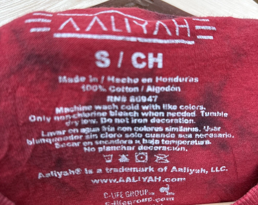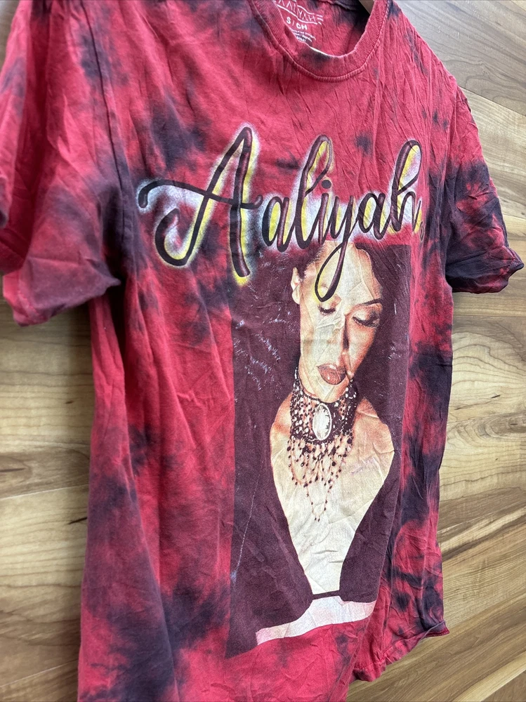 Show off your love for Aaliyah with this stylish red and black tie-dye t-shirt. Perfect for fans of the late 90s girl group and anyone who wants to add a touch of hip hop to their wardrobe. This shirt features a bold graphic of the band's name and tour dates, making it a must-have for collectors. The regular fit ensures comfort and the short sleeves make it perfect for any season. Available in size small, this shirt is a great addition to any streetwear collection.