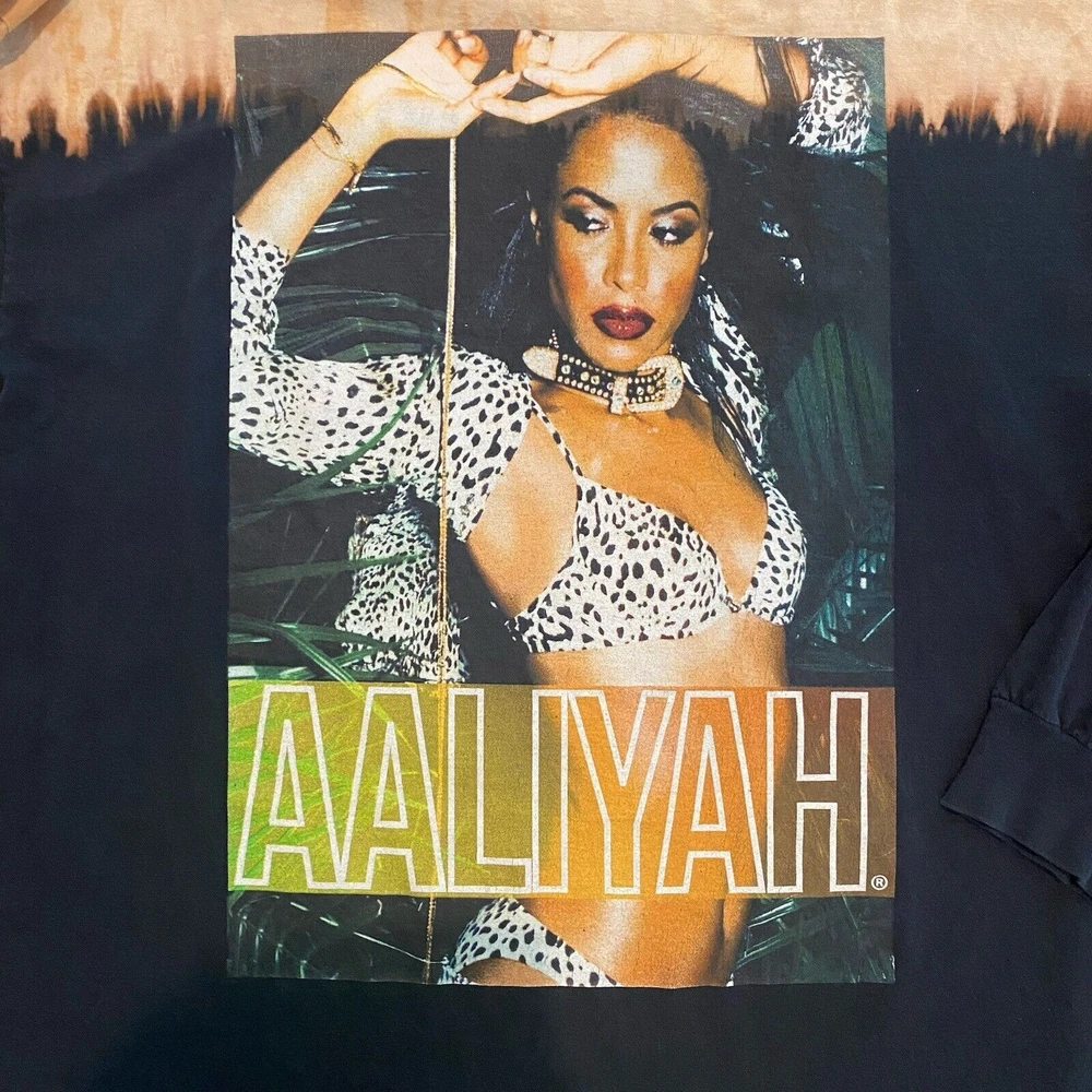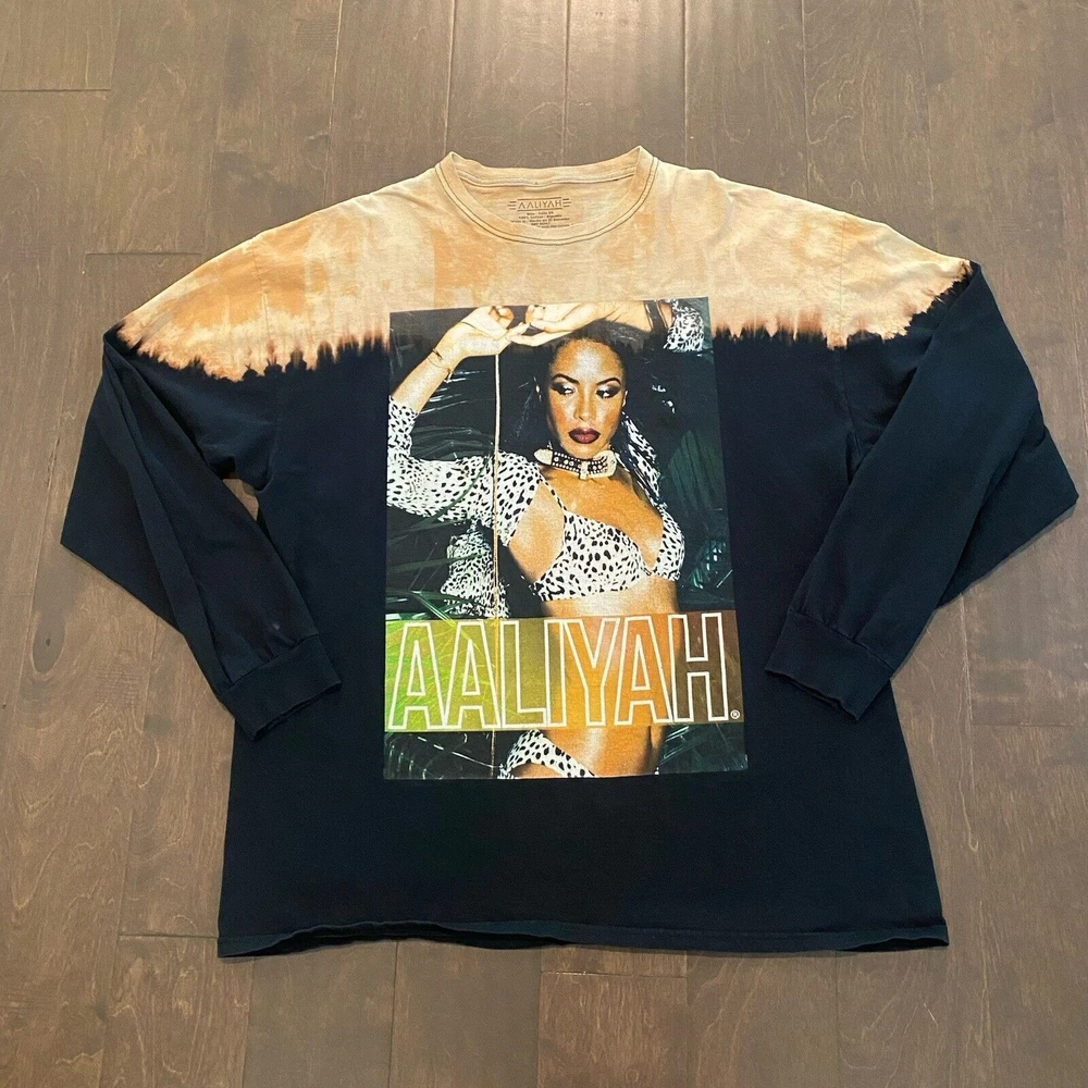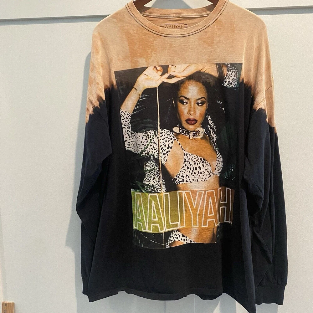 One small bleach stain on lower right sleeve (pictured)—in otherwise good preowned condition Ships next day, experienced seller. Offers welcome. This Aaliyah T-Shirt is a must-have for any fan of 90s hip hop and music in general. The colorful graphic print features the late artist's name and tour dates, making it a great addition to any collection. The long sleeve crew neck tee is made of comfortable cotton material and is machine washable for easy care. It comes in a size 2XL, making it a great unisex fit for adults. The regular fit style is perfect for casual wear and shows off your love for Aaliyah and hip hop.