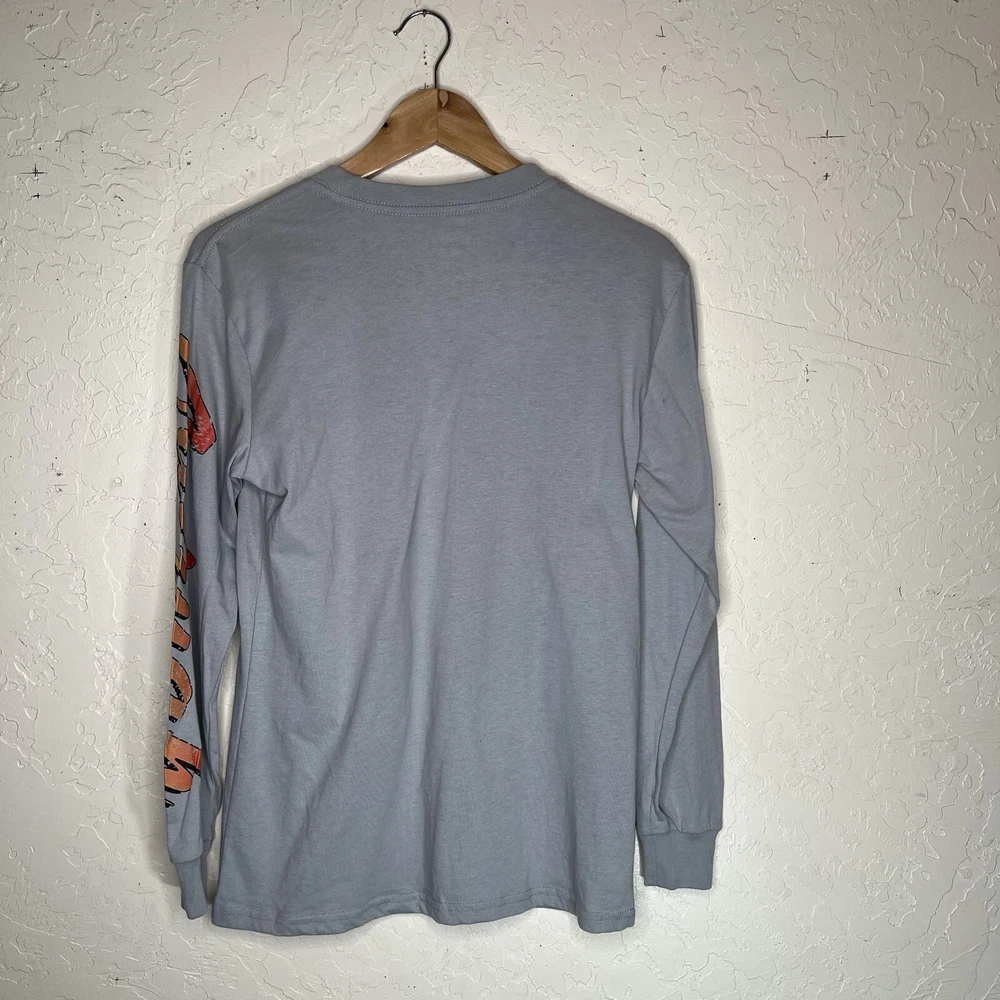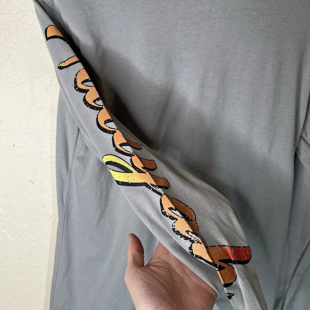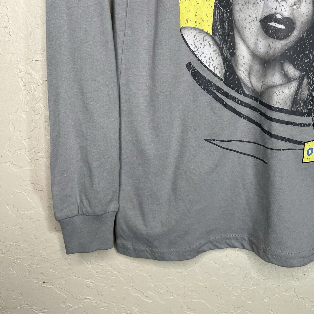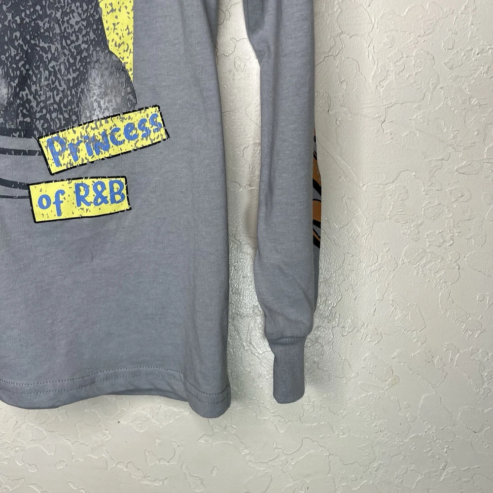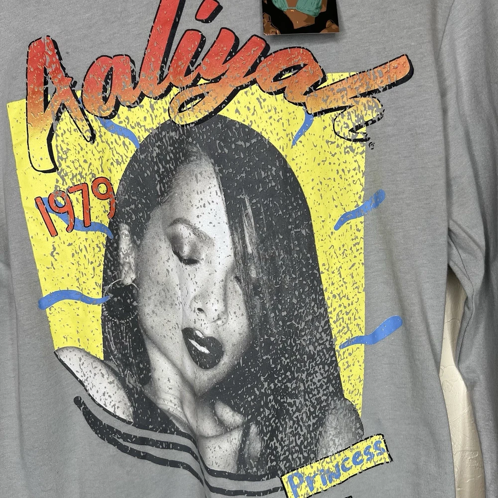 This Aaliyah graphic tee is a gray long sleeve t-shirt featuring a graphic print inspired a classic concert tee. Born in 1979. Made of jersey fabric, the relaxed fit shirt is designed for unisex adults in size Small. The crew neck tee showcases a R&B & pop culture aesthetic, with a theme that nods to music, the 90s, and hip hop. It is perfect for all seasons, offering breathability and easy care for everyday wear. New with tags.