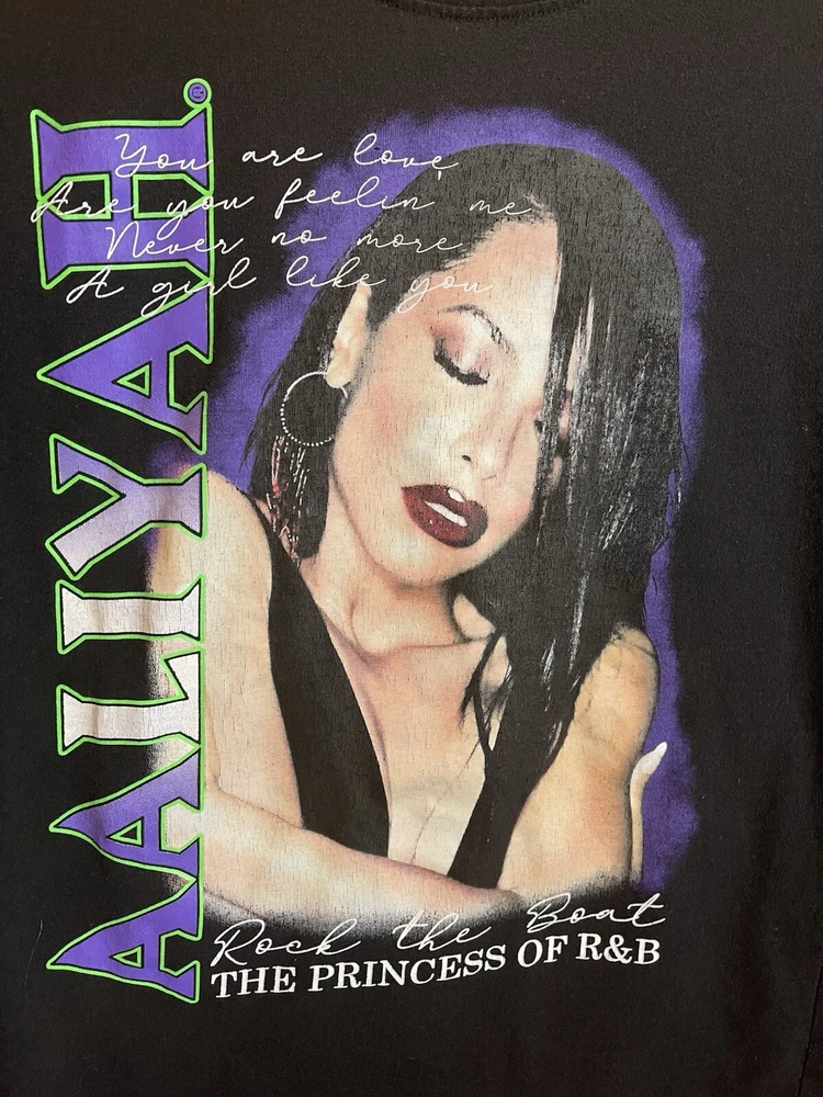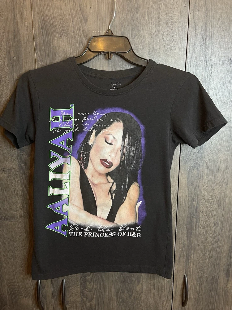 This black T-shirt is a must-have for any fan of Aaliyah, the Princess of R&B. Made with a lightweight and stretchy canvas fabric, this shirt is perfect for all seasons. It features a crew neck and short sleeves, making it a great choice for both casual and formal occasions. The shirt has a regular fit and is available in size small. It features the iconic Aaliyah logo as an accent, making it a stylish addition to any wardrobe. This T-shirt is machine washable and easy to care for. Don't miss out on the chance to own this piece of music history.