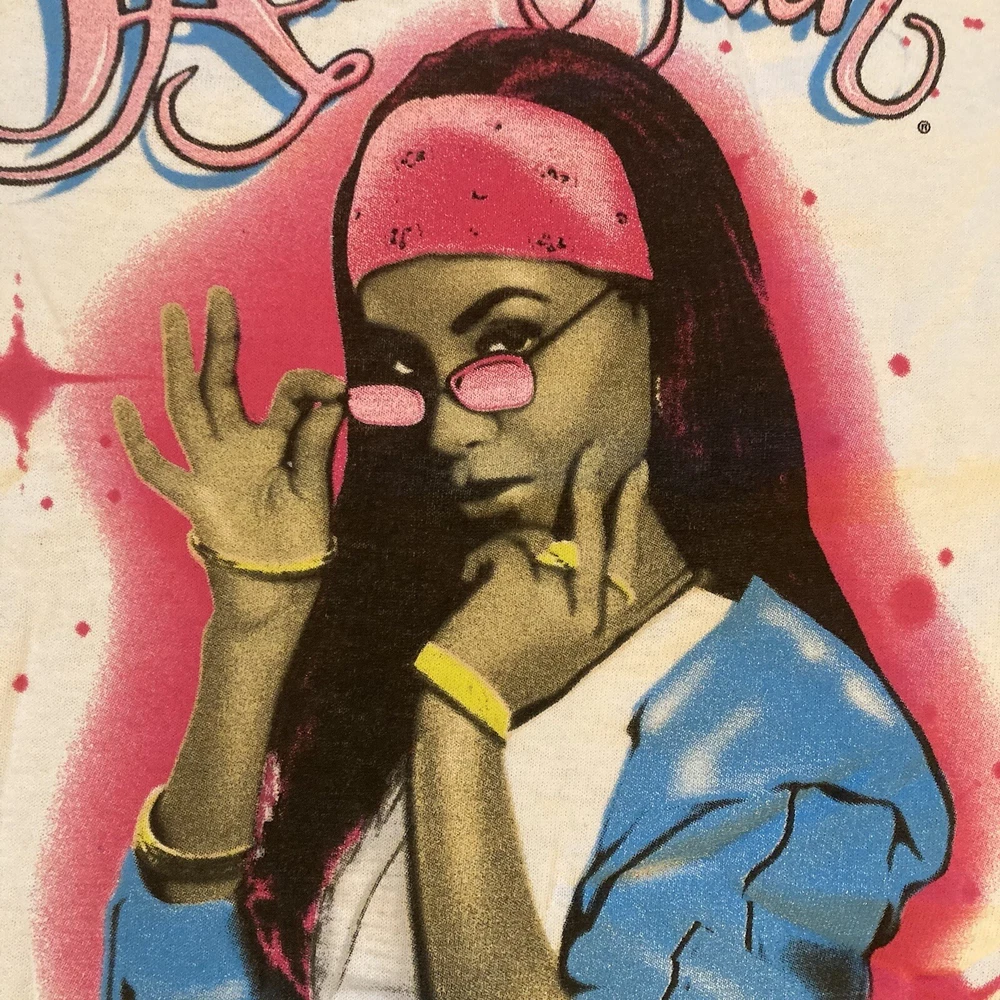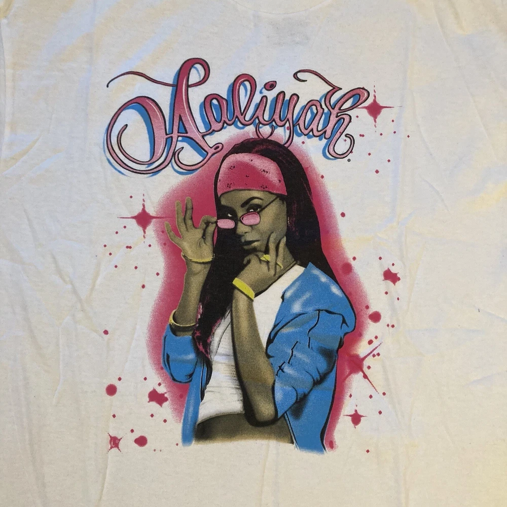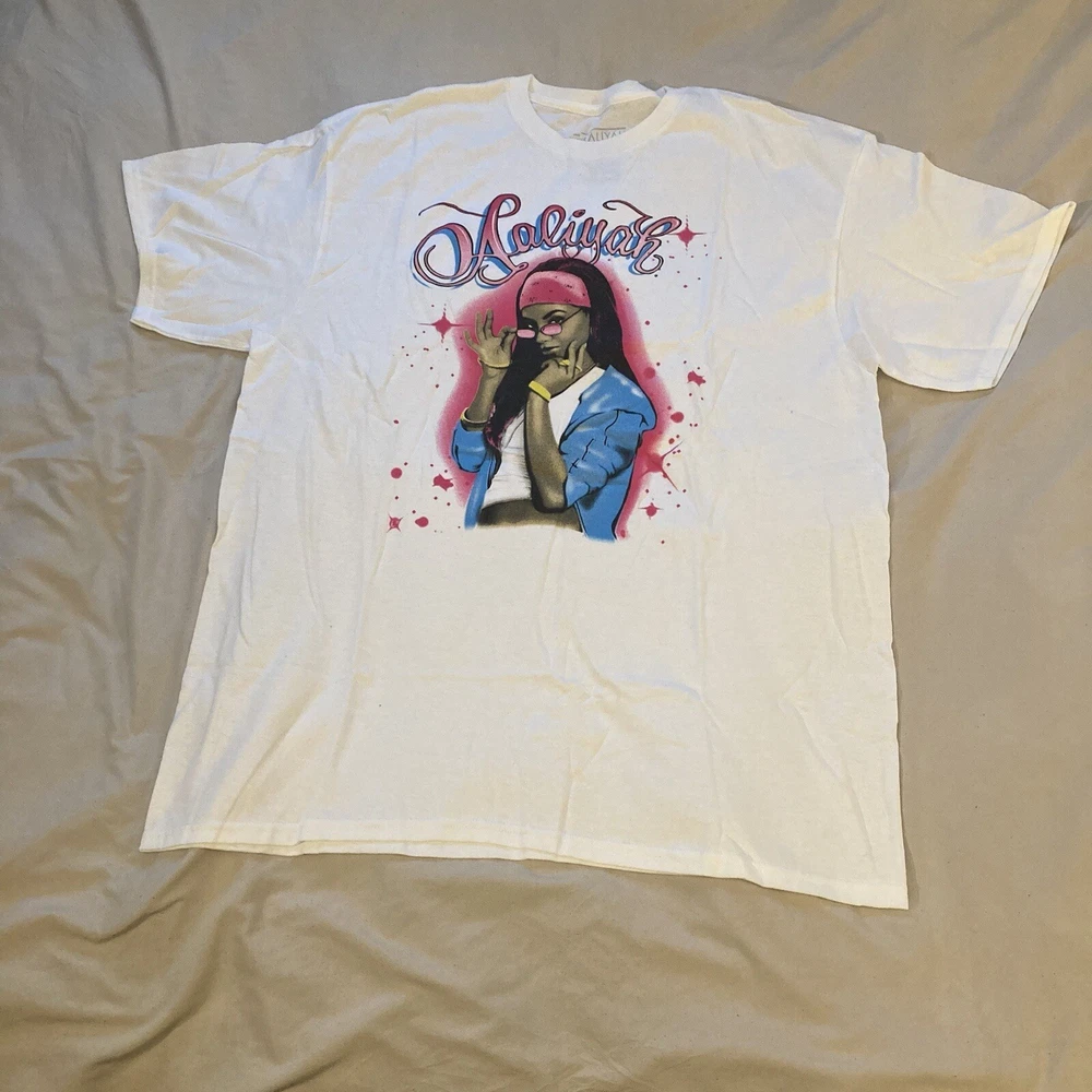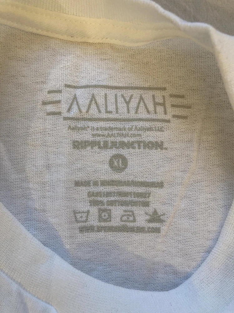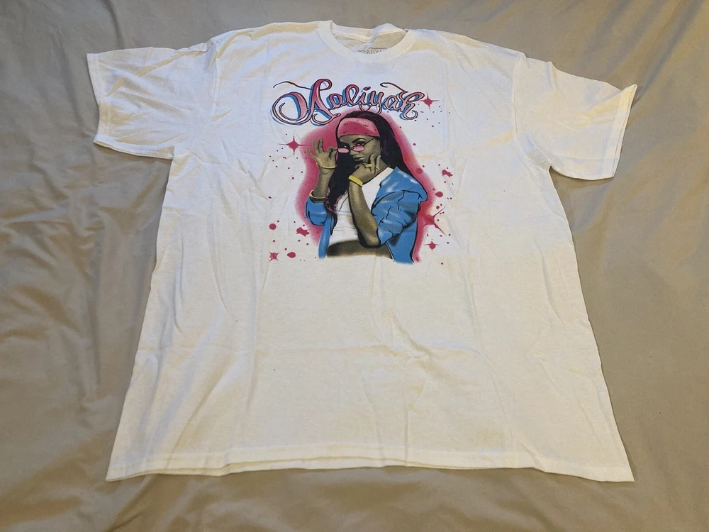 Show off your love for Aaliyah with this XL white t-shirt featuring a bold red spray paint style art graphic. The shirt is made by Ripple Junction and has a regular fit with short sleeves and a crew neckline. It's perfect for men who want to express their style and appreciation for the Princess of R&B. This t-shirt is a great addition to any wardrobe and adds a pop of color with its vibrant graphic design. It's a regular size and type t-shirt made for casual wear. The Aaliyah shirt is perfect for anyone who loves art, music, and fashion. Get your hands on this trendy shirt today!