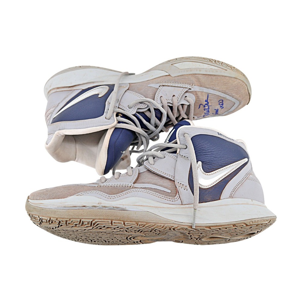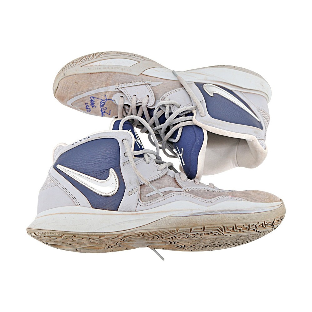 Aaron Boone New York Yankees Autographed Signed 2024 Game Used Pair of Nike Grey/Navy Kyrie Sneakers - Sz 11 (Aaron Boone LOA) Shoes are Size 11 Item includes an Aaron Boone Letter Of Authenticity and a CollectibleXchange QR coded numbered hologram. Authentication can be verified by its numbered hologram at CollectibleXchange.com or by scanning the QR code.
