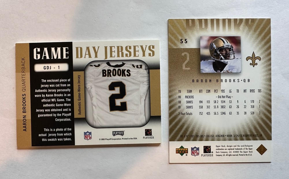 Aaron Brooks - 2002 Upper Deck UD Graded Gold /75 - 2003 Prestige Game Day Jerseys CONDITION: I am not a grader so can't tell you whether it's mint or not. Assume that most cards would be VG or better. Some of the cards may contain print lines, rough edges, ding corners, worse than 90/10 centering, etc . It is important that you look at the pictures as they are taken prior to listing. If you have any questions or see something in the pictures and would like to clarify things, please do not hesitate to contact me. Terms of Sale: In most cases, items will be shipped within 24 hours. I shall make an attempt to notify you of shipping delay when one occurs, All sales are final. No return shall be accepted, Shipping using Ebay Standard Envelope. A Limited Tracking Number will be provided by Ebay. Shipping will be using plain paper envelope and the card will be placed in a toploader. For more secure shipping using padded bubble mailer, please select USPS First Class Mail. Please feel free to contact me with any questions, A reply will be made as soon as possible.