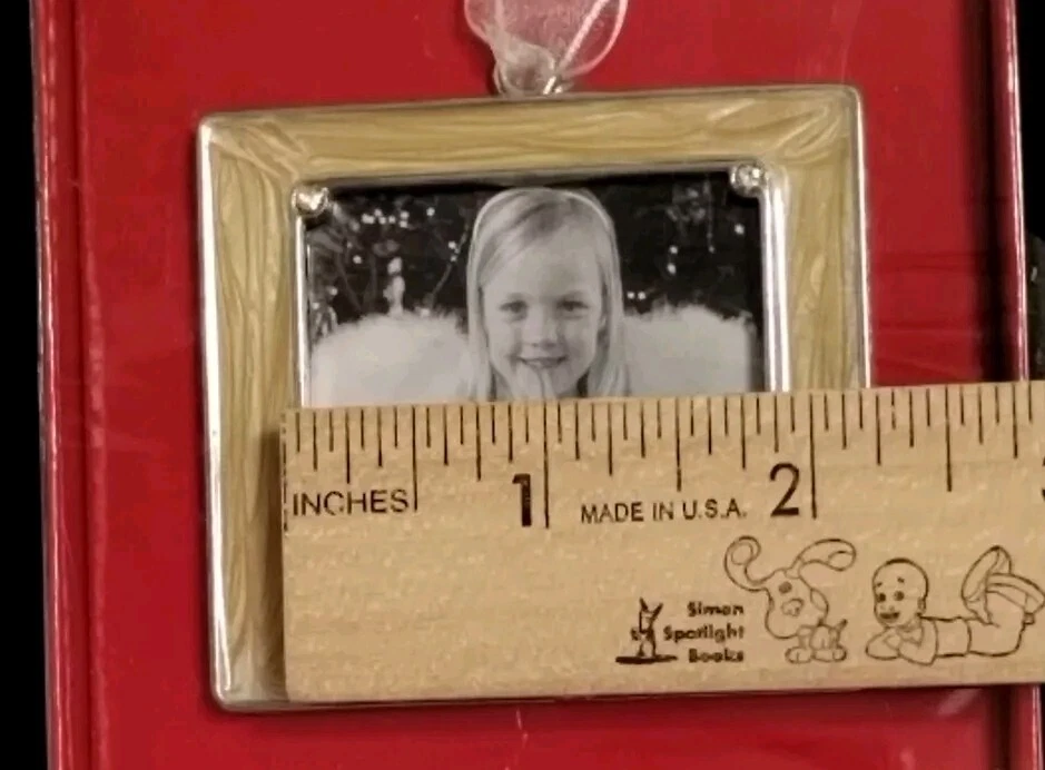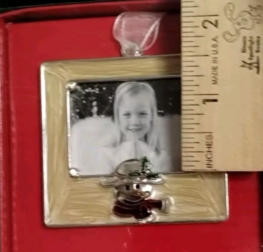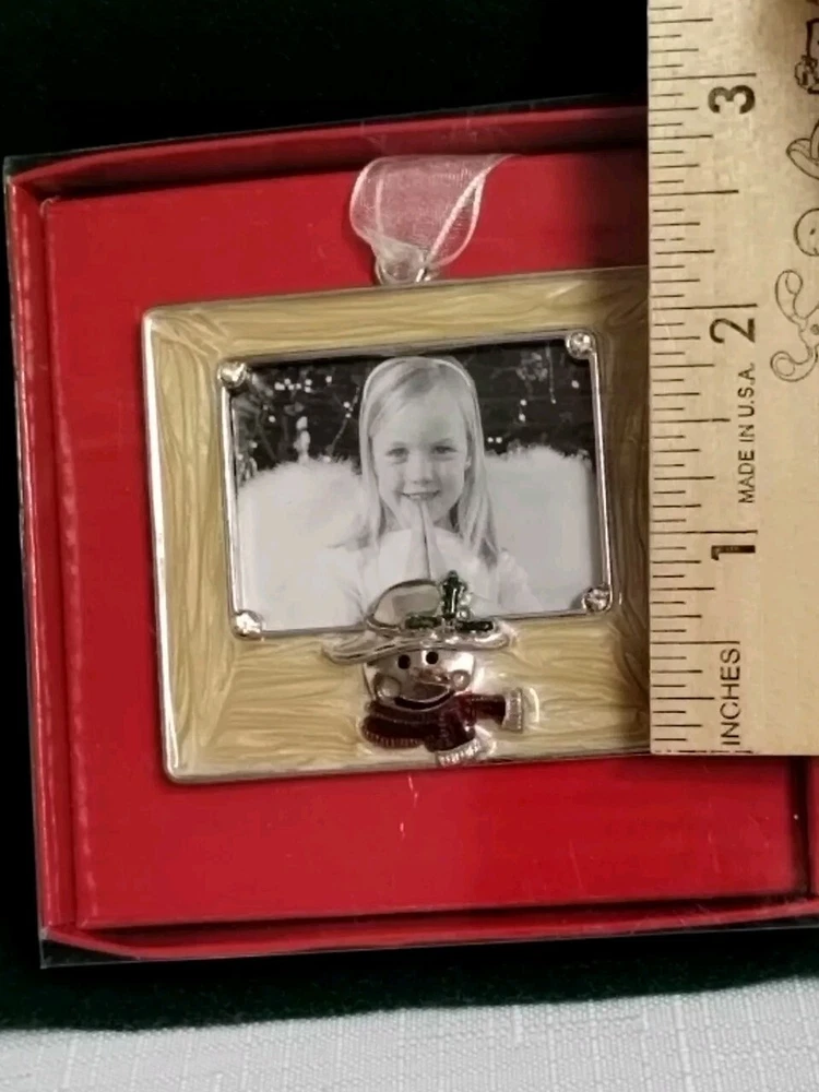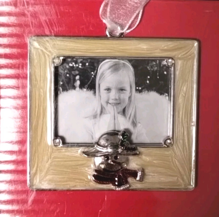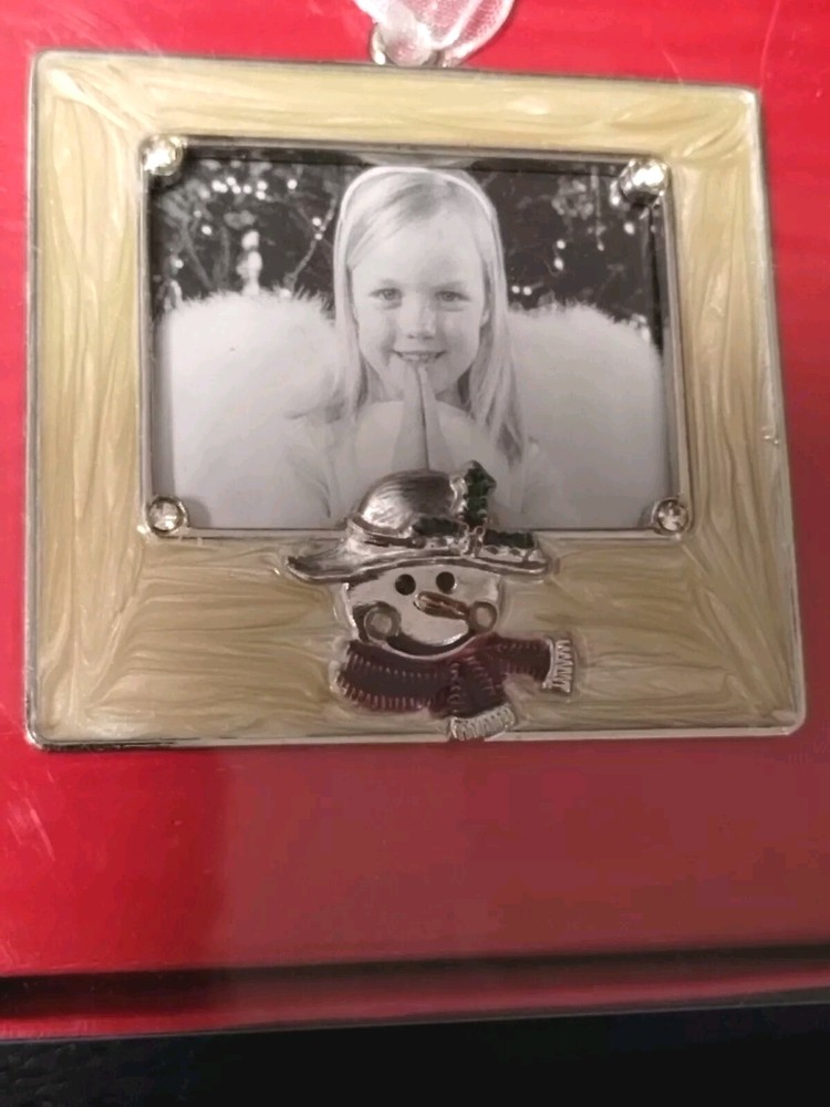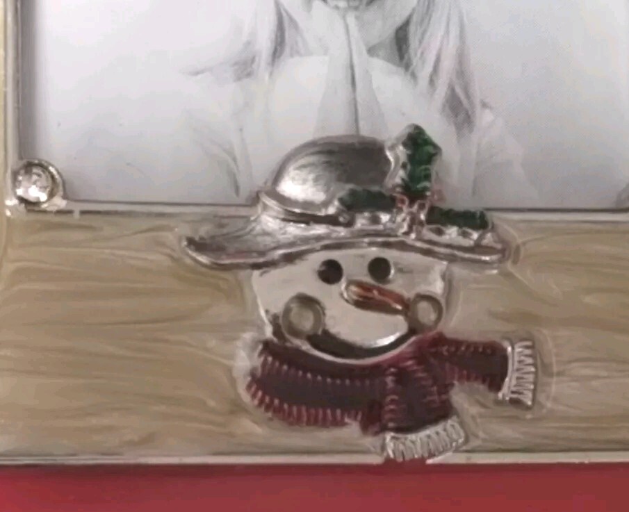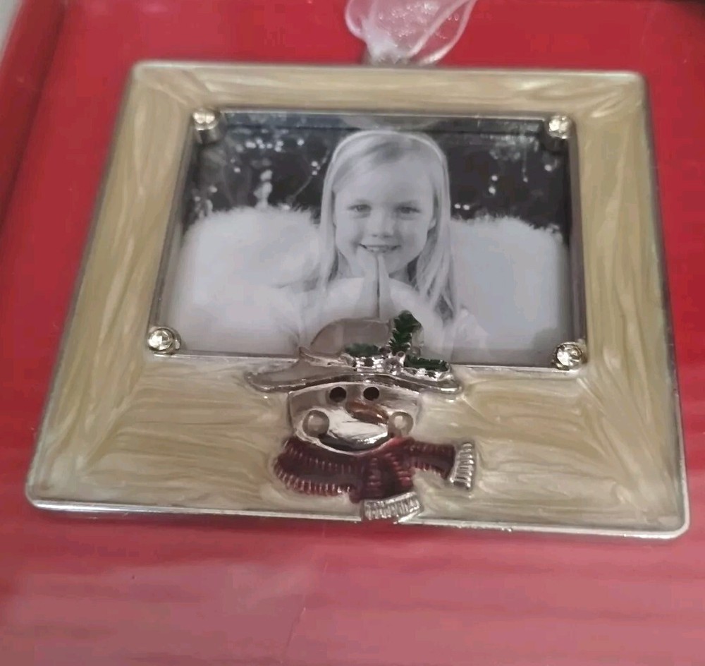 Aaron Brothers Enamel frame in a lovely creamy off white. A cute snowman charm at the bottom of the frame as well as rhinestones accents. Exterior and interior frame measurements in last pictures.