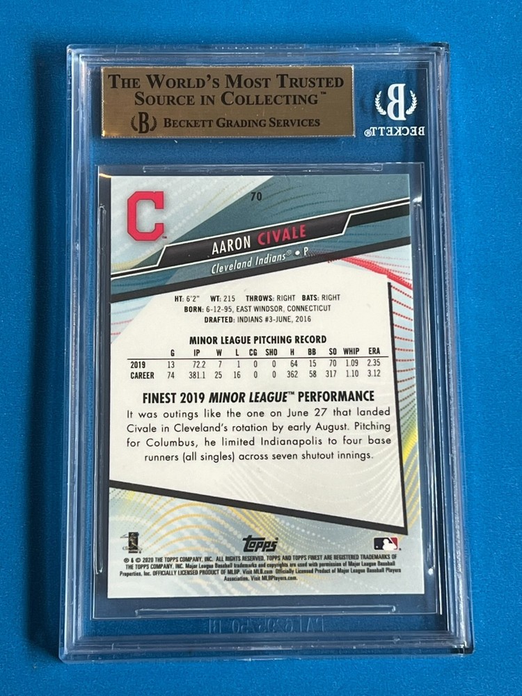 Product: Single Theme: Sport Set: 2020 Topps Finest Card Condition: Mint Series: Topps Finest Player: Aaron Civale Professional Grader: Beckett (BGS) Season: 2020 Sport: Baseball Card Manufacturer: Topps Grade: 9.5 Features: Rookie Team: Cleveland Indians Card Attributes: Rookie League: Major League (MLB) Original/Reprint: Original Type: Sports Trading Card Autographed: No Manufacturer: Topps Year: 2020 Card Number: #70
