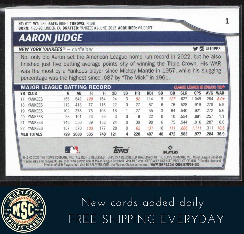 You will receive a Near Mint or Better, Aaron Judge 2023 Topps Big League #1 New York Yankees card Please note, we are not a professional graders and the condition of a raw card is highly subjective. Please refer to the high quality scans of the card included in this auction to determine the condition of the card for yourself. Any questions, please just ask! All cards are in EX - NM+ condition, unless stated otherwise. Chrome cards from various brands might have minor light surface scratches, which is typical with these types of cards. Any major, deep scratches will be noted, if present. Coupons and other discounts will not apply to Accepted Offers. We take pride in the condition of all our cards, including commons. Our promise to you is, we would not sell a card in a condition we would not want to receive ourselves! We are also very proud of our shipping standards, and all cards, including commons will come in a penny sleeve and very well protected! Please check out our other Sports Cards listings, as the more you buy, the buy you save! Be sure to save us as a Seller, as we are always growing, and listing cards daily! Listed with Card Dealer Pro Use the code " MSC " when signing up to Card Dealer Pro to receive 500 FREE Scans!