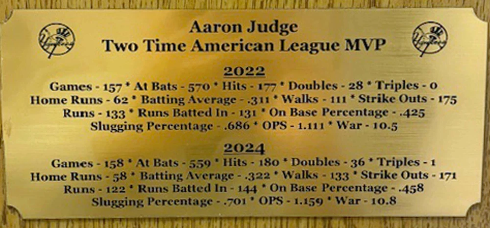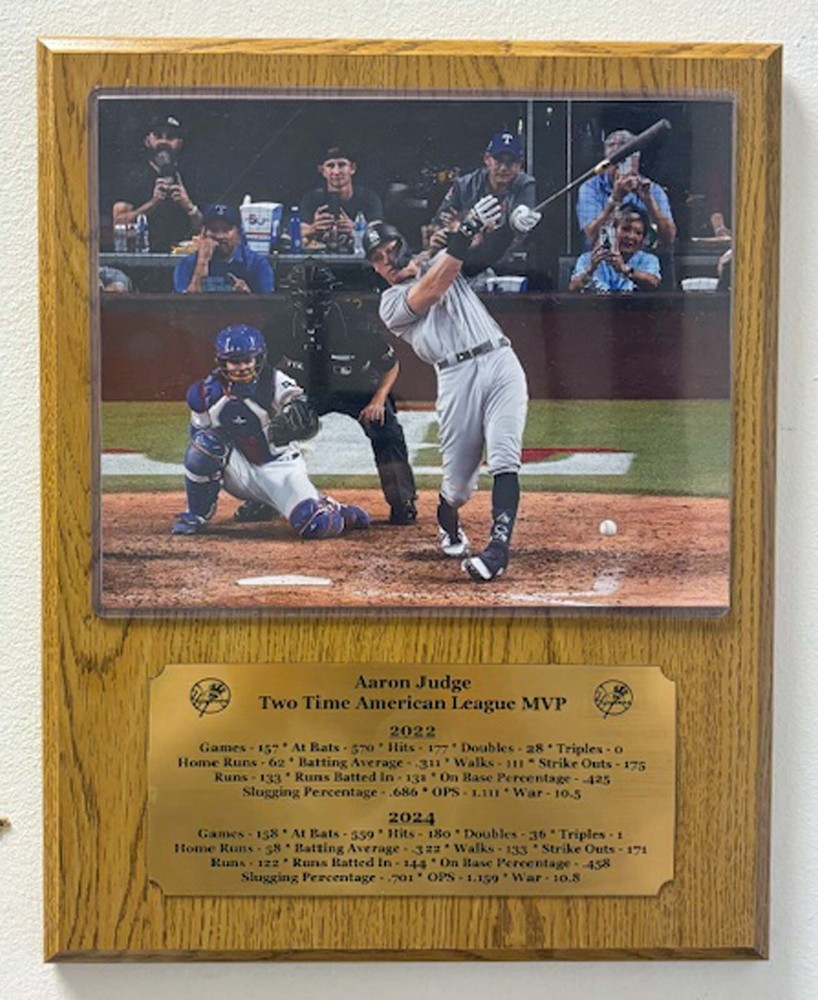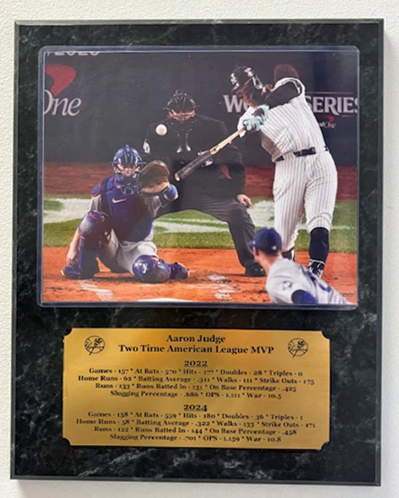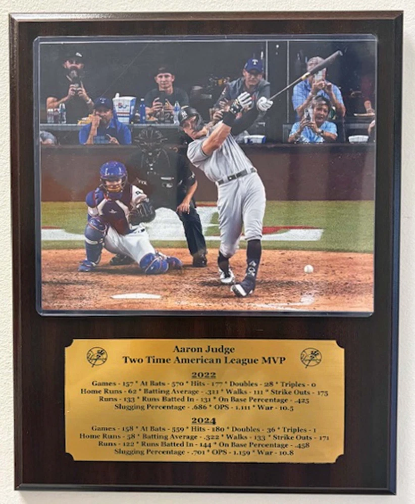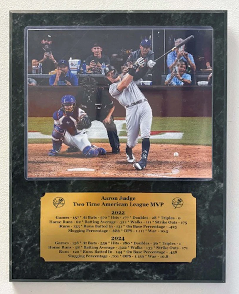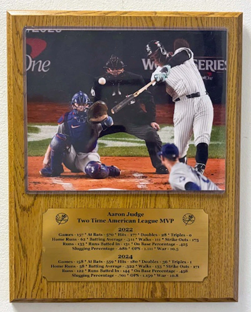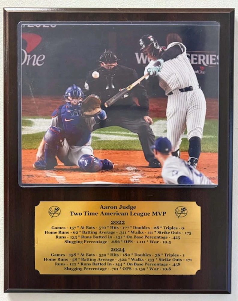 New York Yankees 2 time American League Most Valuable Player Aaron Judge optional 8x10 photo mounted on an optional 12"x15" plaque with an engraved nameplate with the seasons statistics. Plaque is ready for hanging in your home or office. Optional 8x10 photo Option 1 - 2024 World Series Home Run Option 2 - 62 Home Run Optional plaque color Option 1 - Mahogany Option 2 - Oak Option 3 - Black Marble **********FREE SHIPPING*************