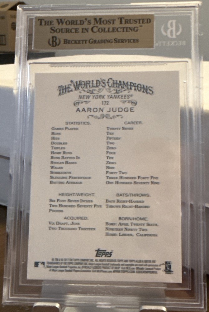 2017 Topps Allen Ginter #172 Aaron Judge RC graded Beckett 9.5 Ships securely USPS Ground Advantage with tracking in bubble mailer