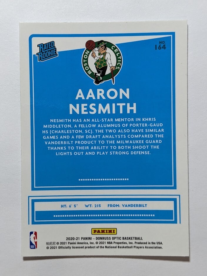 Selling a Aaron Nesmith 2020-21 Donruss Optic Rated Rookie NBA RC Boston Celtics #164 card. Card is shipped via Canada Post (economy/untracked) in sleeve, toploader, and a teambag to ensure protection. For combined shipping, multiple auctions/listings that are purchased will be combined to the cheapest possible price. TRACKED PARCEL SHIPPING AVAILABLE UPON REQUEST FOR (est.) $15 CAD!!!
