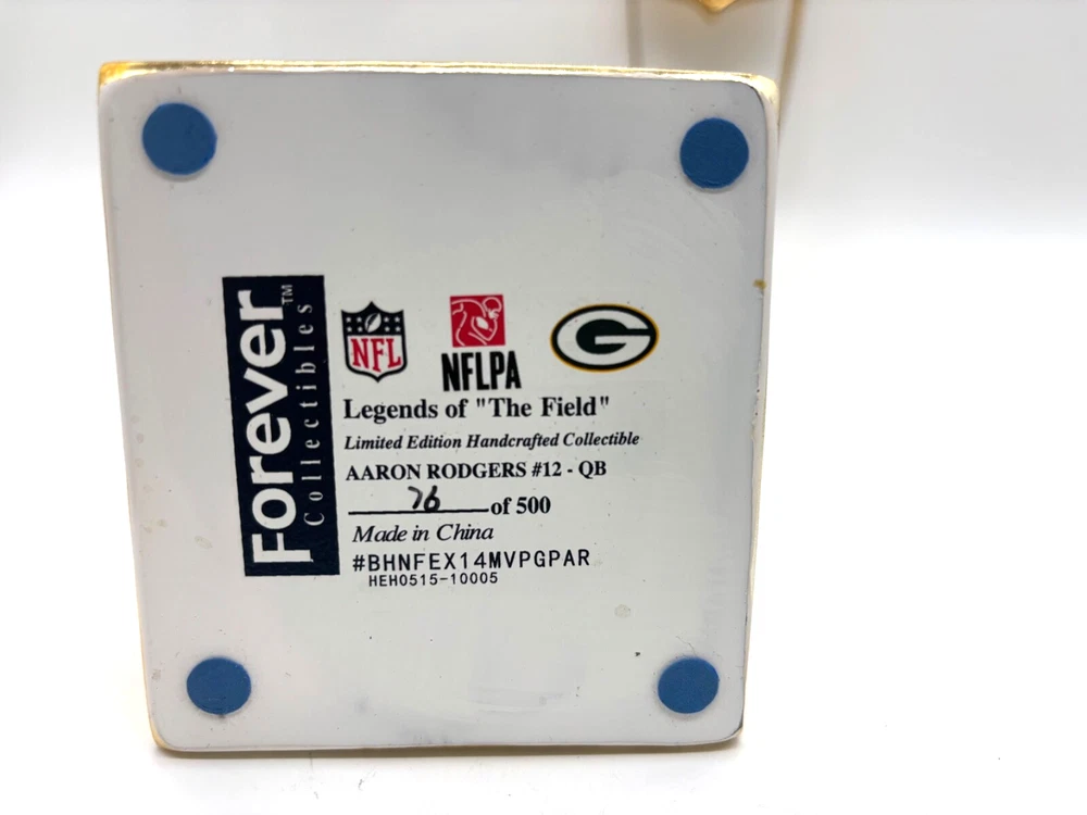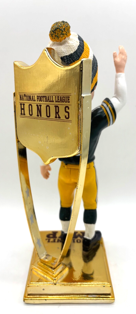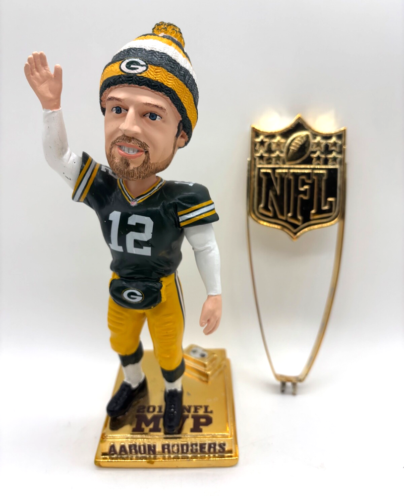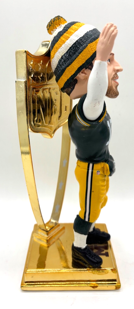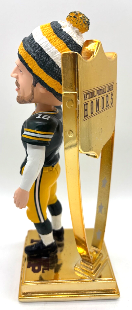 For sale is an awesome bobblehead from 2012 of Green Bay Packers quarterback Aaron Rodgers, celebrating his MVP win by the NFL Honors ceremony. Note the this bobble is out of the box. The heavy gold metal stand will be separated from the bobble, so the bobble isn't damaged by the weight of the metal during shipping. Very good overall condition, with minor staining on the base. Shipping is $12. Thanks.