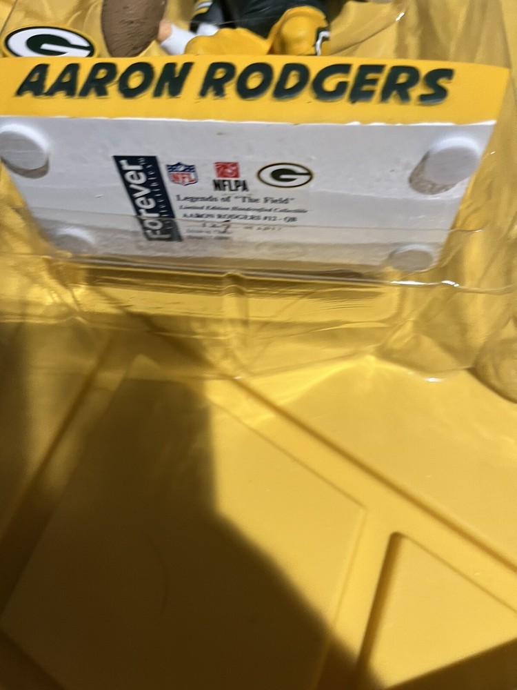 This limited edition Aaron Rodgers Green Bay Packers bobblehead from FOCO is a must-have for any true fan of the National Football League. With vibrant green colors and intricate caricature details, this officially licensed product is the perfect addition to any collection. Whether you're a die-hard Packers supporter or simply a fan of football, this bobblehead is sure to impress. Featuring the iconic quarterback himself, this bobblehead depicts Aaron Rodgers in his signature pose, ready to lead his team to victory. Made with high-quality materials and attention to detail, this product is guaranteed to satisfy even the most discerning collector. Don't miss out on this last chance sale - get your hands on this NIB (new in box) bobblehead today!