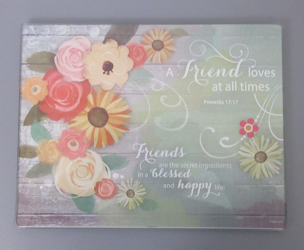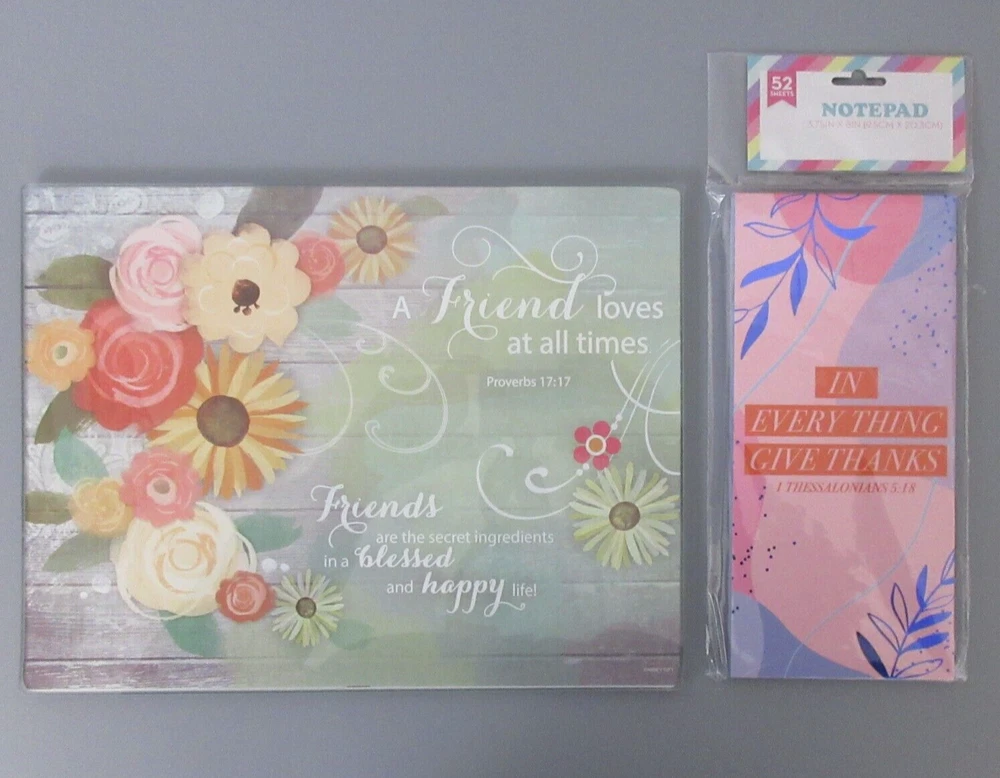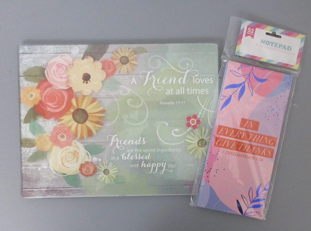 Abbey Press 'A Friend Loves' 11'' x 8.5'' Glass Cutting Board & Notepad 2-Piece Lot Brighten your kitchen surfaces with the heartwarming message and vibrant floral hues of this cutting board. Resilient glass is scratch resistant for food safety. Full graphic text: “A friend loves at all times. Proverbs 17:17. Friends are the secret ingredients in a blessed and happy life.” 11'' x 8.5'' Glass Heat-safe up to 248º F Hand wash NEW with box Glass cutting board friendship gift, 11" x 8.5"; decorator kitchen accent and just the right size for smaller chopping and cutting jobs. Tempered glass, heat resistant up to 248 degrees. Boxed. “A friend loves at all times. Proverbs 17:17...Friends are the secret ingredients in a blessed and happy life!” Included is a 52-sheet notepad “In Everything Give Thanks” 1Thessalonians 5:18. Size 3.75” wide and 8” high.