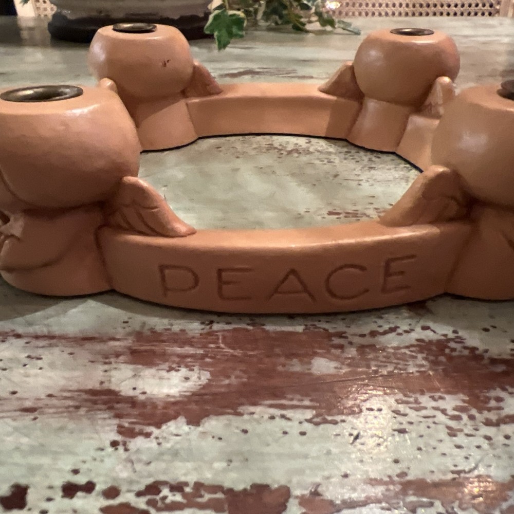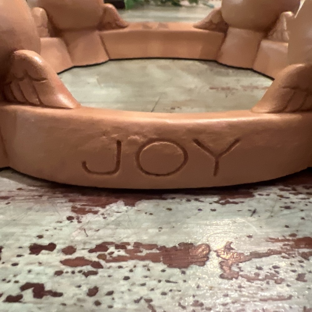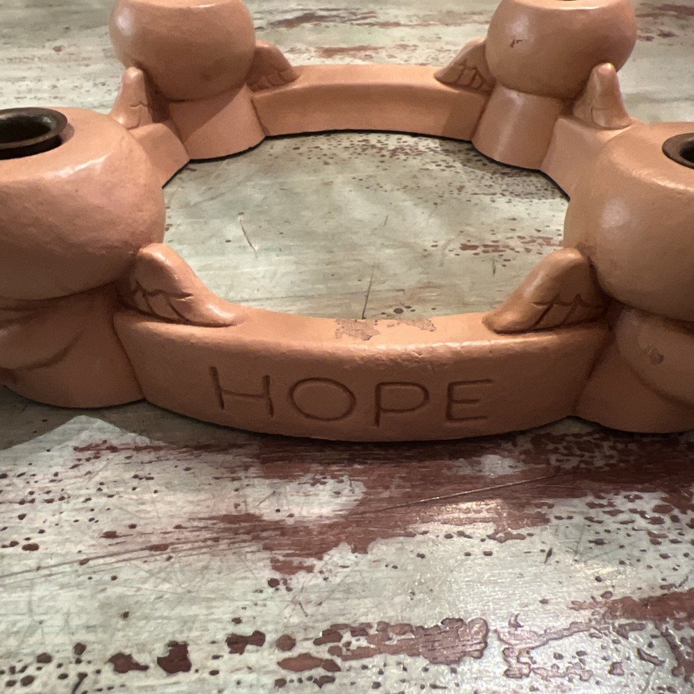 This Abbey Press Advent Candle Holder features angels surrounding a wreath, symbolizing Hope, Love, and Peace. Made of beige resin, it measures 8x8x2 inches and comes in a box. This original Christmas-themed item is designed for holding Advent candles and is perfect for holiday decorating. Box 116