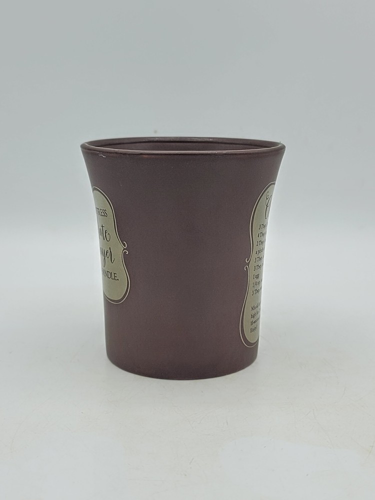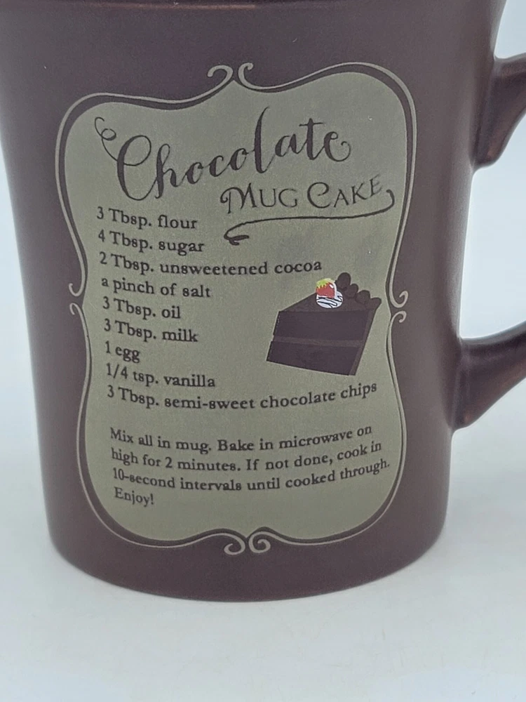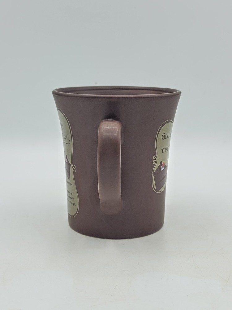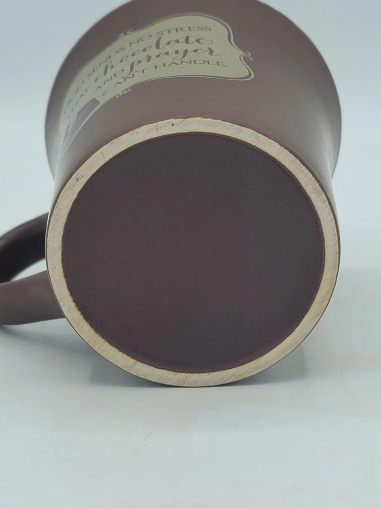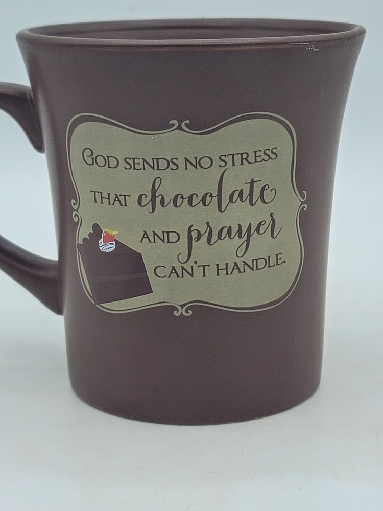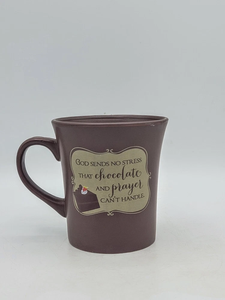 This charming chocolate prayer mug features the uplifting phrase: "God sends no stress that chocolate and prayer can't handle." Perfect for coffee, tea, or hot cocoa lovers, this ceramic mug doubles as a recipe holder for a delicious chocolate mug cake! It includes easy-to-follow instructions right on the side. In very nice condition, the mug has some wear along the rim and light scratching on the inside bottom, along with minor storage marks on the bottom. It's an ideal gift for friends or family who appreciate a little humor and sweetness in their lives. Enjoy your favorite beverages in this delightful mug that also brings a smile to your face!